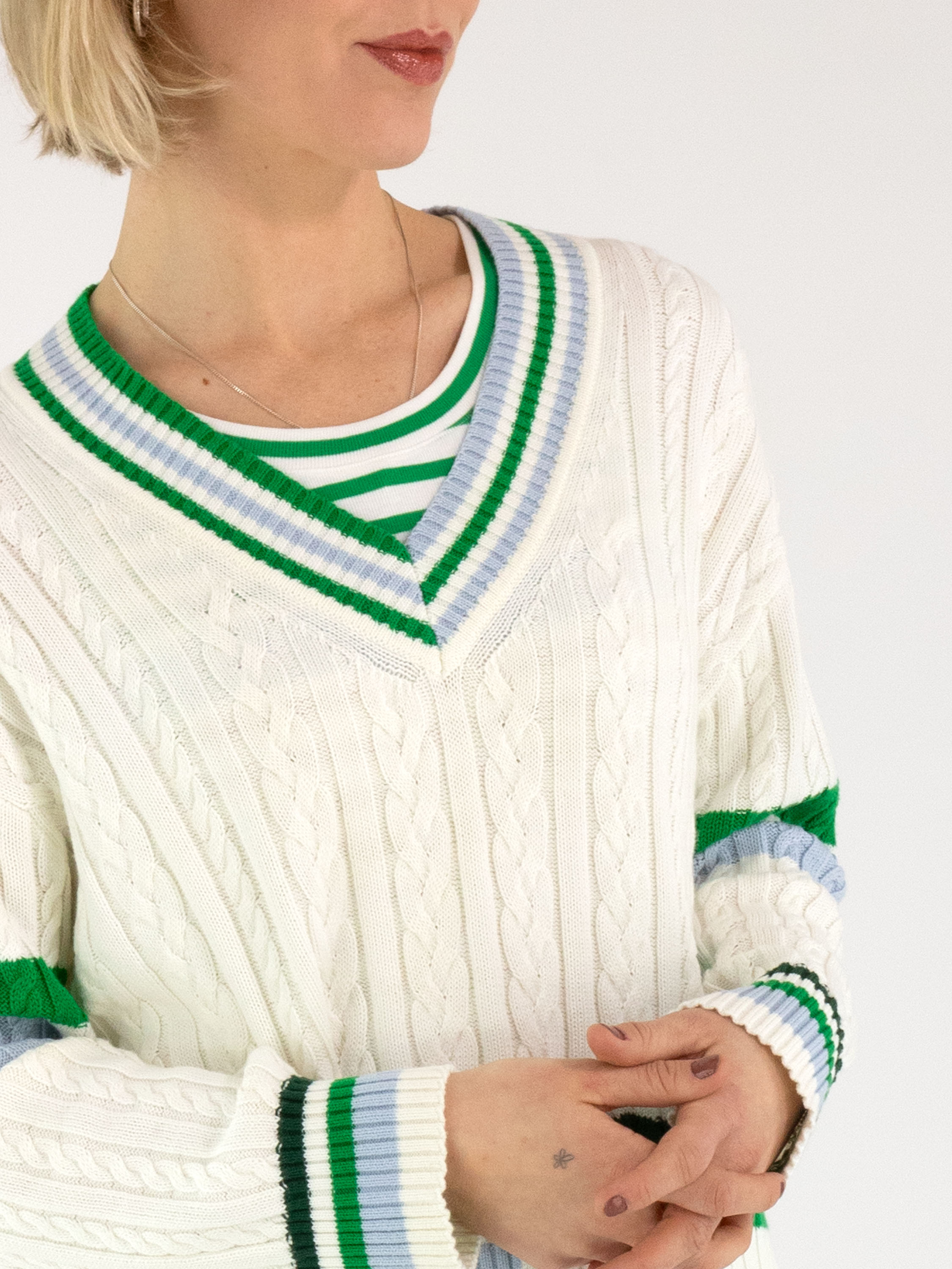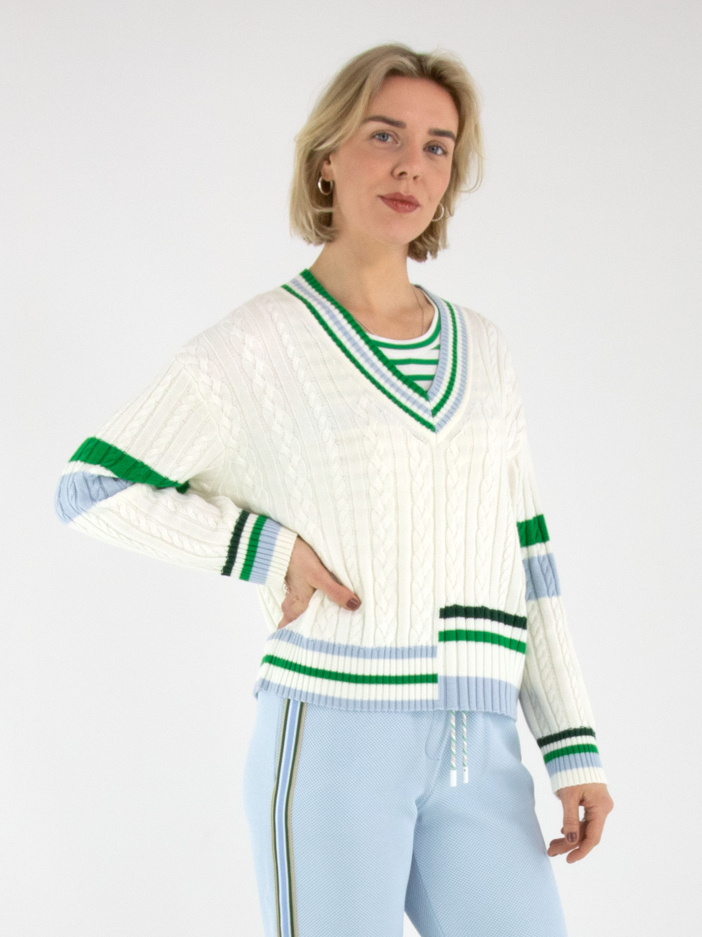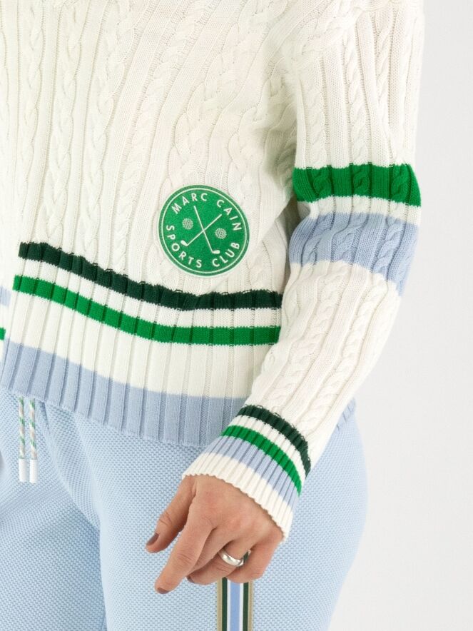 Een kabelpullover van Marc Cain in de kleur roomwit. Langs de rand van de V-hals, de onderkant en aan de uiteinden van de lange mouwen is een geribbelde tricot boord verwerkt met een streeppatroon in de kleuren bleu, heldergroen en donkergroen. Ter hoogte van de bovenarm loopt een streep in bleu en heldergroen. Aan de rechterzijde, ter hoogte van de taille, is een embleem aangebracht met de tekst “Marc Cain Sports Club”. Deze pullover kan op 30 graden worden gewassen.