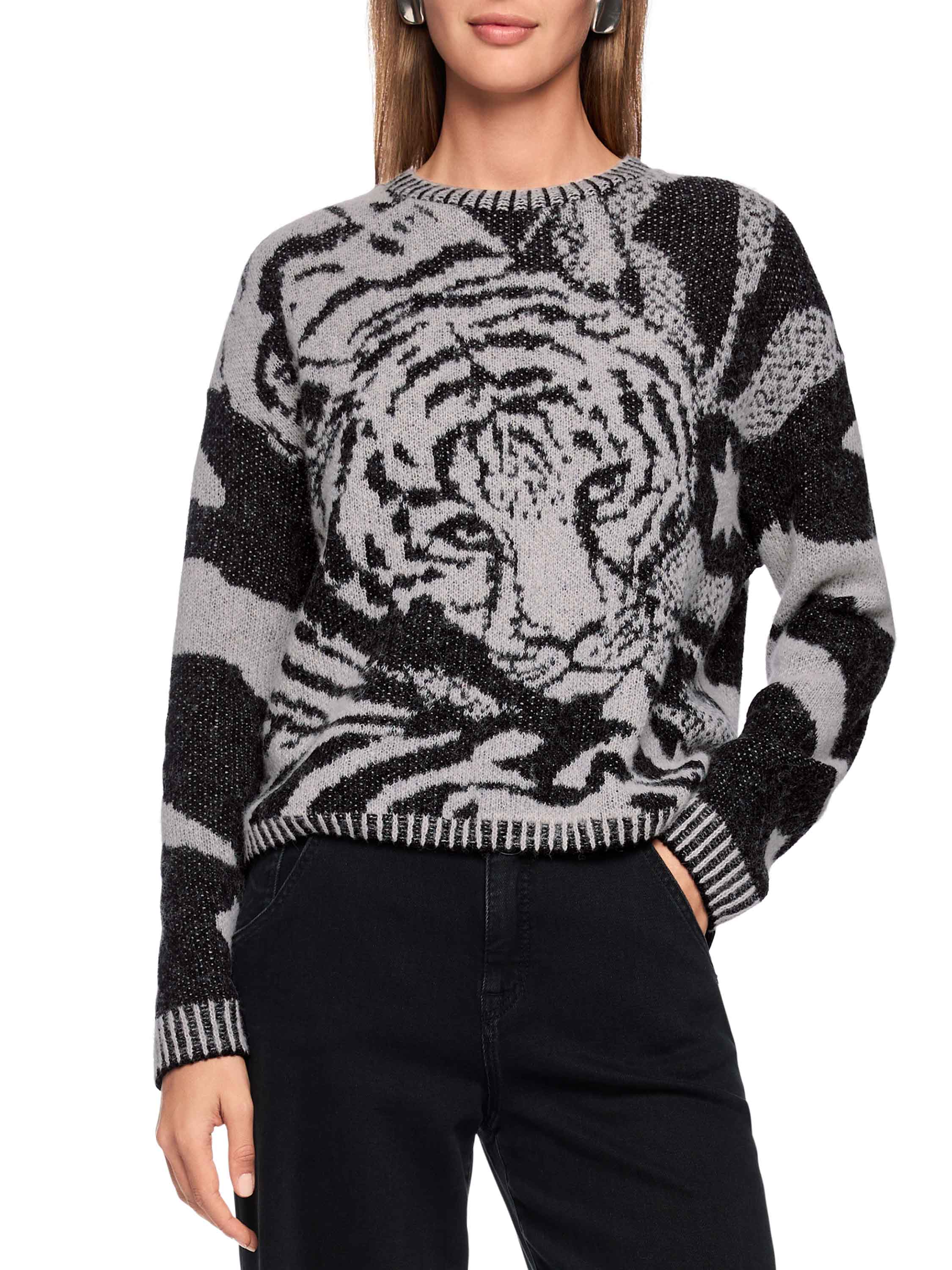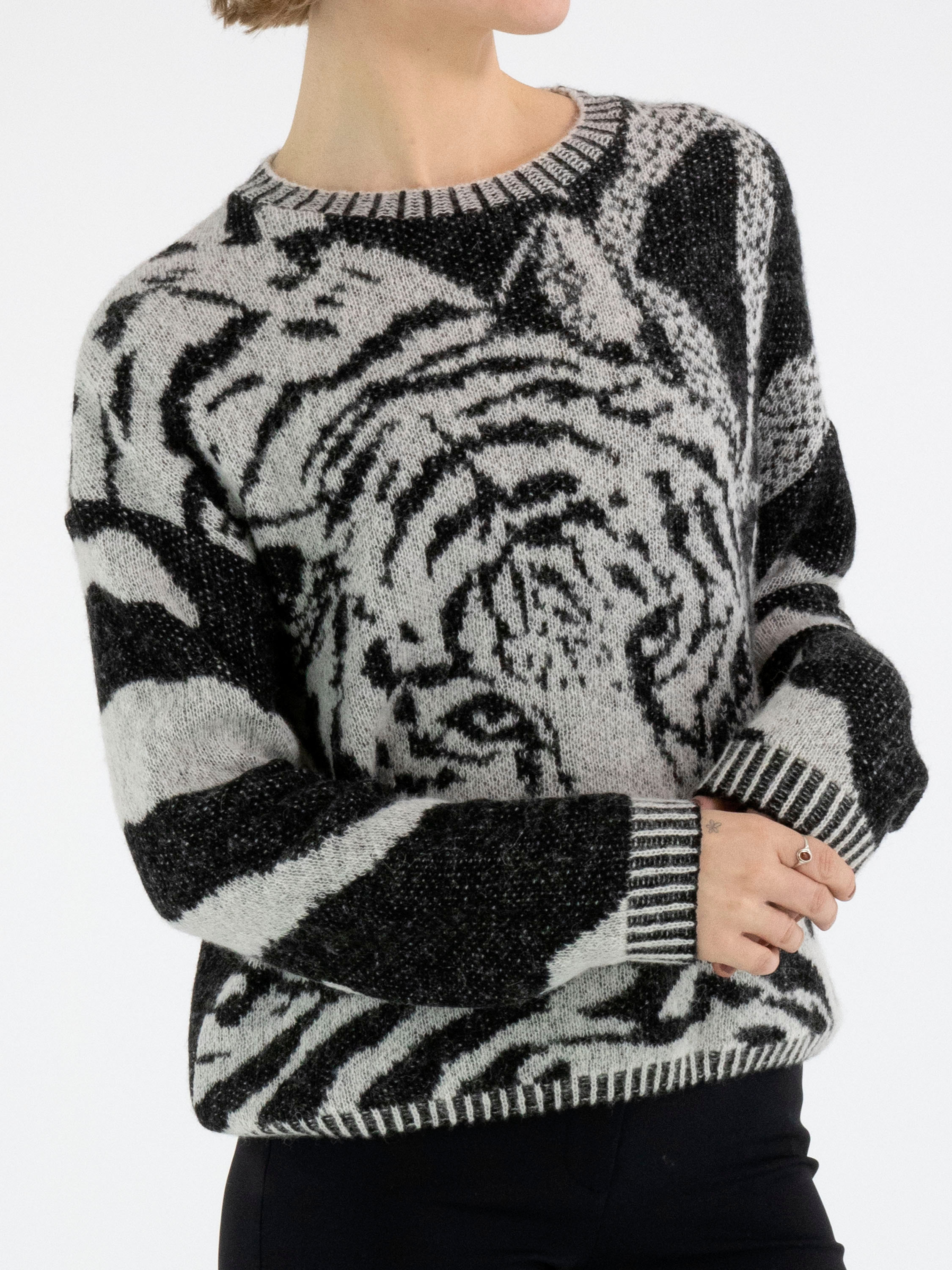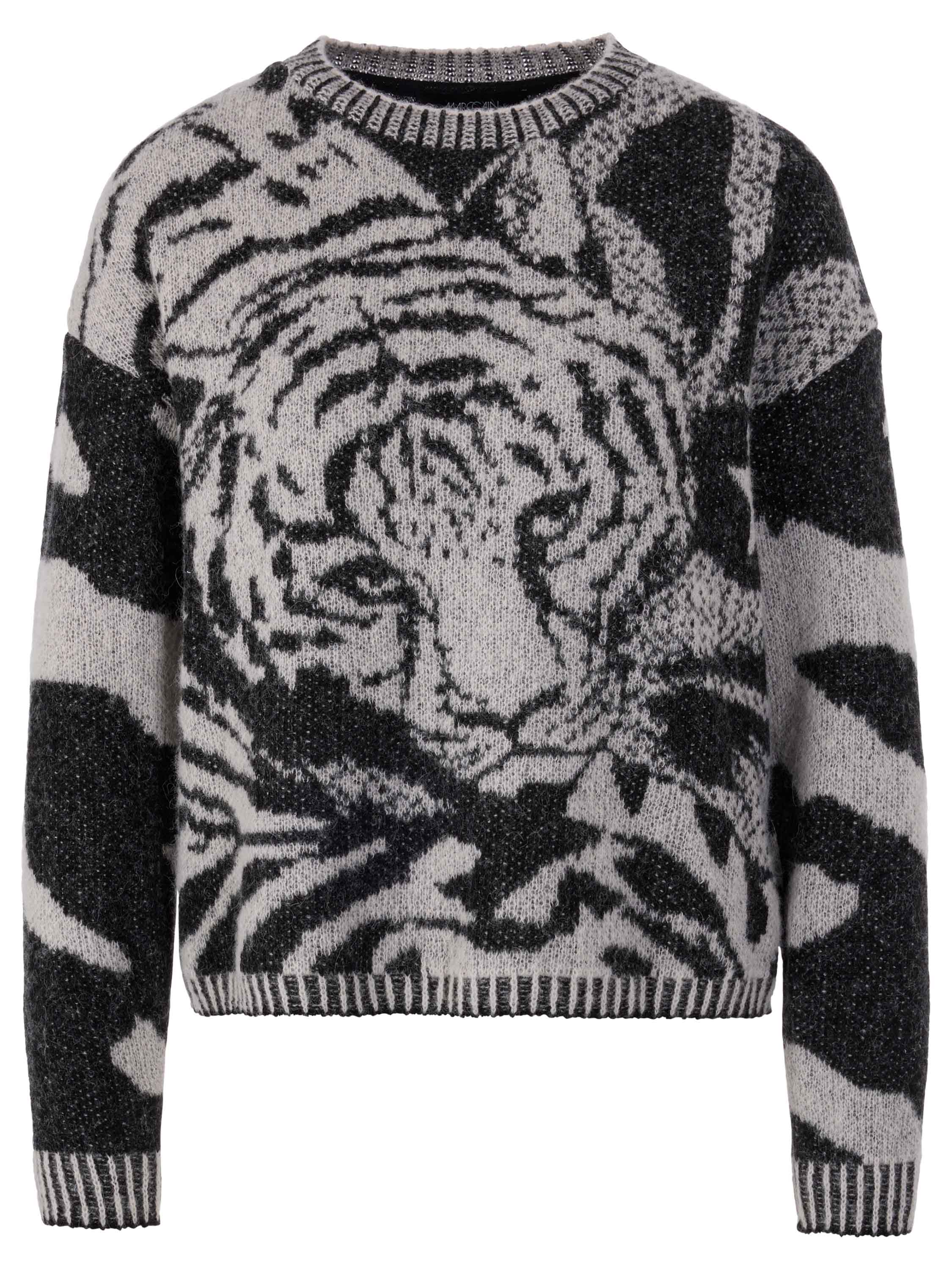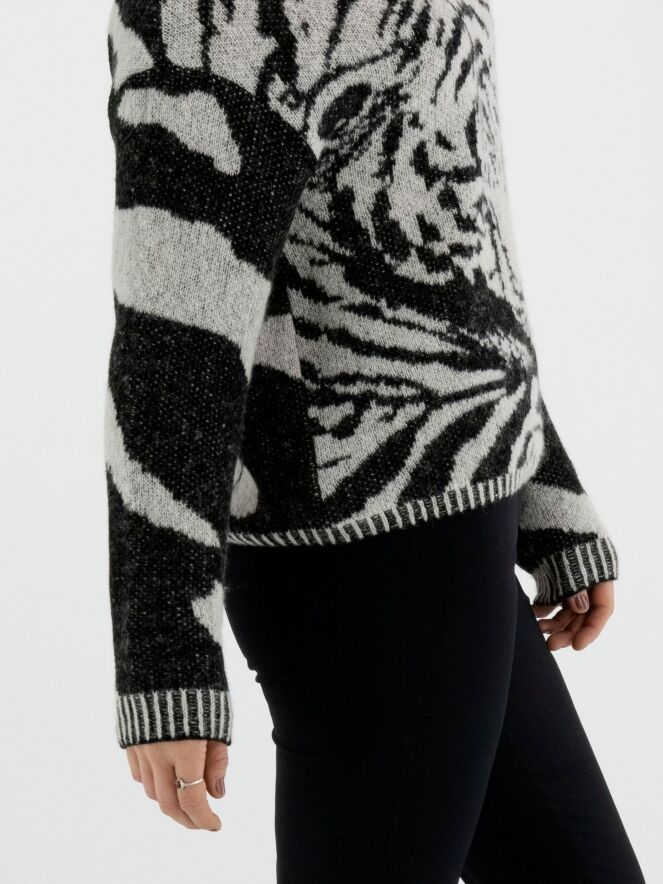 Een pullover van Marc Cain met een panterprint op de voorkant in de kleuren zwart en lichtgrijs. De lange mouwen en de achterzijde zijn in een zebraprint met dezelfde kleuren. Langs de rand van de ronde hals, de uiteinden van de lange mouwen en de onderkant is een geprinte geribbelde bies. Deze pullover mag op de hand worden gewassen.