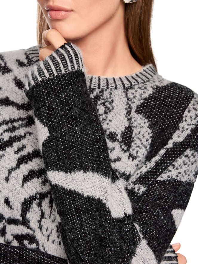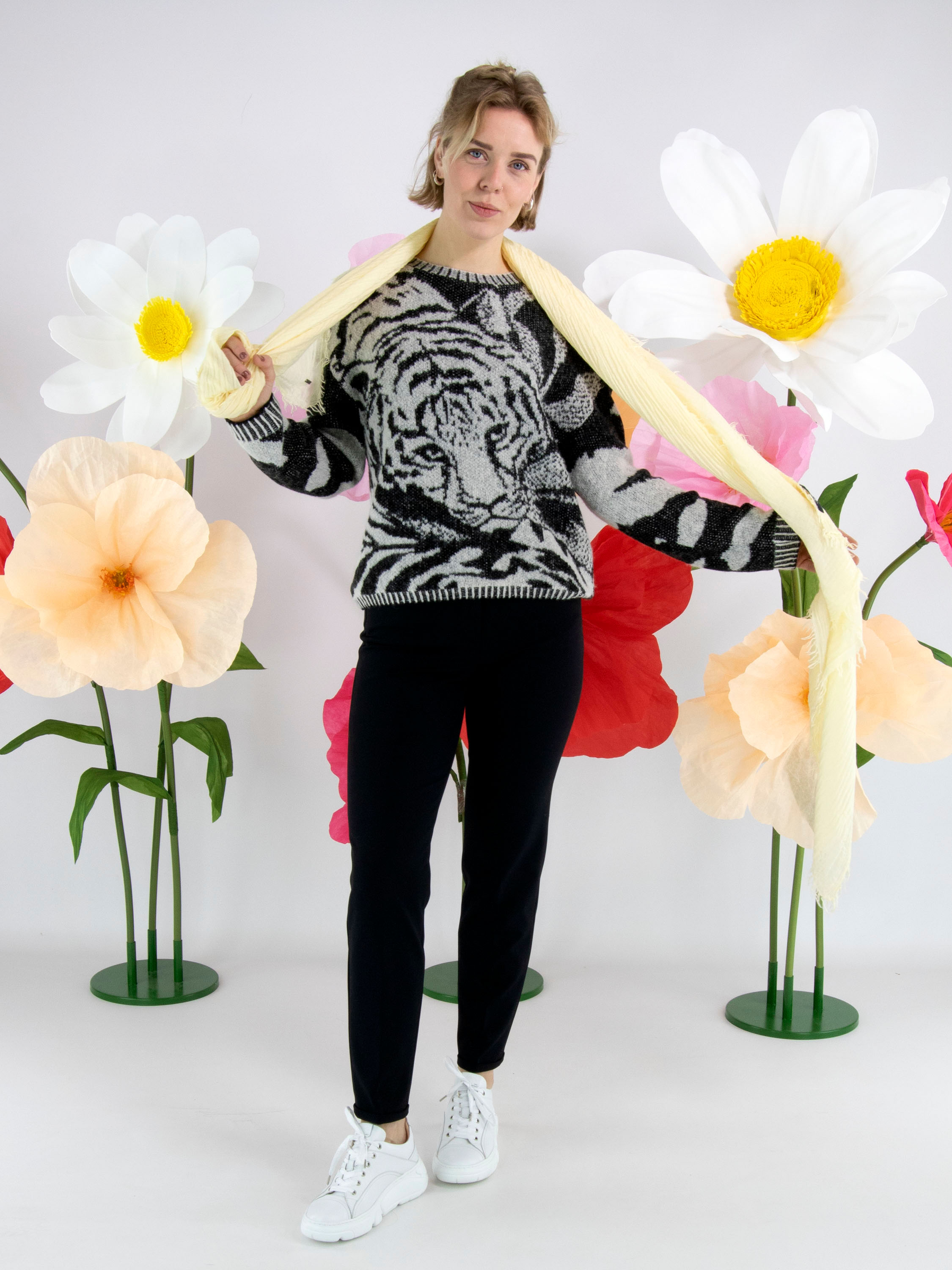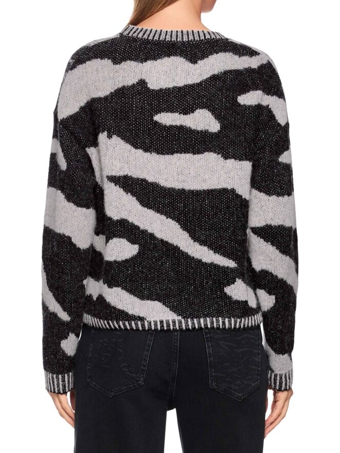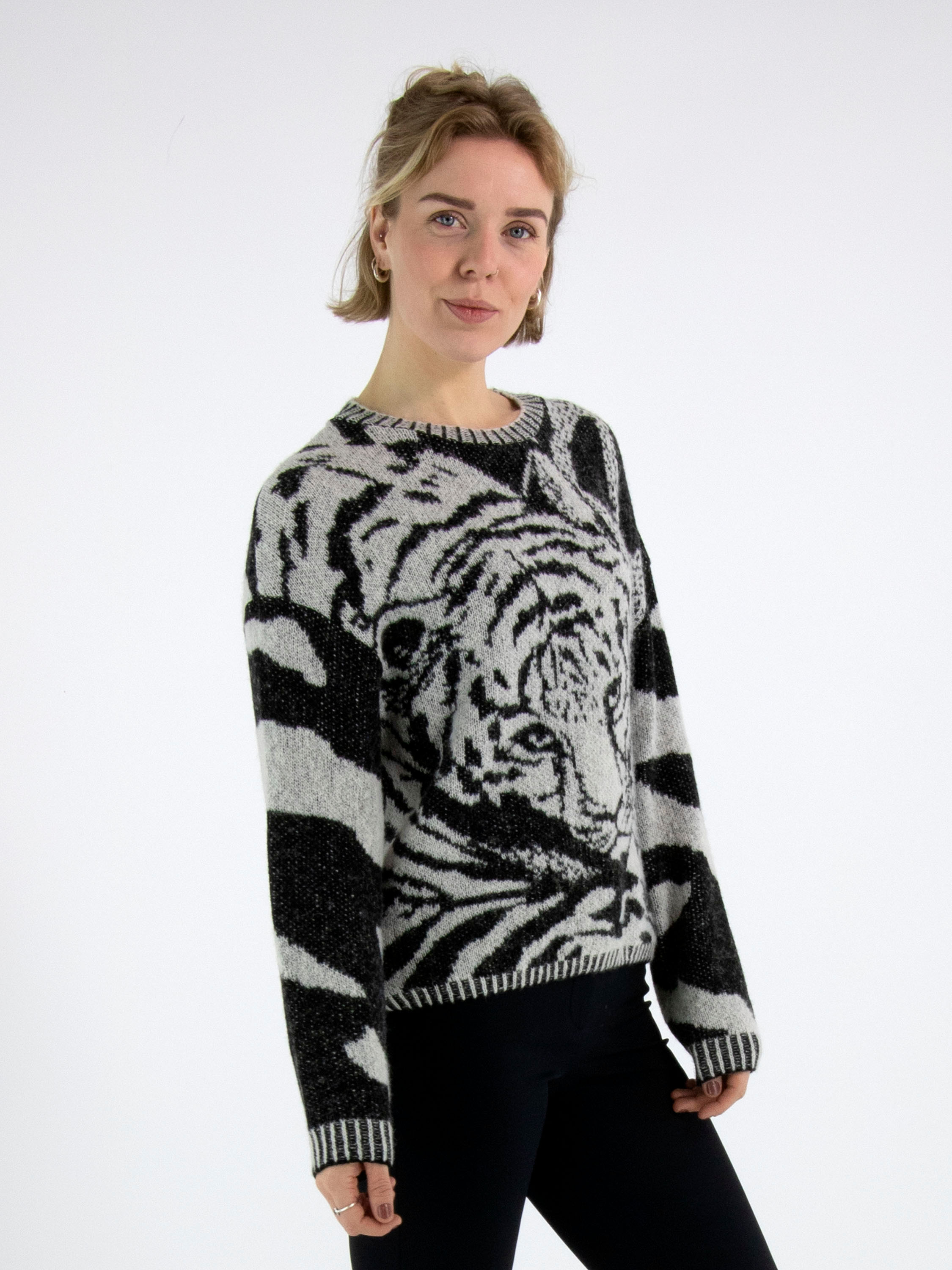 Een pullover van Marc Cain met een panterprint op de voorkant in de kleuren zwart en lichtgrijs. De lange mouwen en de achterzijde zijn in een zebraprint met dezelfde kleuren. Langs de rand van de ronde hals, de uiteinden van de lange mouwen en de onderkant is een geprinte geribbelde bies. Deze pullover mag op de hand worden gewassen.