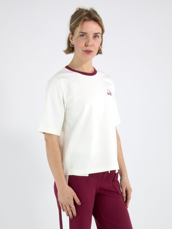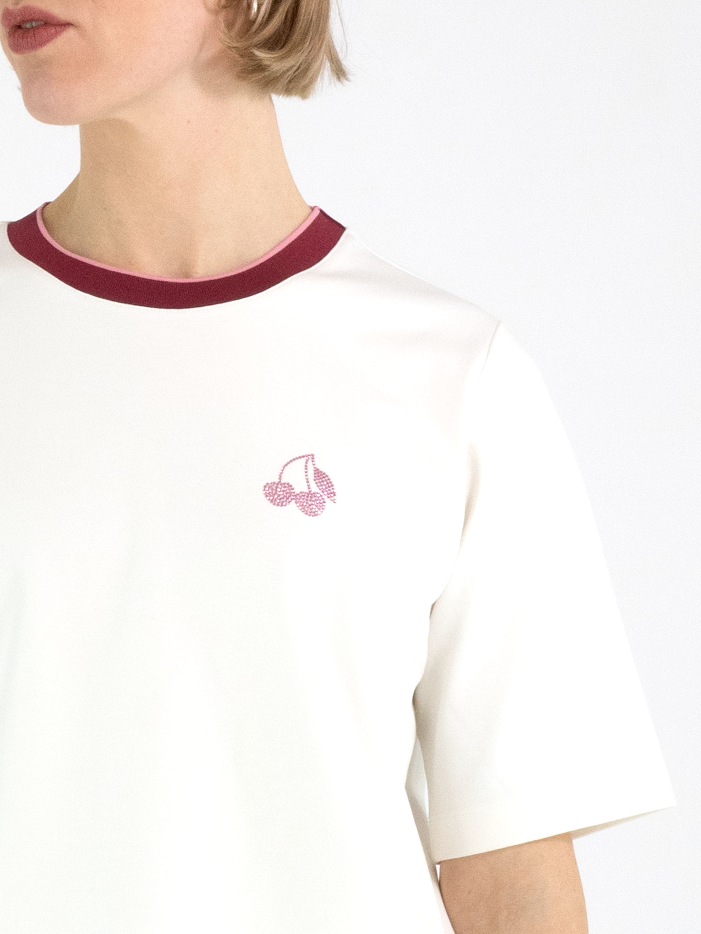 Een wijd en recht gesneden shirt van Marc Cain in een roomwitte kleur met een kersjesembleem van strassteentjes. De rand van de ronde hals heeft een fijn geribbelde tricot bies in een strepenpatroon met de kleuren bordeauxrood en pastelroze. Het shirt heeft korte mouwen en mag op 30 graden worden gewassen.