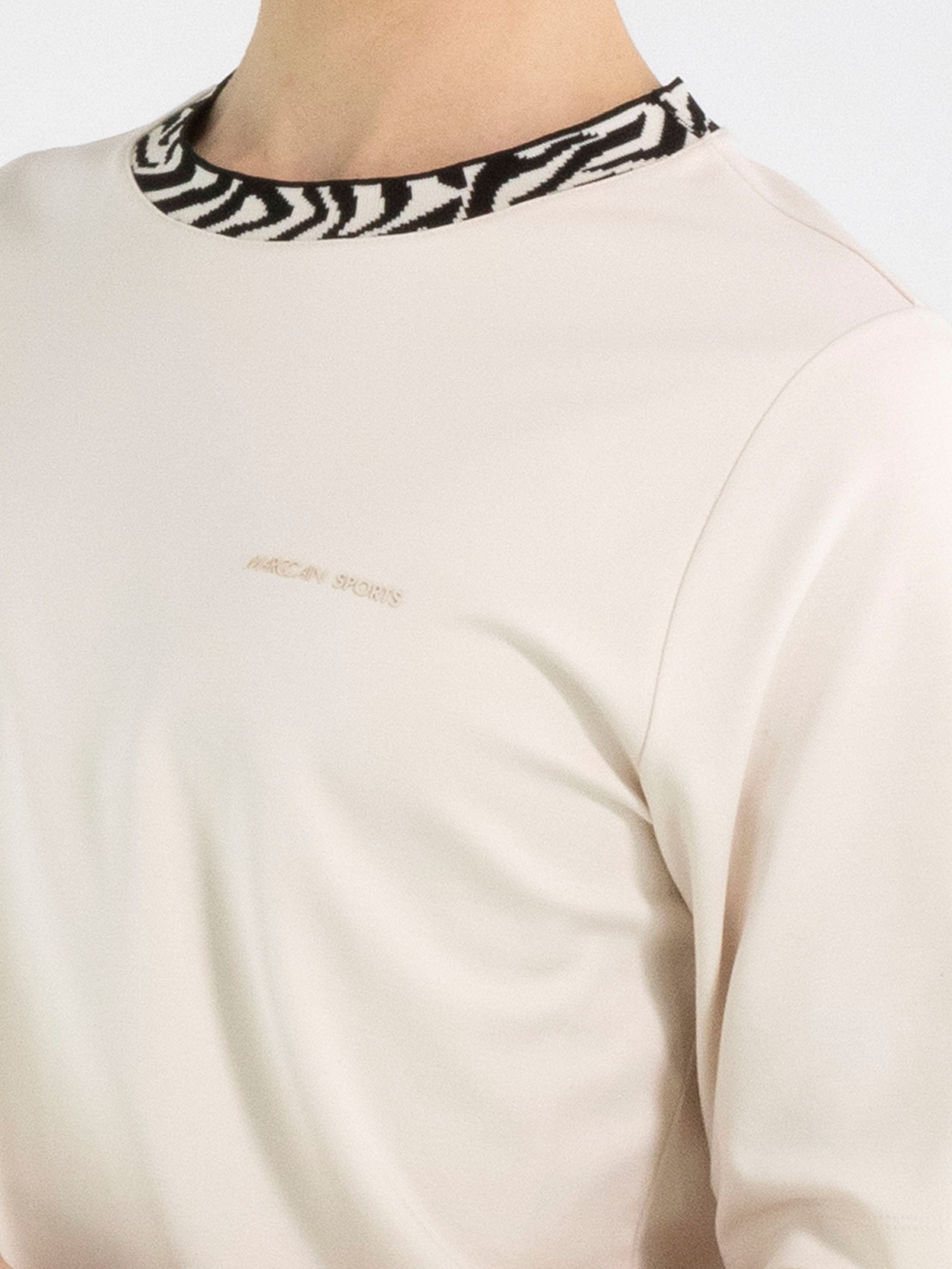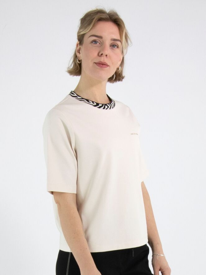 Een shirt van Marc Cain in de kleur beige. Het shirt heeft korte mouwen. Langs de rand van de ronde hals is een bies in een zebraprint met de kleuren beige en zwart. Dit shirt mag op 30 graden worden gewassen.