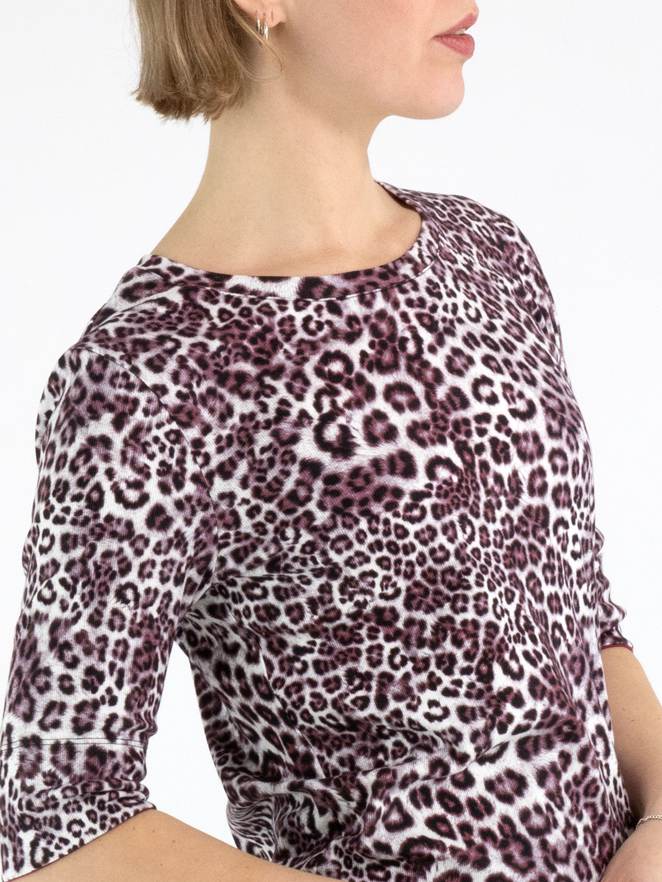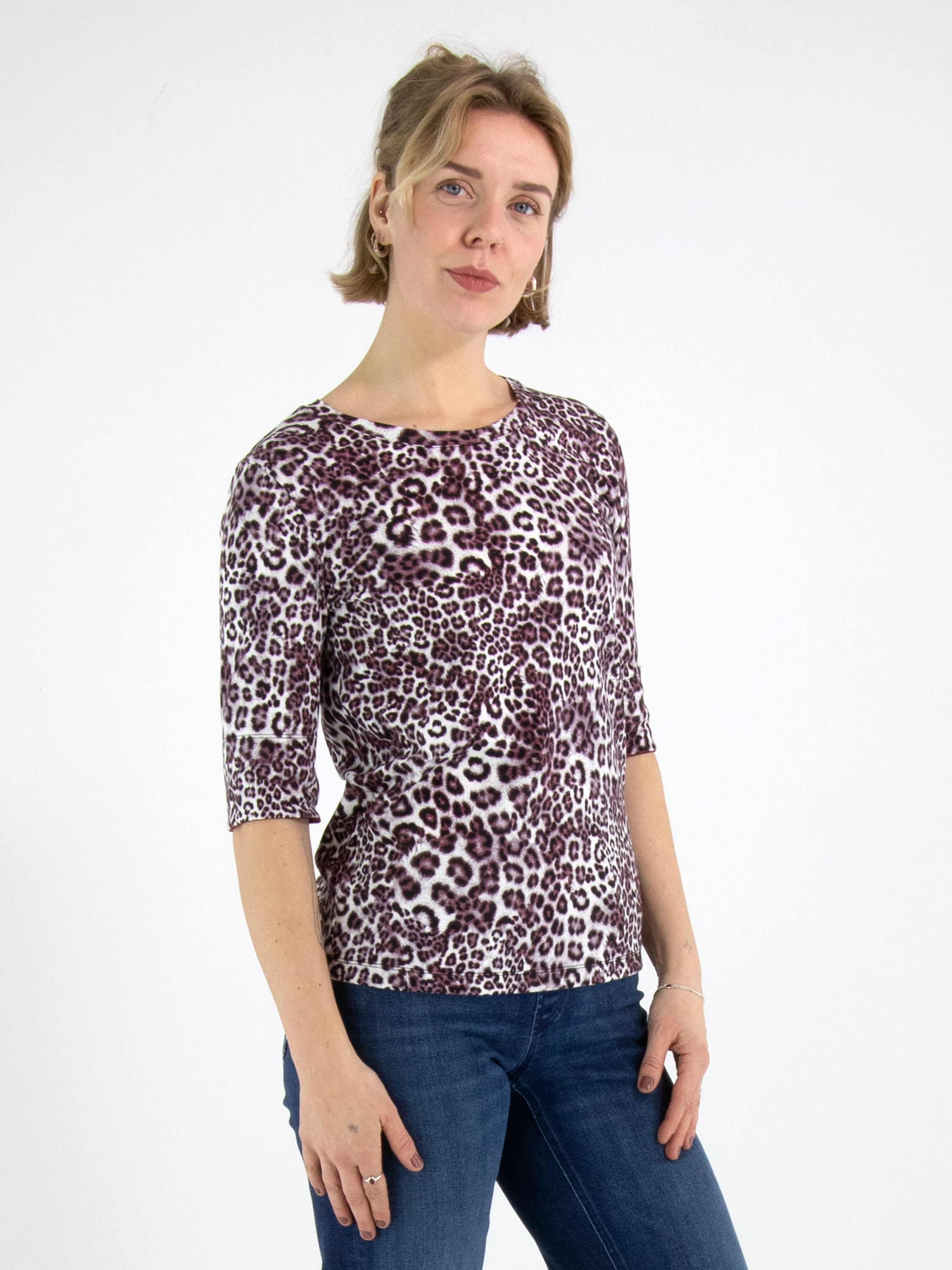 Een shirt van Marc Cain in een fijn geribbelde structuur in een panterprint met meerdere tinten grijs, bordeauxrood en roomwit. De korte mouwen hebben een omslag in een uni bordeauxrode kleur. Het shirt heeft een ronde hals en mag op 30 graden worden gewassen.