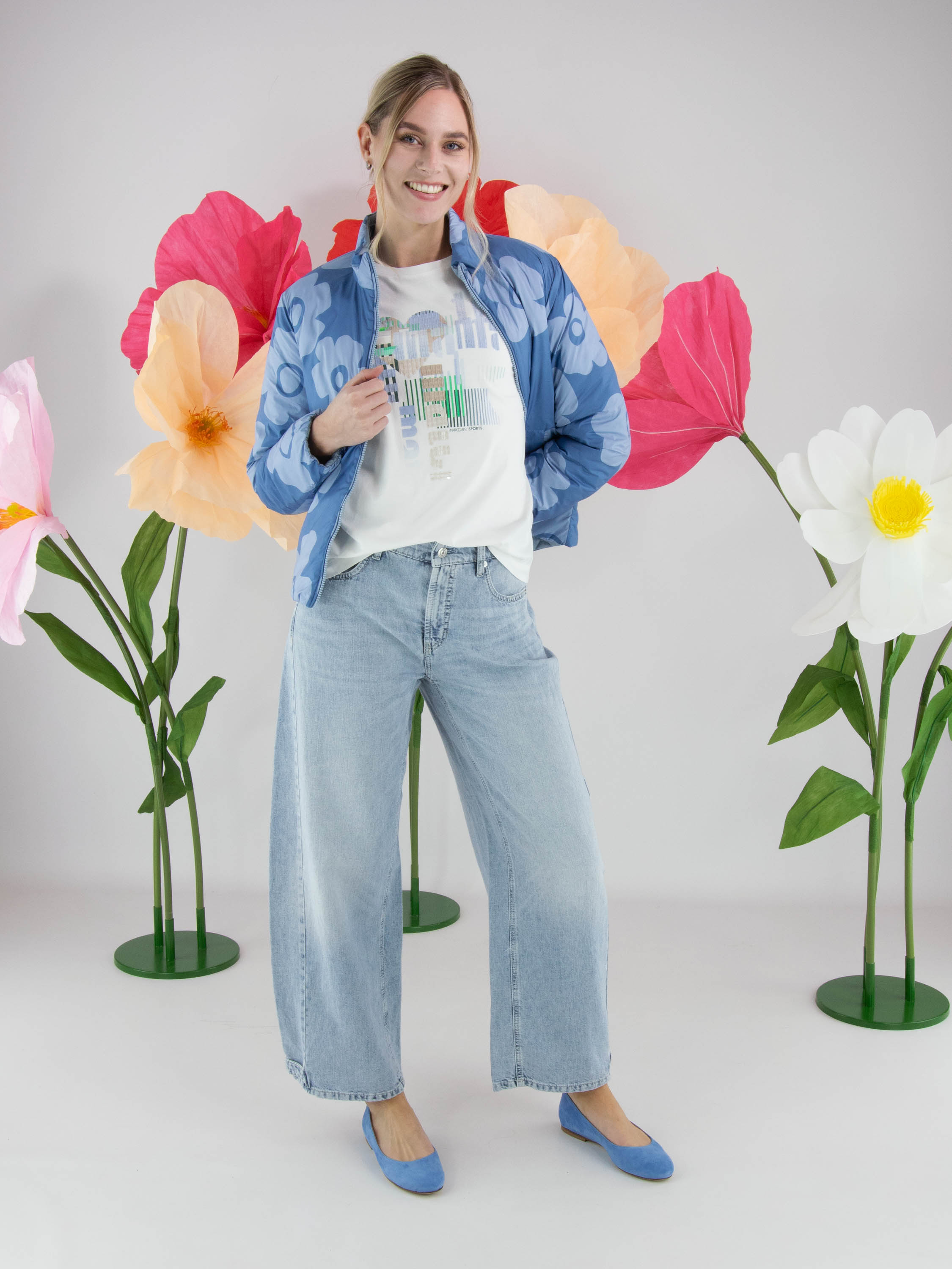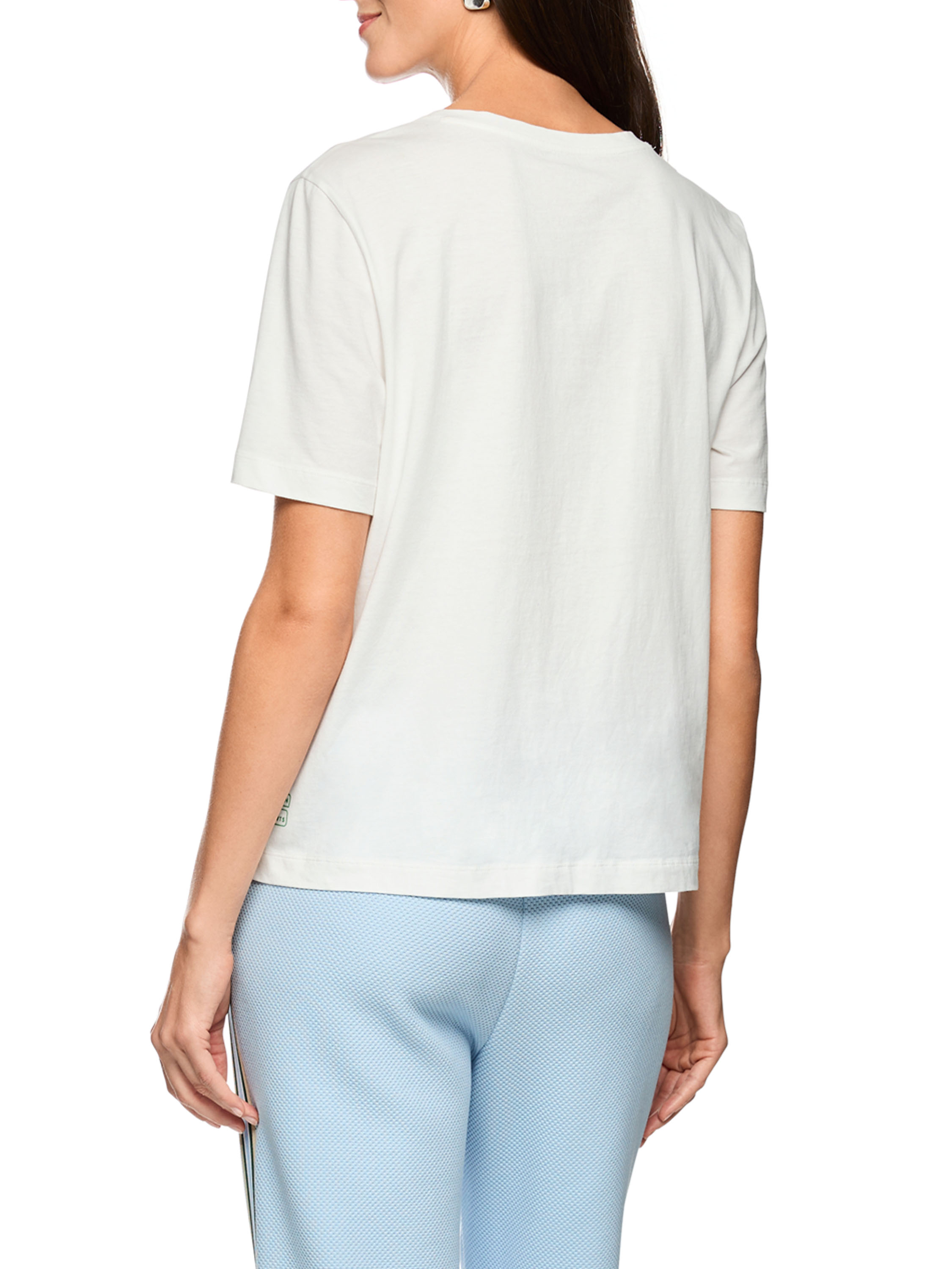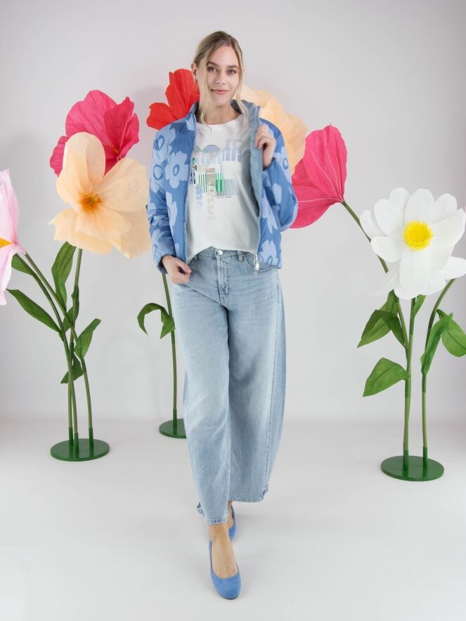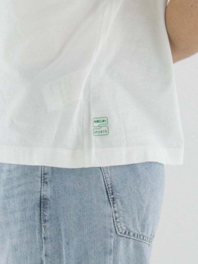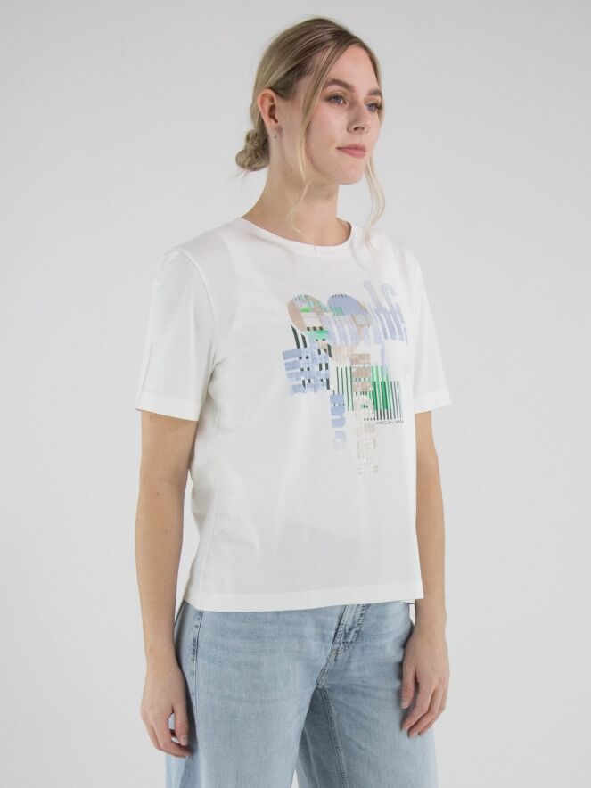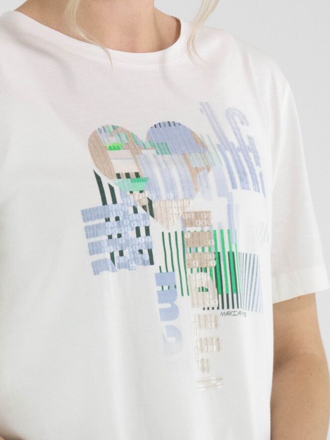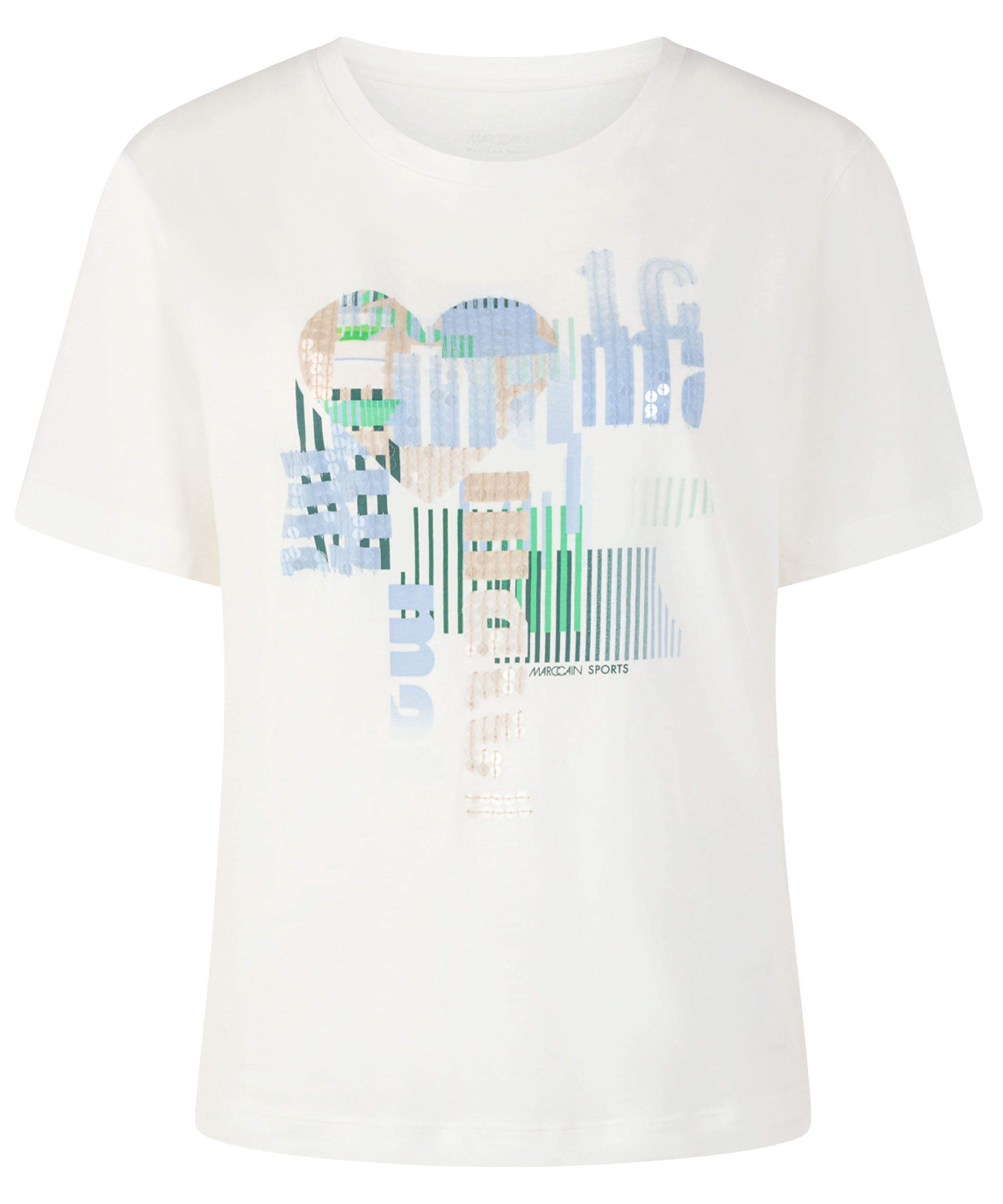 Shirt van Marc Cain met een grafische print en subtiel verwerkte transparante lovertjes in de kleuren blauw, groen en beige op een witte achtergrond. Het shirt heeft een ronde hals en korte mouwen, wat zorgt voor een frisse en eigentijdse uitstraling. Deze exclusieve designer top kan op 30 graden worden gewassen.