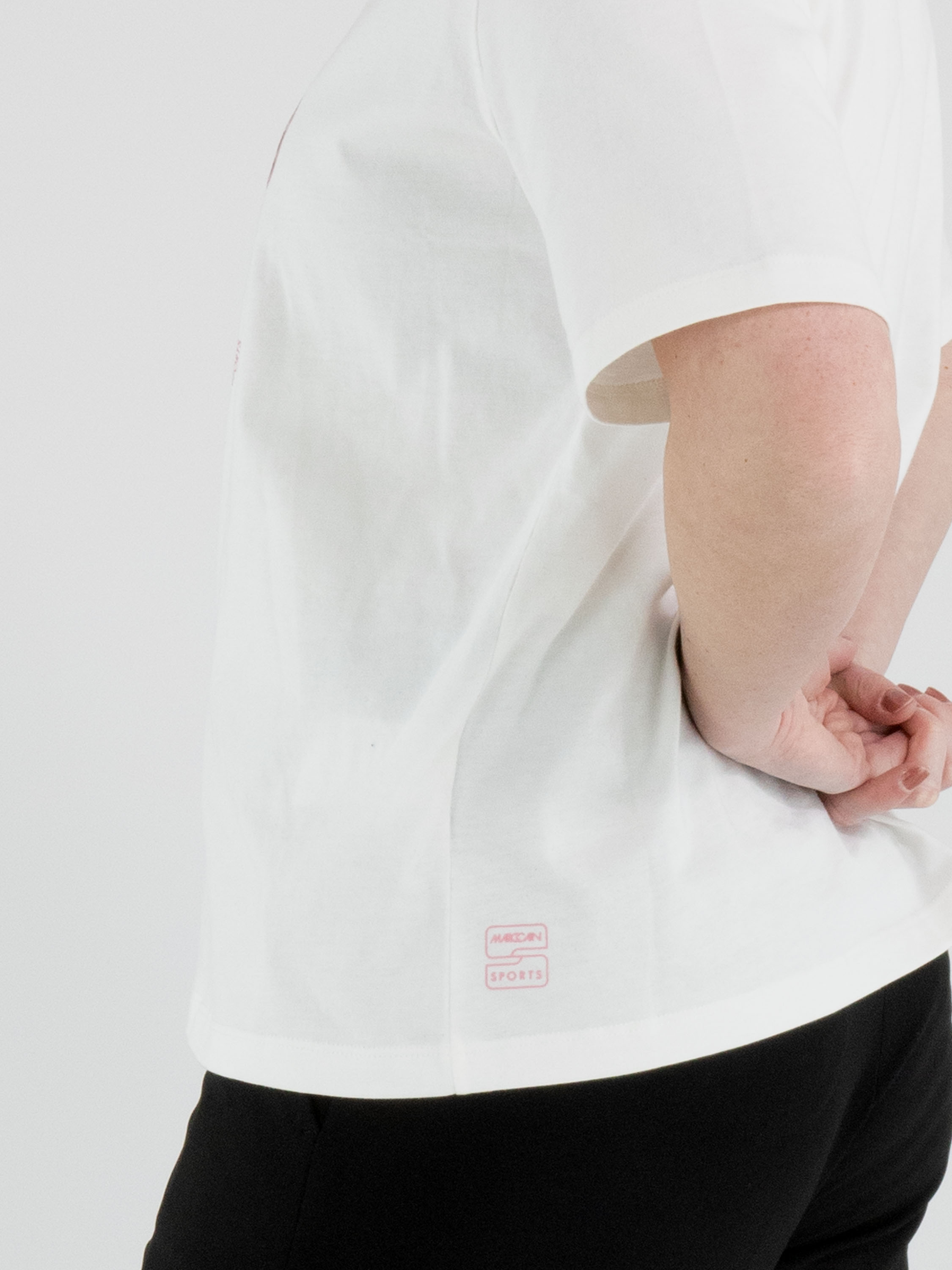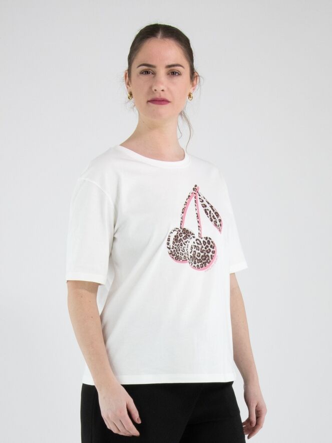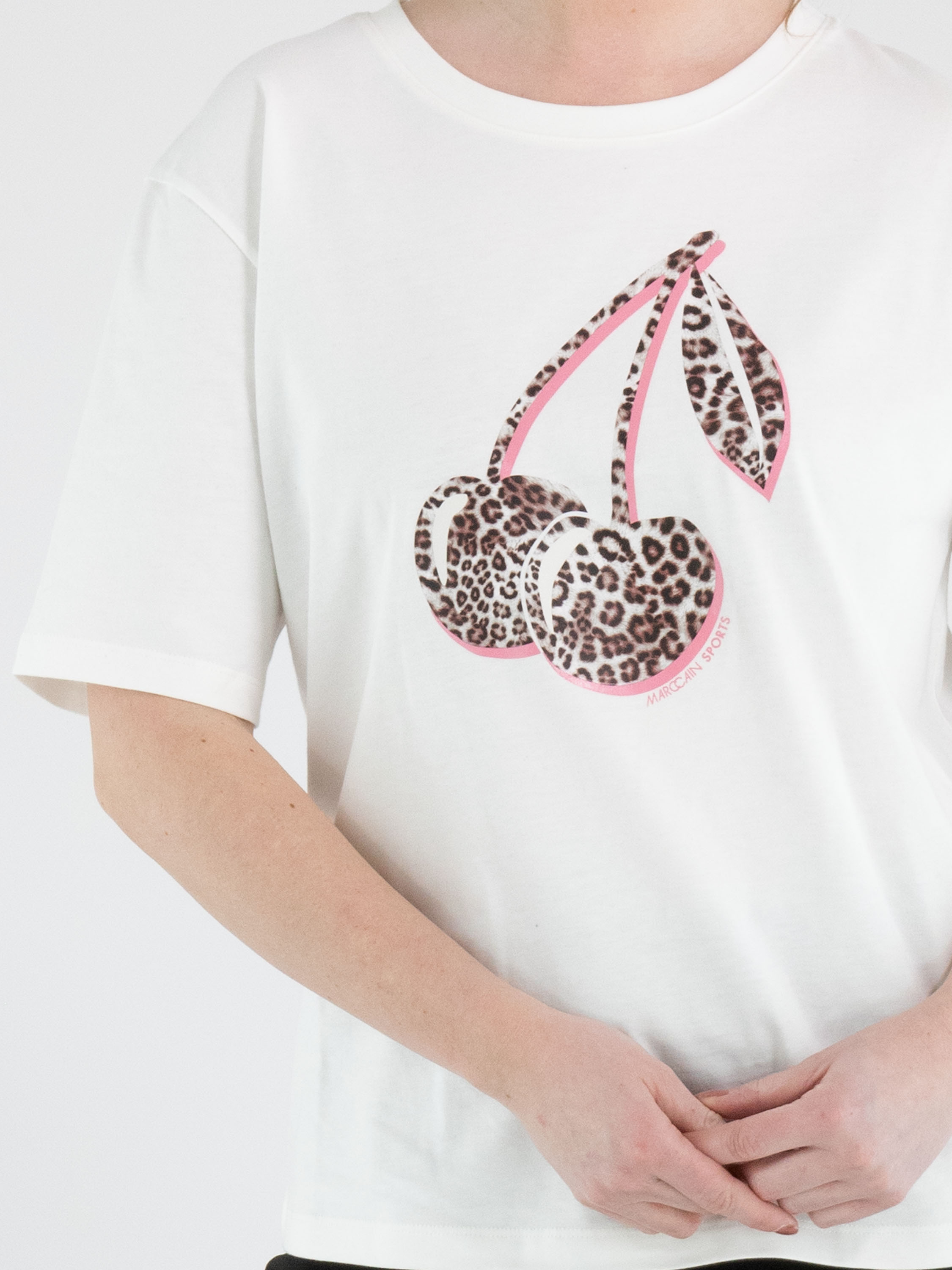Een wijd en recht gesneden shirt van Marc Cain in de kleur wit. Aan de voorkant is een decoratieve tros kersen in een panterprint met een zalmroze bies langs de randen van de kersenstelen. Het shirt heeft een ronde hals en korte mouwen. Dit shirt mag op 30 graden worden gewassen.