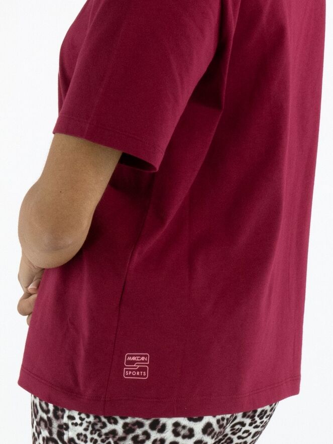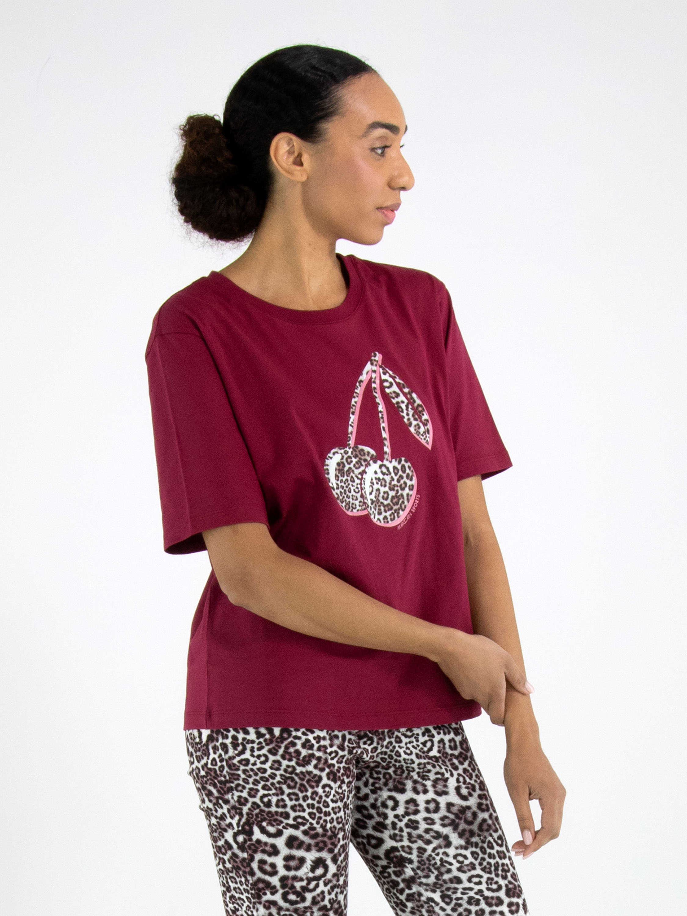Een wijd en recht gesneden shirt van Marc Cain in de kleur bordeauxrood. Aan de voorkant is een decoratieve tros kersen in een panterprint met een zalmroze bies langs de randen van de kersenstelen. Het shirt heeft een ronde hals en korte mouwen. Dit shirt mag op 30 graden worden gewassen.