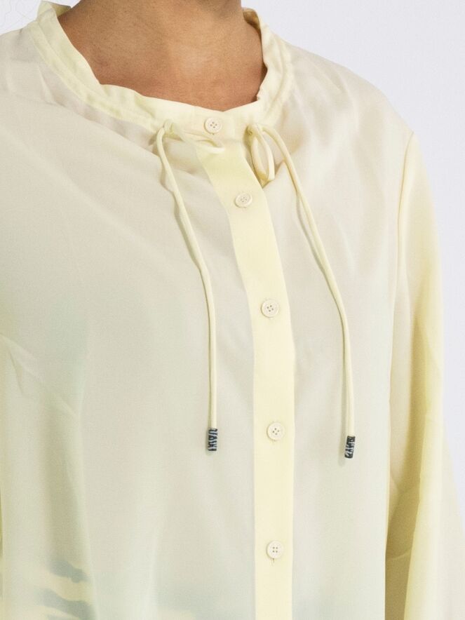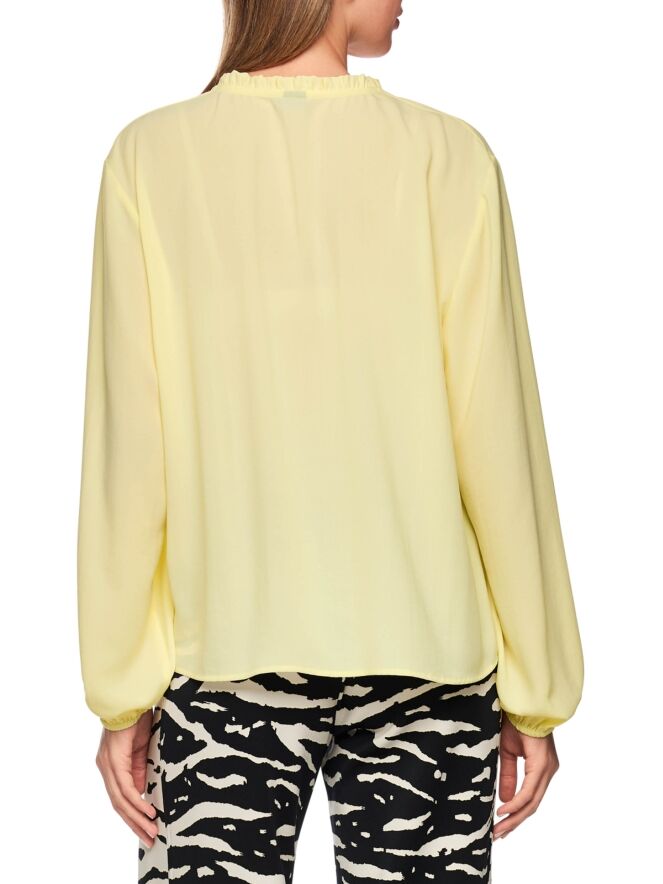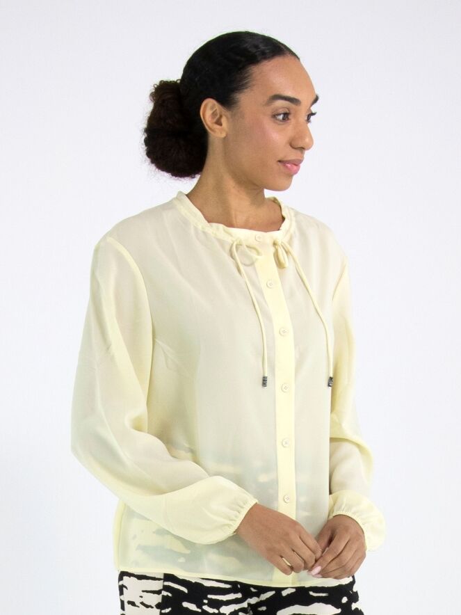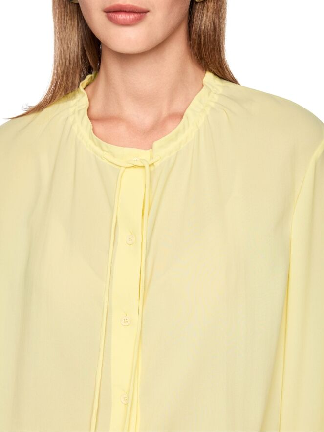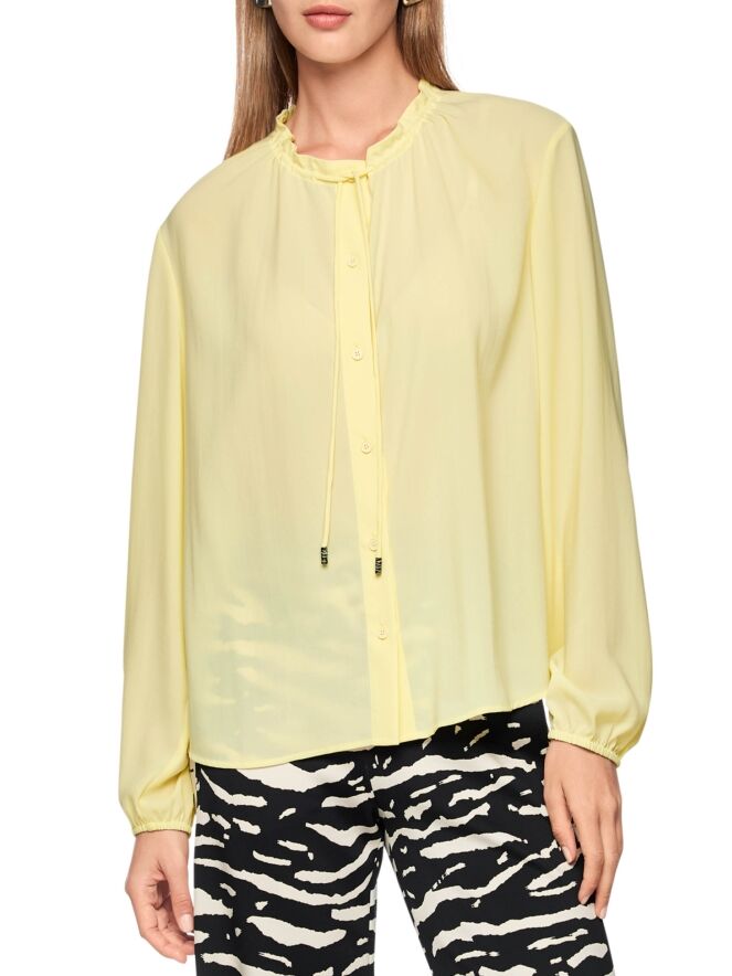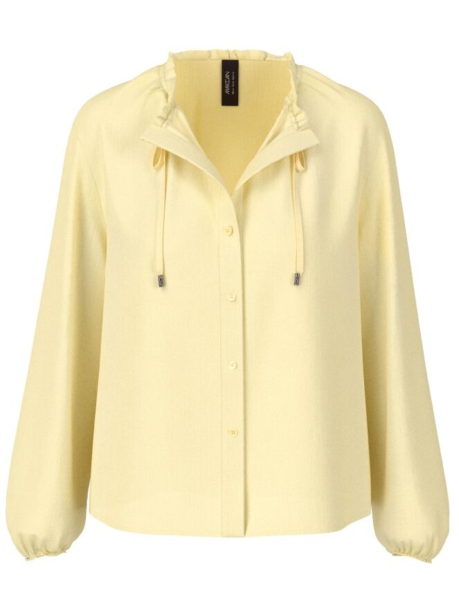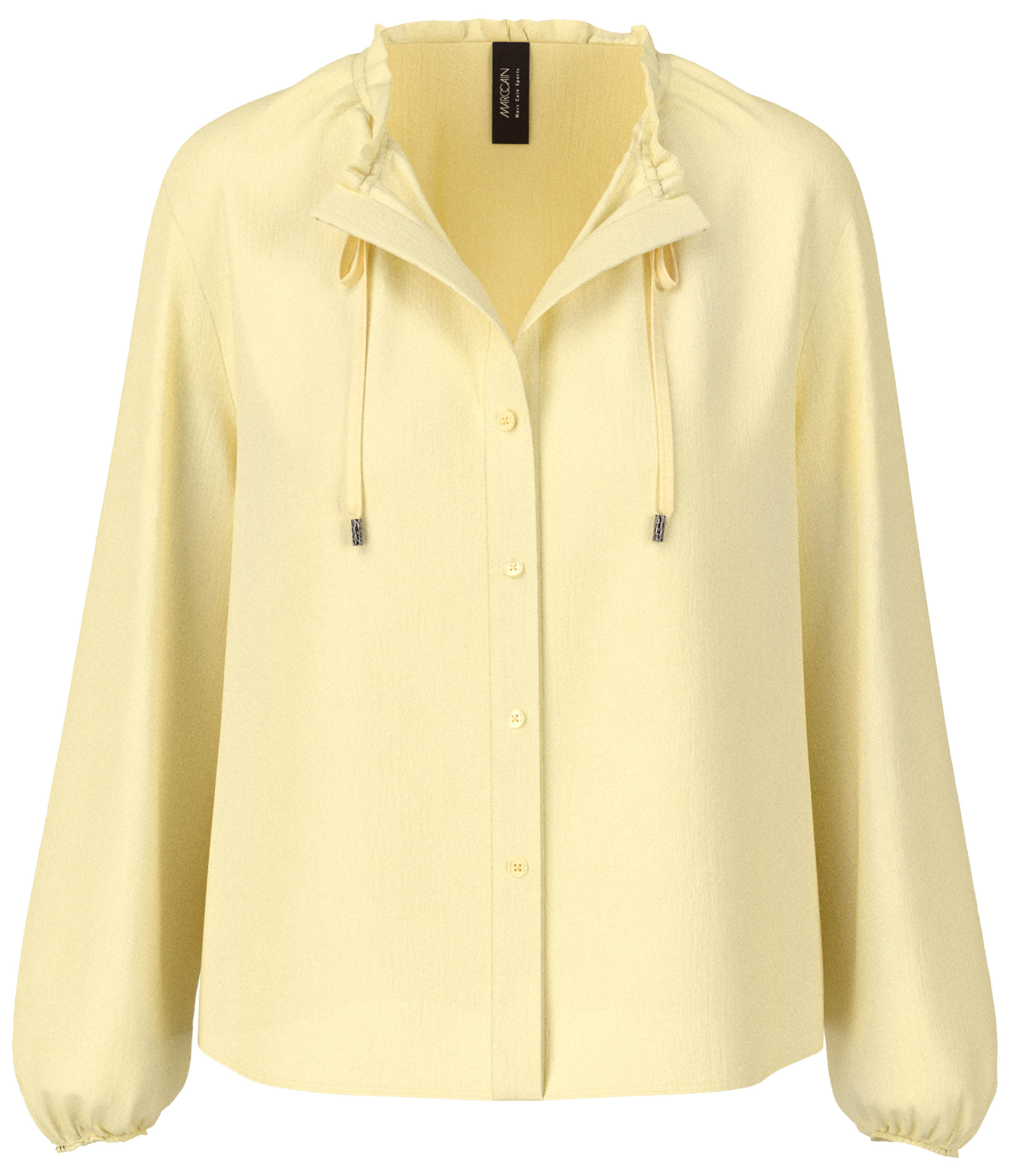 Een blouse van Marc Cain in een pastelgele kleur. In de rand van de ronde hals is een decoratief koord in een tunnelverwerking verwerkt waarmee een plooieffect kan worden gecreëerd. De blouse heeft lange mouwen en mag op 30 graden worden gewassen.