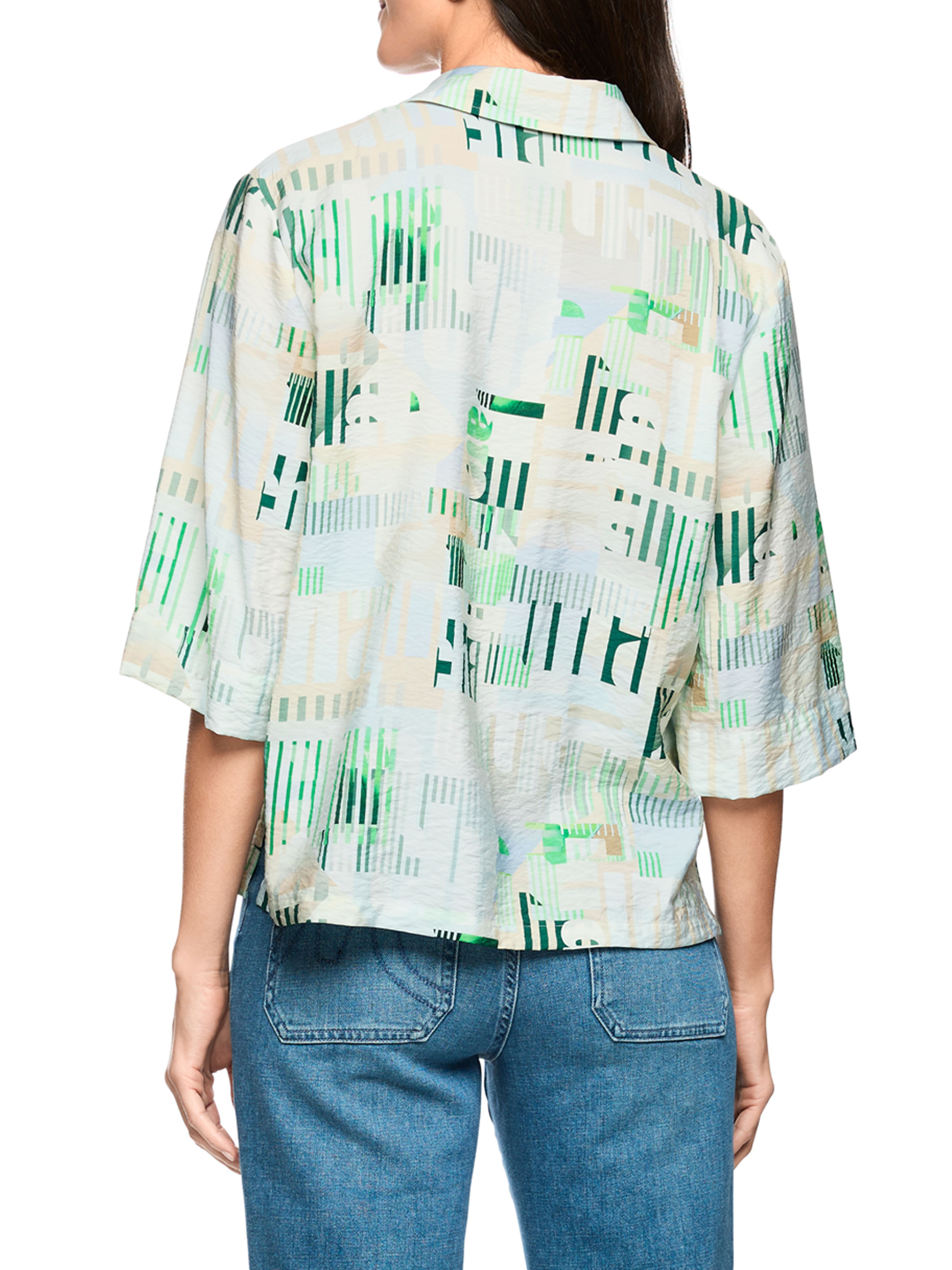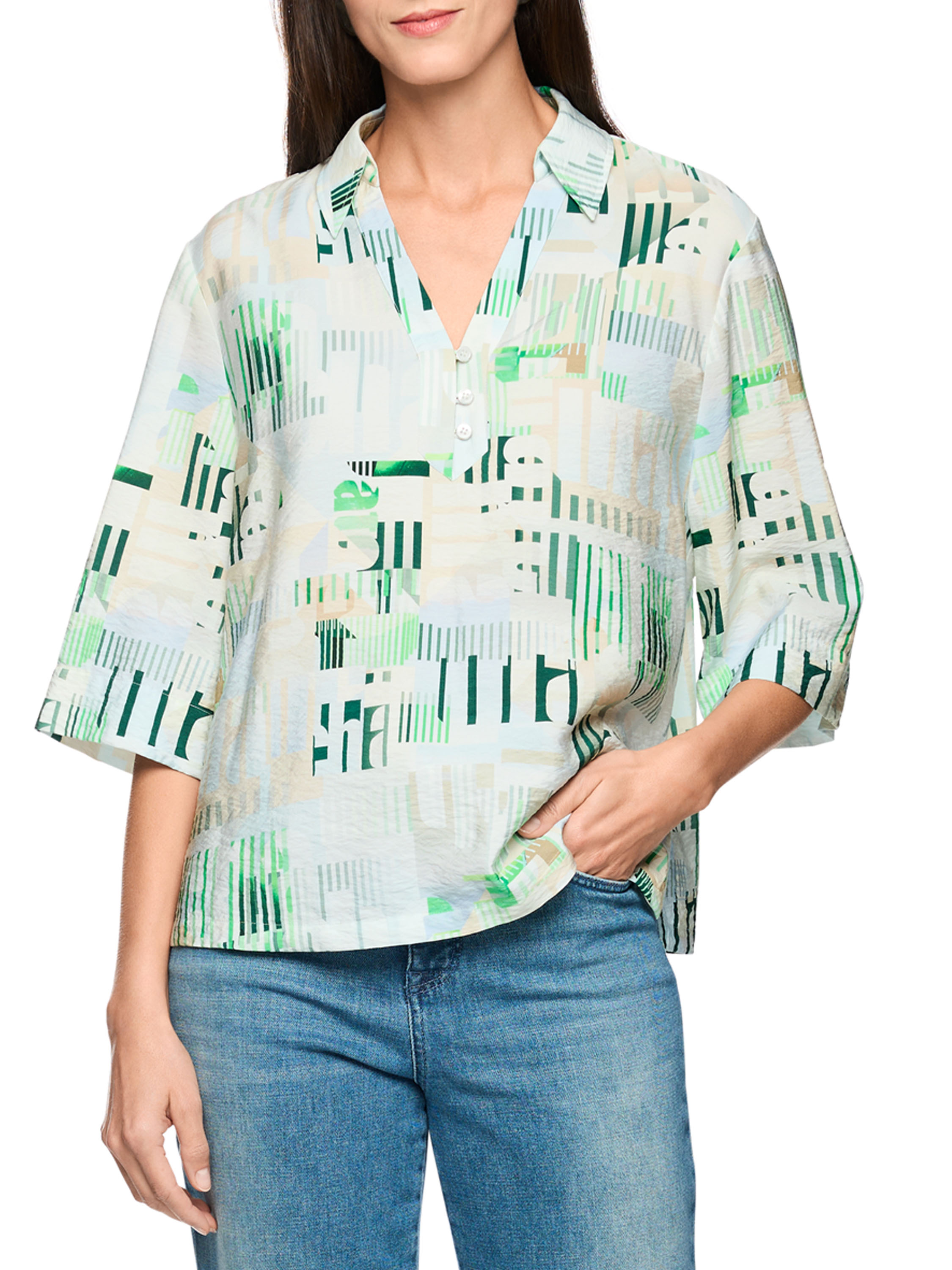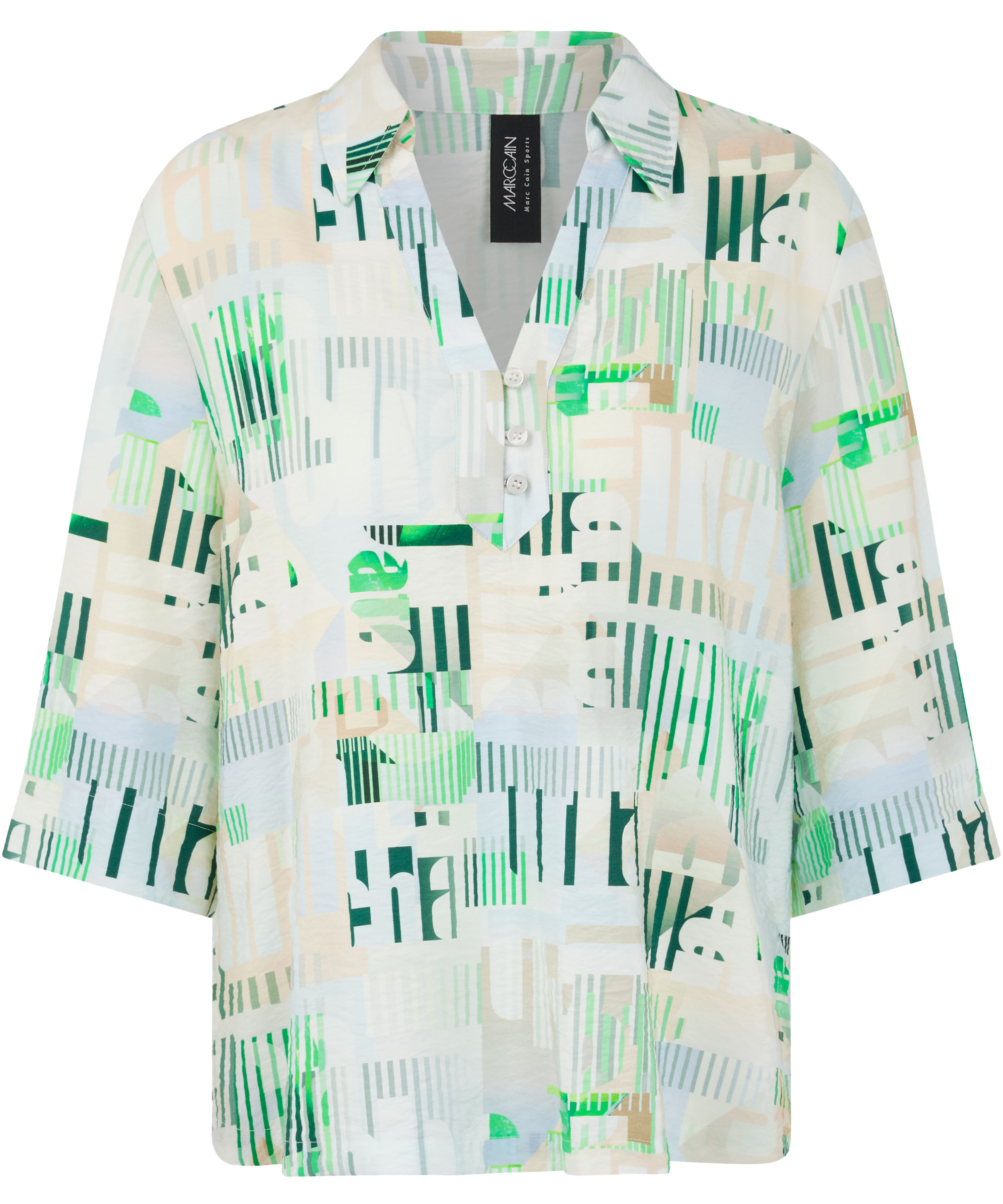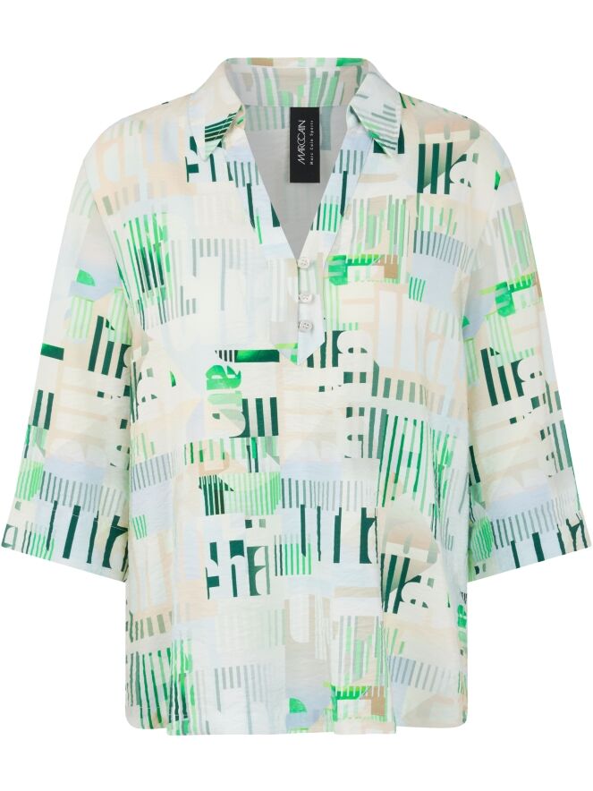Een blouse van Marc Cain met een grafische letter- en streepjesprint in de kleuren zand, bleu, donkergroen, heldergroen en roomwit. De blouse heeft een V-hals met kraag en is uitgevoerd met korte mouwen. Deze blouse kan op 30 graden worden gewassen.