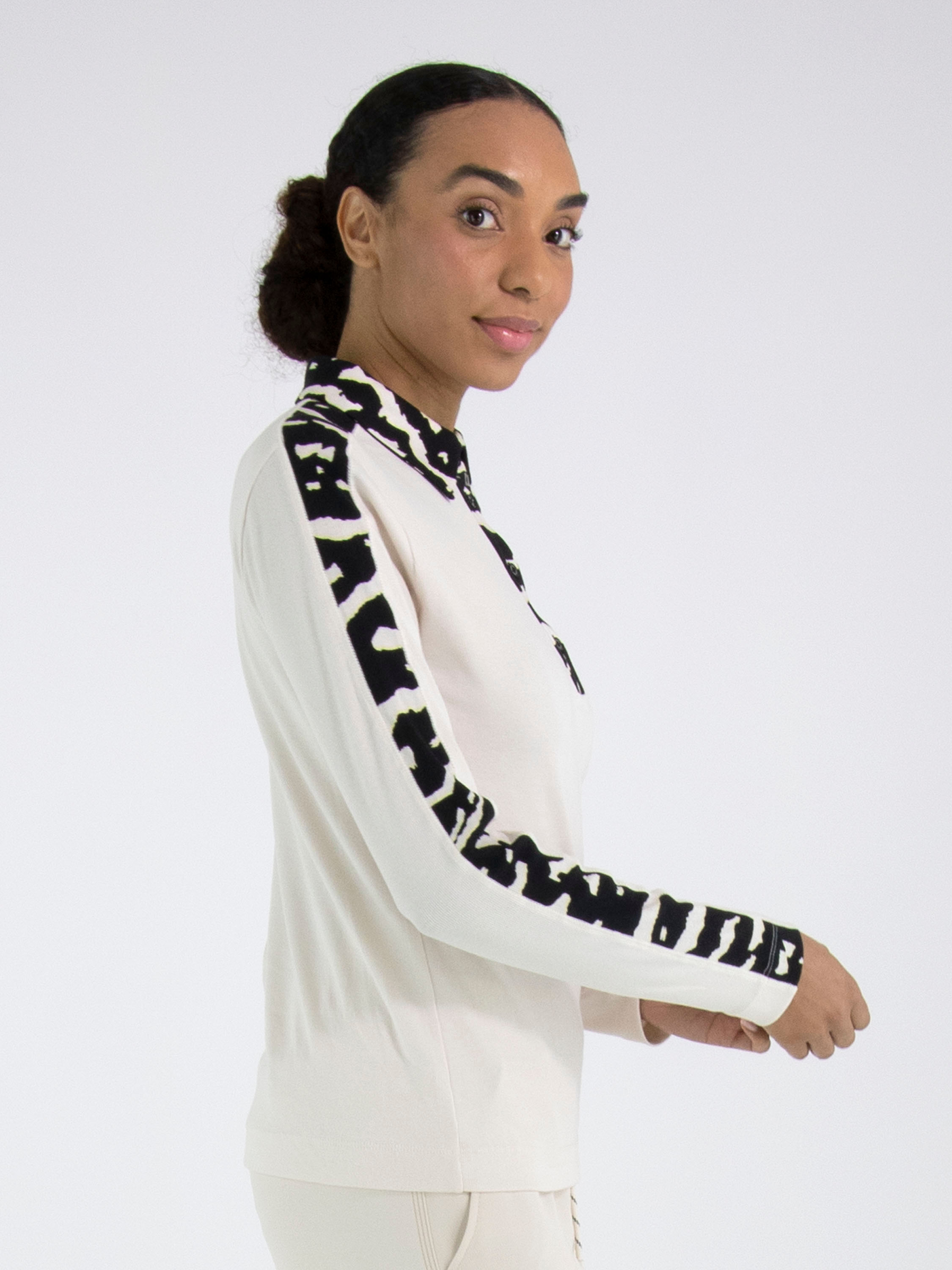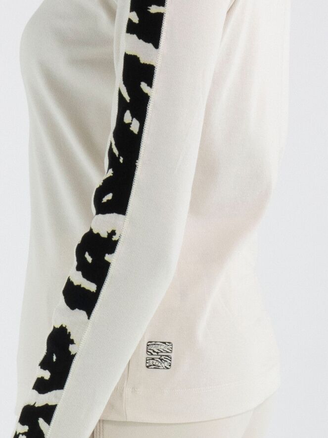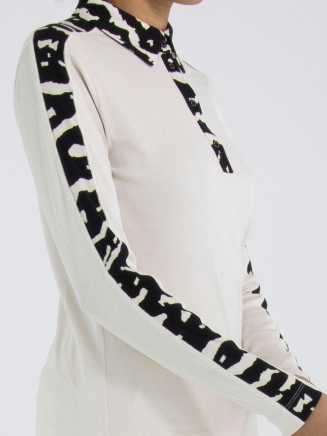 Een fijn geribbeld poloshirt van Marc Cain in een beige kleur. De kraag, de bovenkant van de lange mouwen en de bies langs de knoopjes zijn uitgevoerd in een zebraprint. Dit shirt mag op 30 graden worden gewassen.