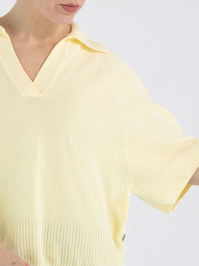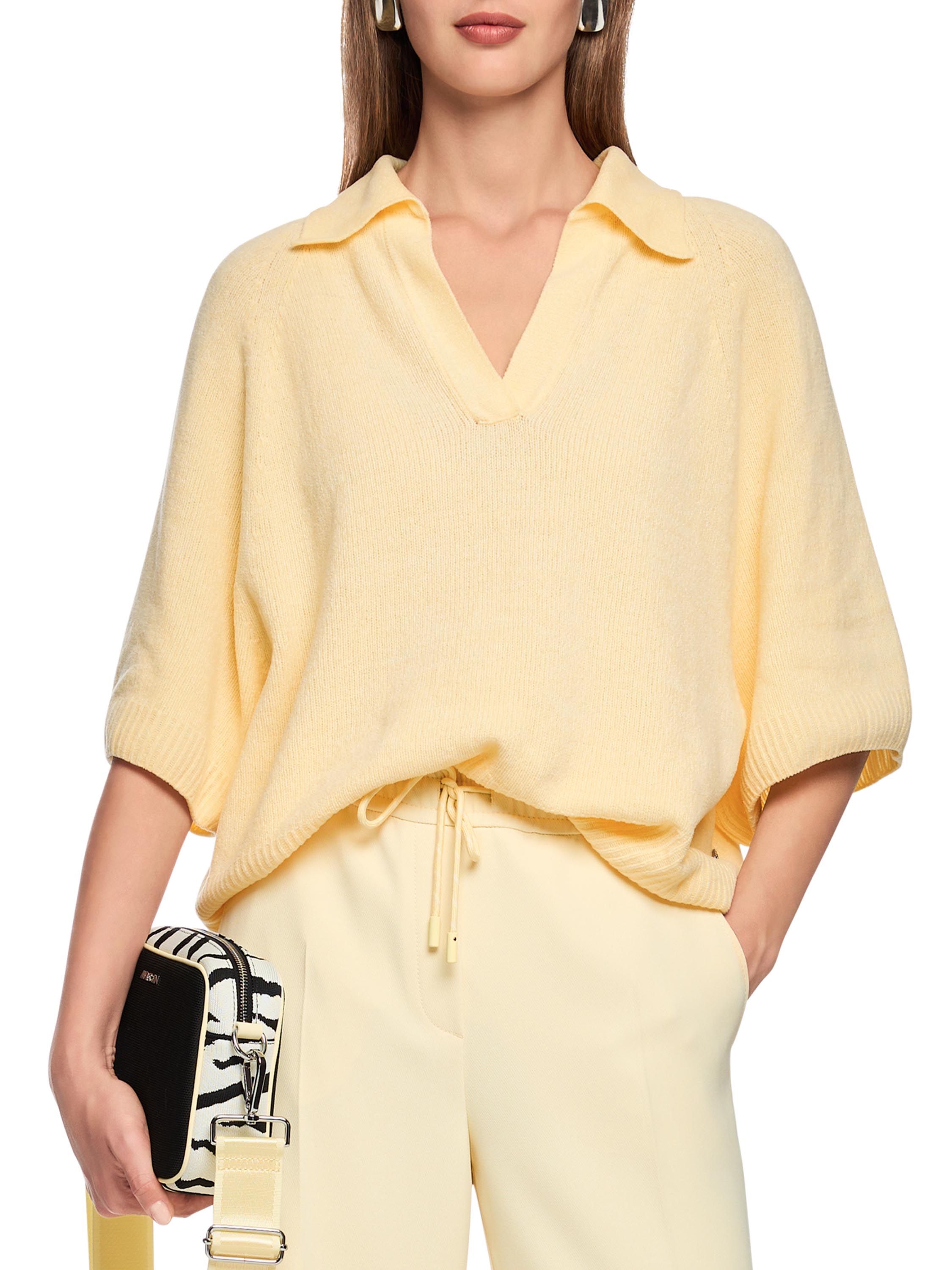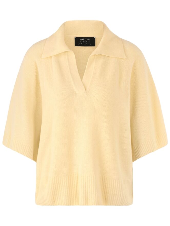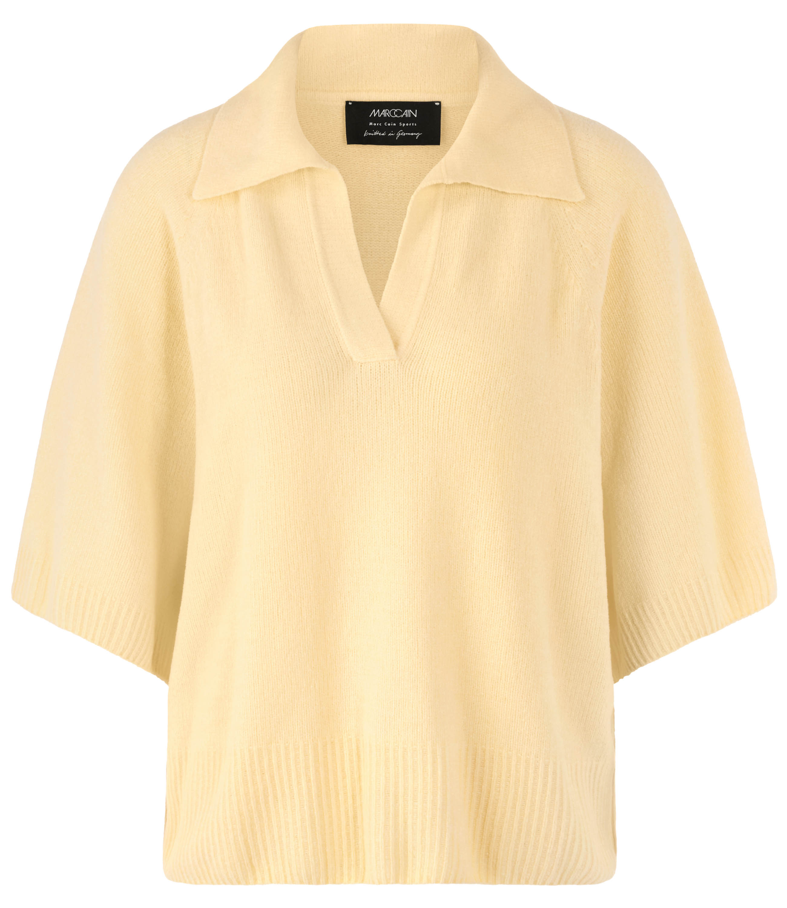 Een pullover van Marc Cain in de kleur geel. De pullover heeft korte mouwen en een V-hals met een kraag. De uiteinden van de korte mouwen en de onderkant hebben een fijn geribbelde boord. Deze pullover mag op 30 graden worden gewassen.