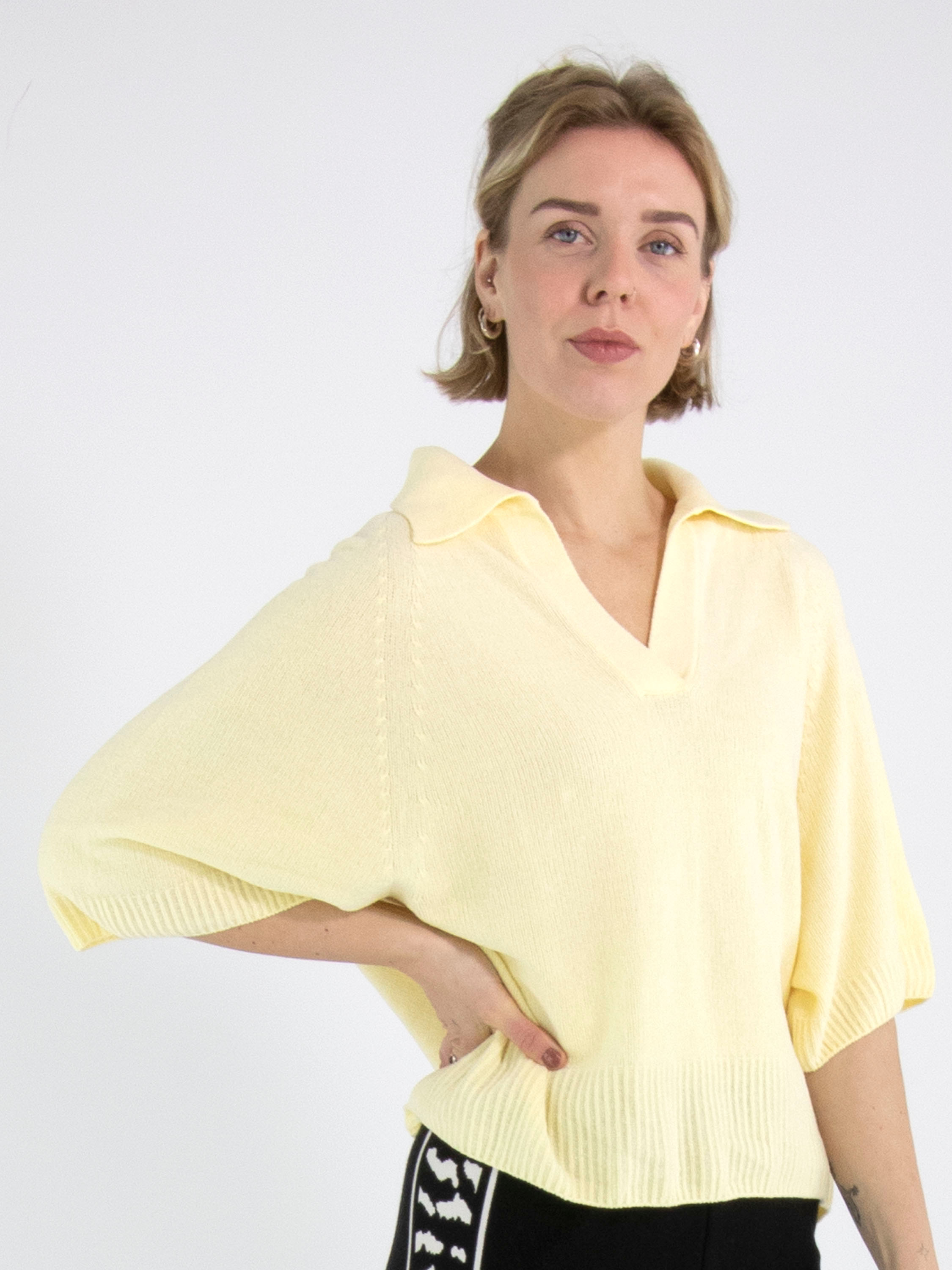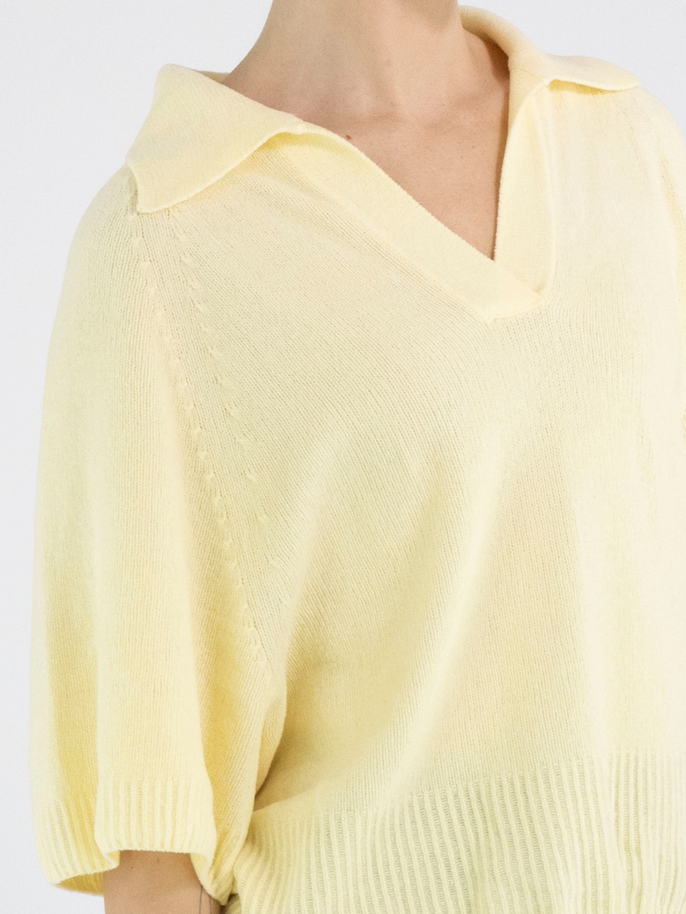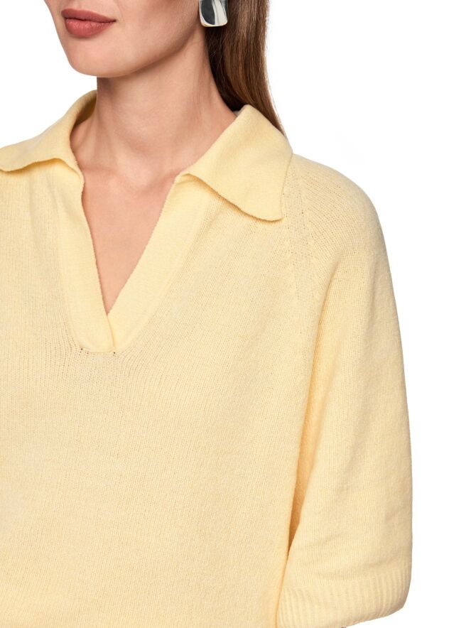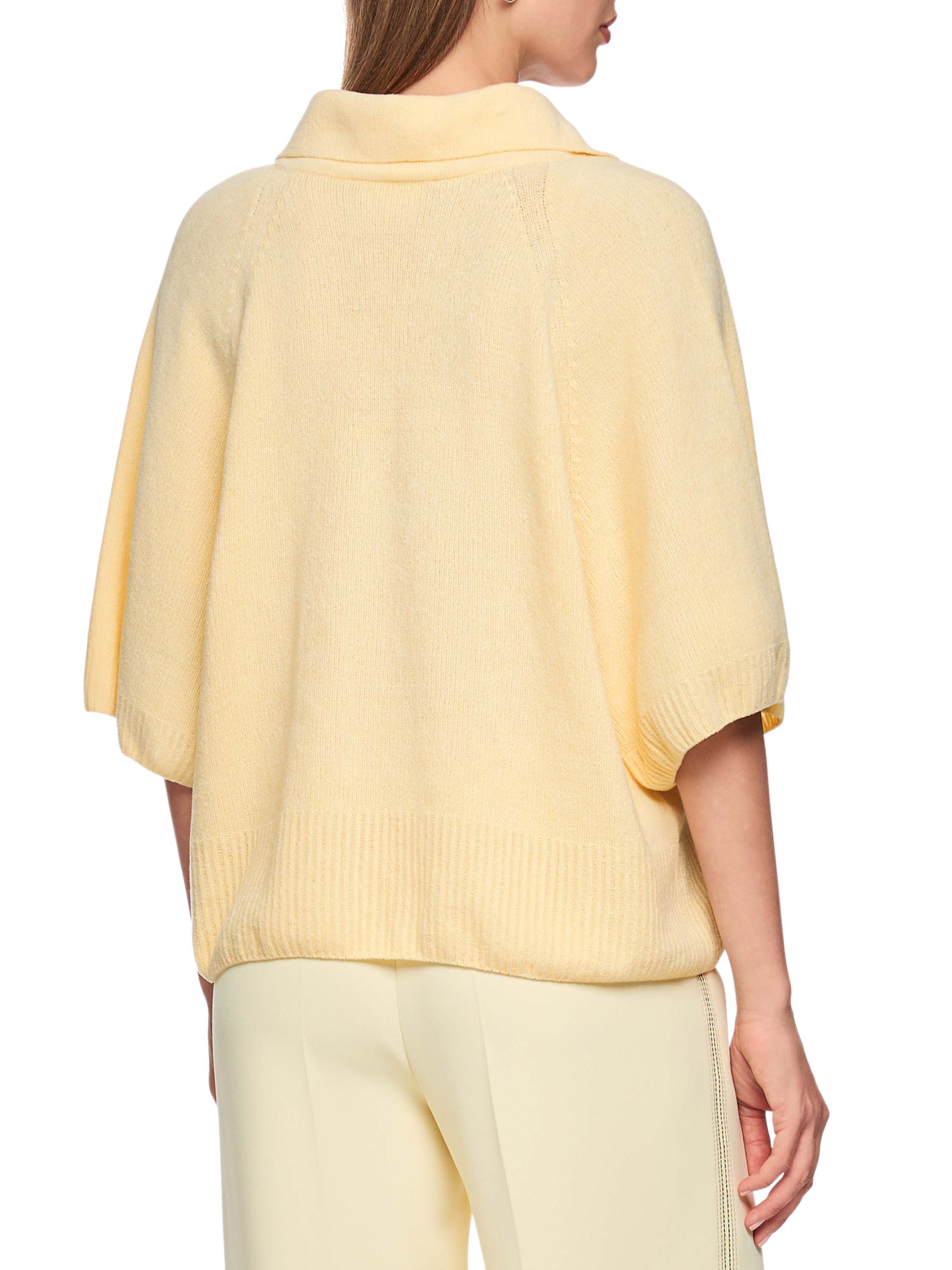Een pullover van Marc Cain in de kleur geel. De pullover heeft korte mouwen en een V-hals met een kraag. De uiteinden van de korte mouwen en de onderkant hebben een fijn geribbelde boord. Deze pullover mag op 30 graden worden gewassen.