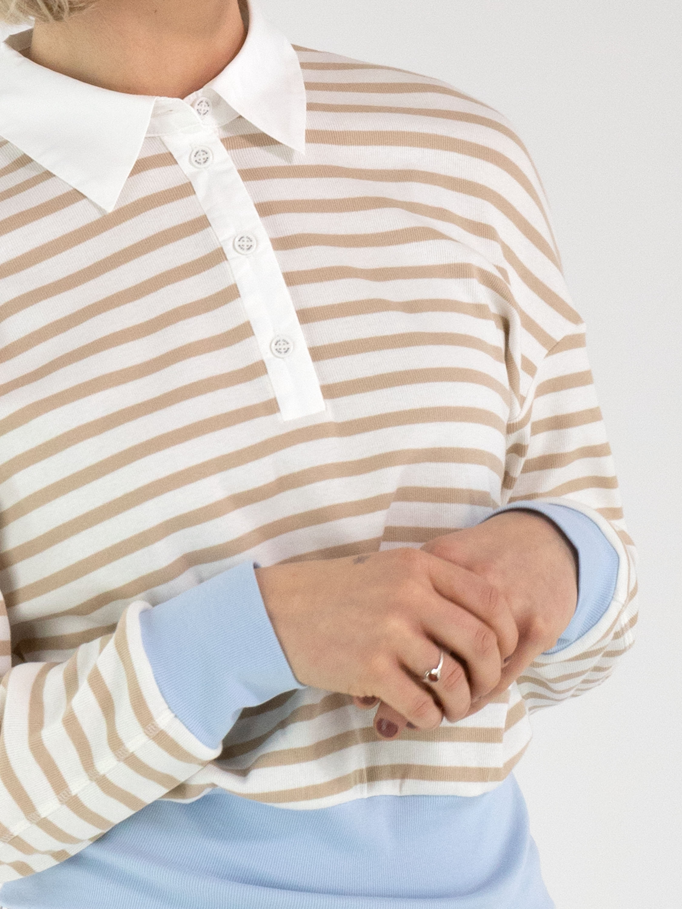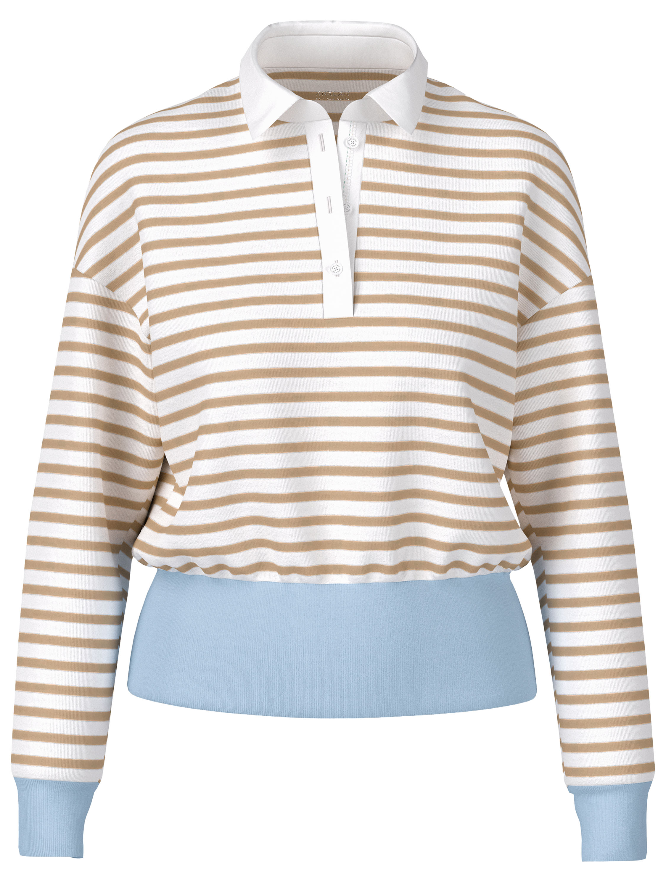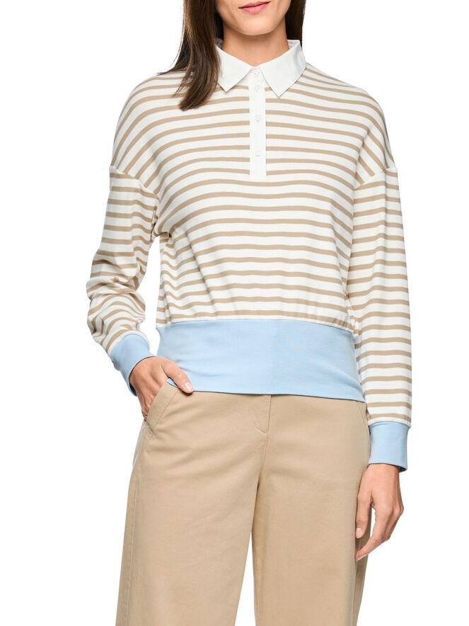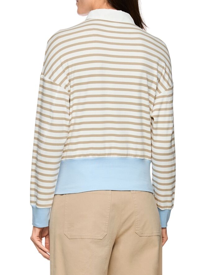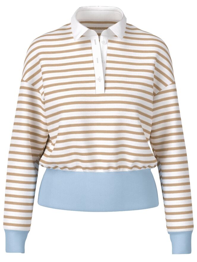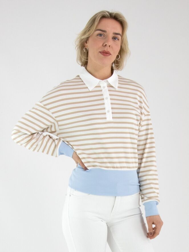 Een poloshirt van Marc Cain met een streeppatroon in de kleuren zand en roomwit. Aan de onderkant en aan de uiteinden van de lange mouwen is een brede, fijn geribbelde tricot boord verwerkt in de kleur bleu. De kraag is uitgevoerd in een effen roomwitte kleur. Dit poloshirt kan op 30 graden worden gewassen.