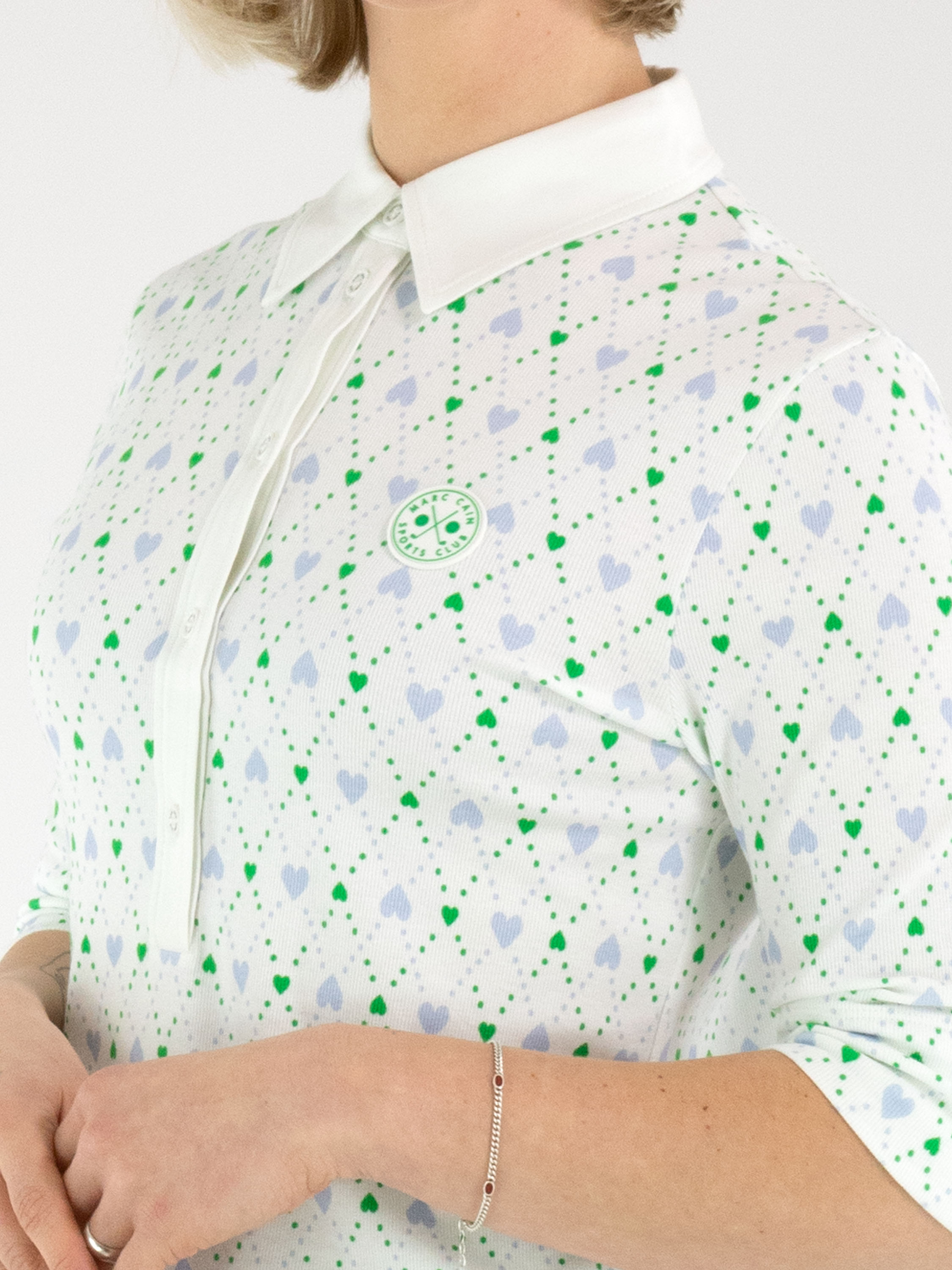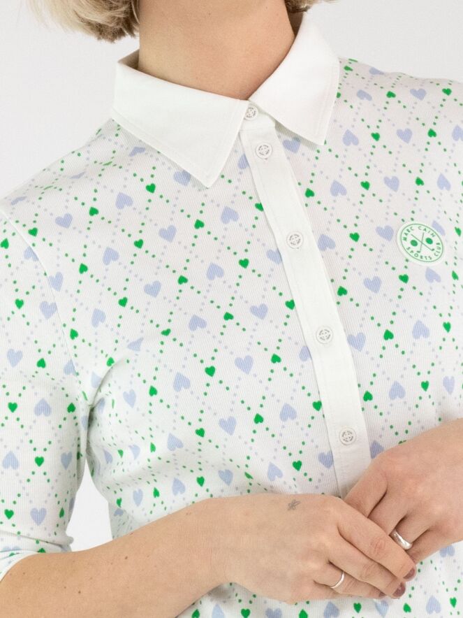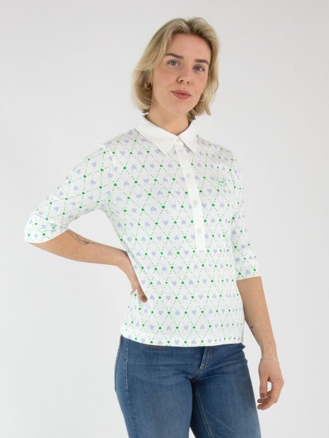 Een poloshirt van Marc Cain met een geruite print en hartjesdetail in de kleuren bleu en groen op een roomwitte achtergrond. De kraag van het shirt is uitgevoerd in een effen roomwitte stof. Dit poloshirt kan op 30 graden worden gewassen.