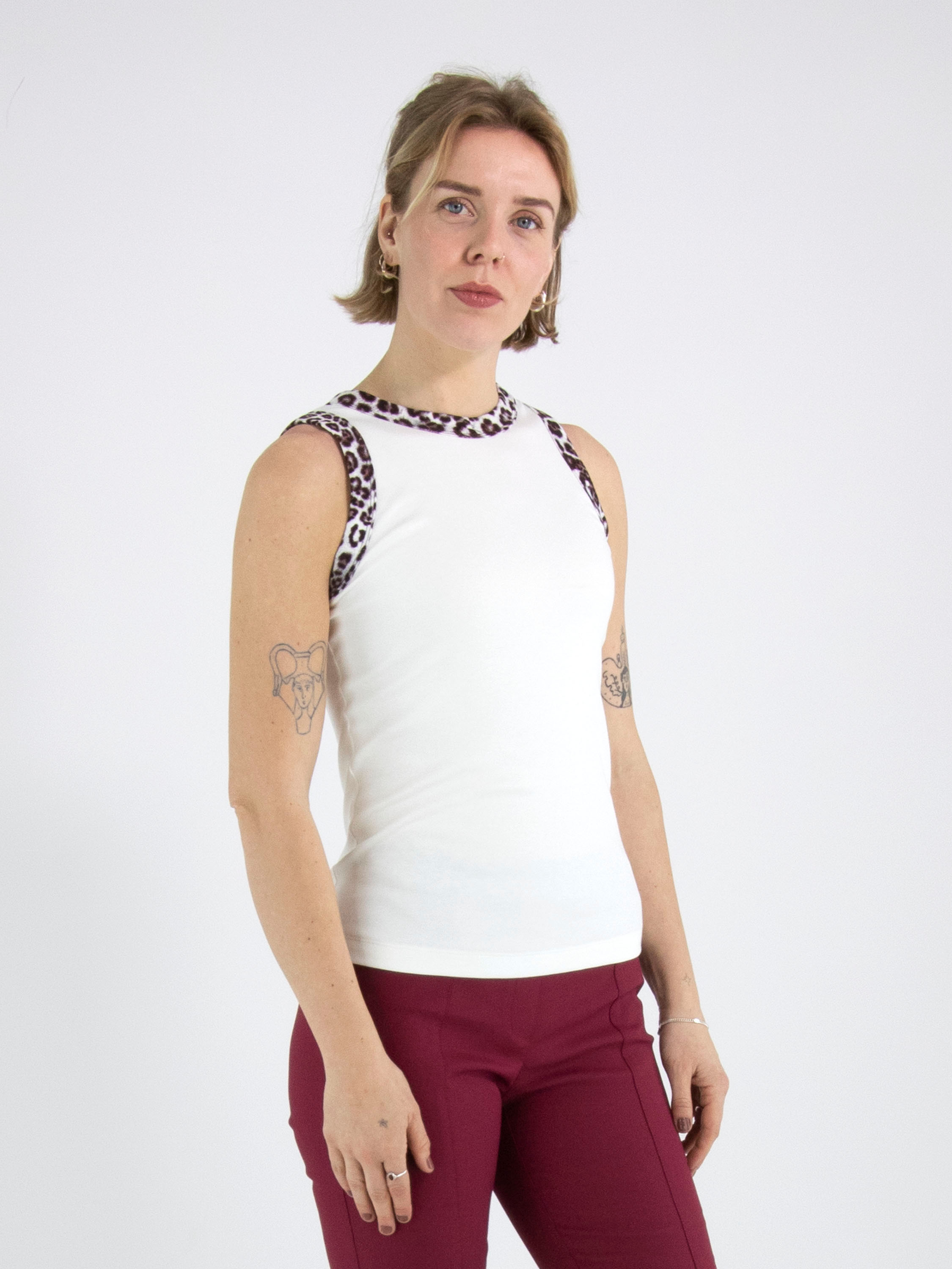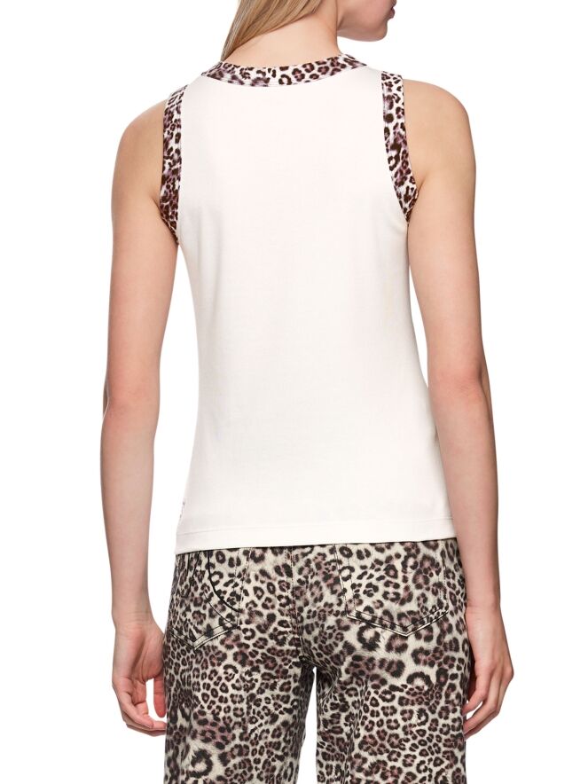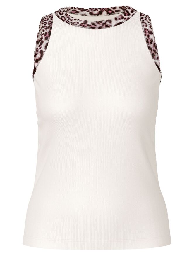 Een top van Marc Cain in een fijn geribbelde structuur in de kleur roomwit. Langs de rand van de ronde hals en de mouwinzet is een fijn geribbelde tricot bies in een panterprint met meerdere tinten grijs, bordeauxrood en roomwit. Deze top mag op 30 graden worden gewassen.