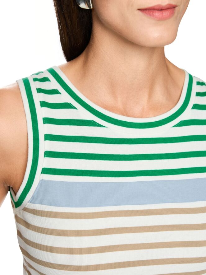 Een top van Marc Cain in een fijn geribbelde stof met een streeppatroon in de kleuren zand, bleu en groen op een roomwitte achtergrond. Langs de rand van de ronde hals en de mouwinzet is een fijn geribbelde tricot boord verwerkt. Deze top kan op 30 graden worden gewassen.