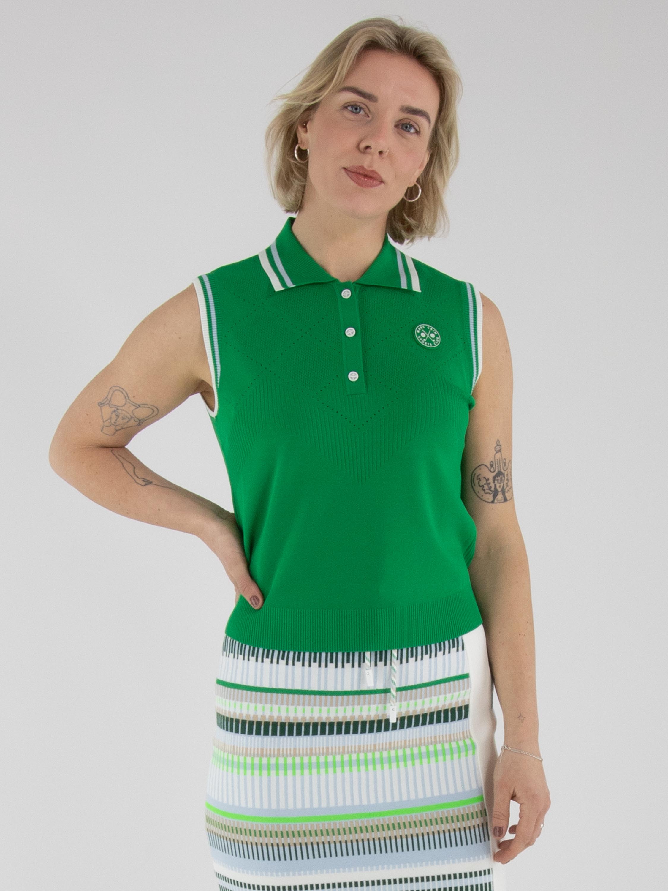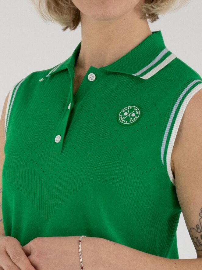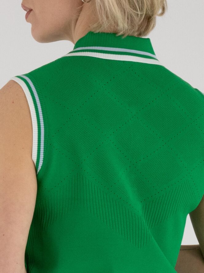 Een top van Marc Cain in de kleur groen. De kraag en de rand van de mouwinzet zijn uitgevoerd in een fijn geribbelde tricot stof met een streeppatroon in de kleuren bleu, roomwit en groen. Vanuit de schouders tot onder de buste heeft de stof een ruitvormig ajourpatroon dat fijn is geperforeerd. Deze top kan met de hand worden gewassen.