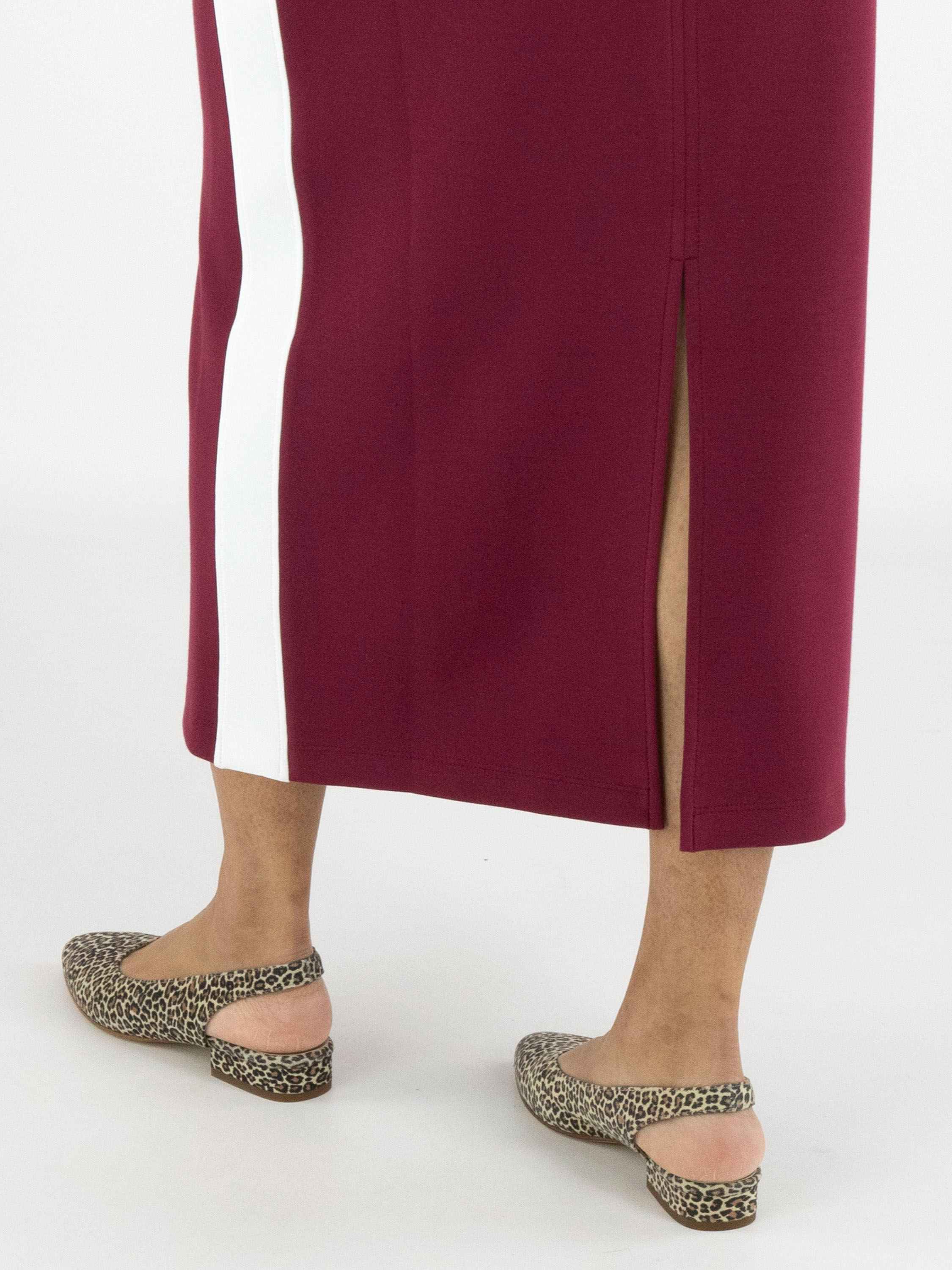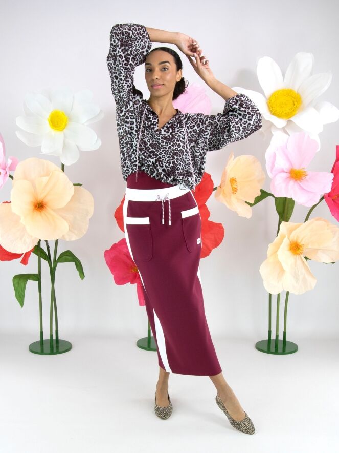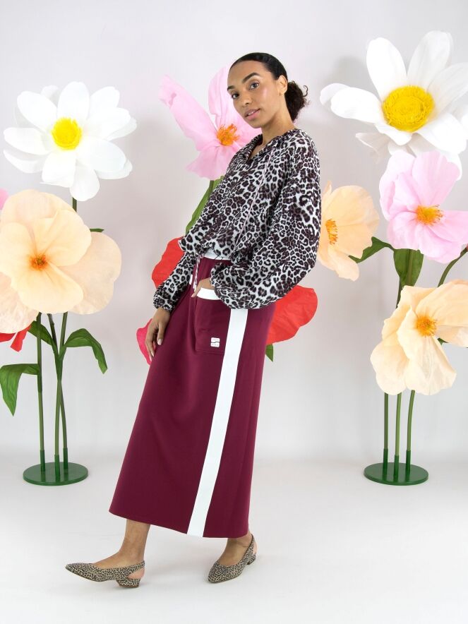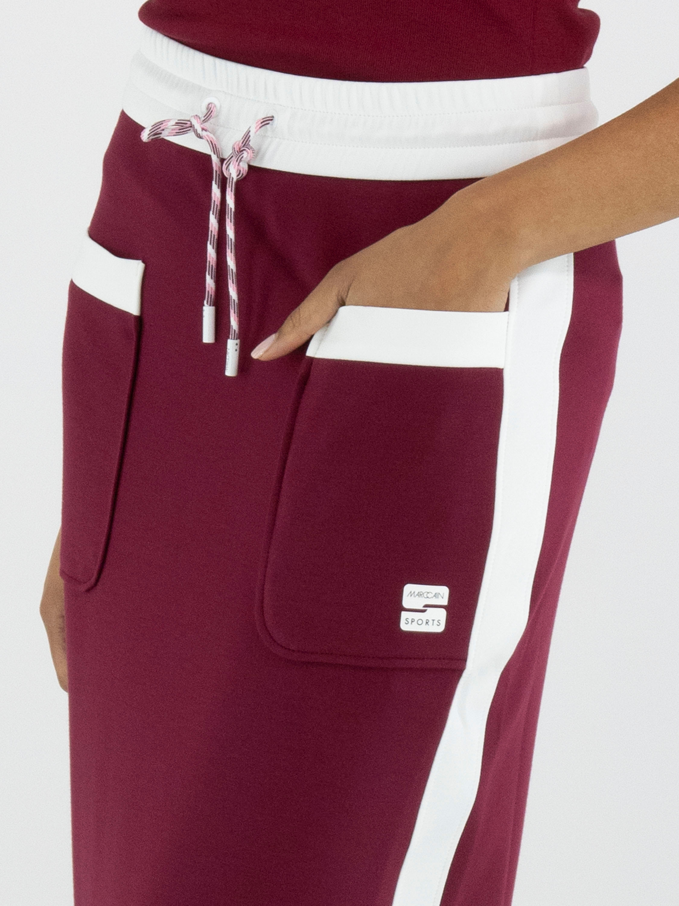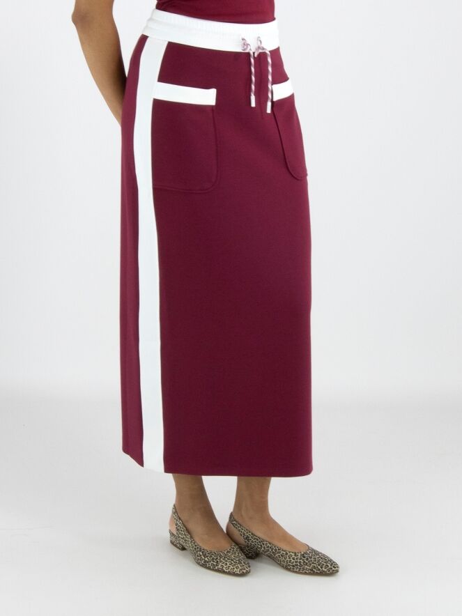 Een rok van Marc Cain in een bordeauxrode kleur. In de taille is een brede, fijn geplooide roomwitte elastische band met een koord in een tunnelverwerking. Langs de zijkanten is een roomwitte bies. Aan de achterkant is een split tot onder de knie. Deze rok mag op 30 graden worden gewassen.