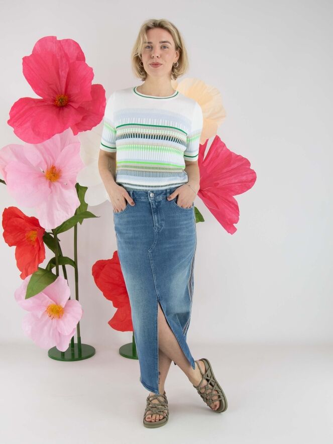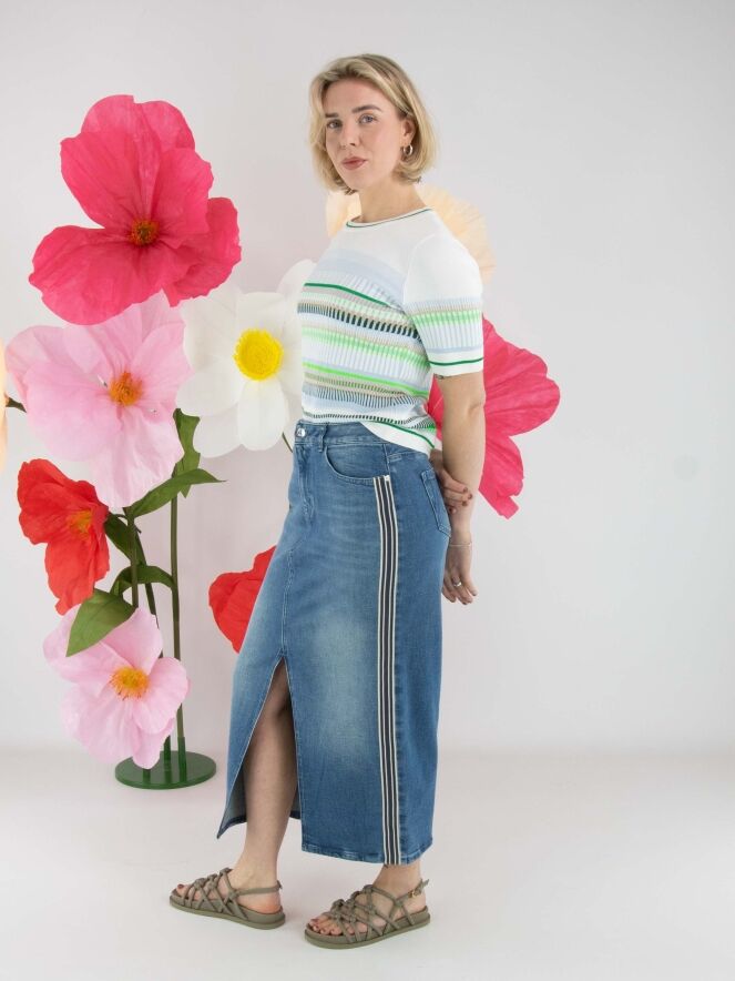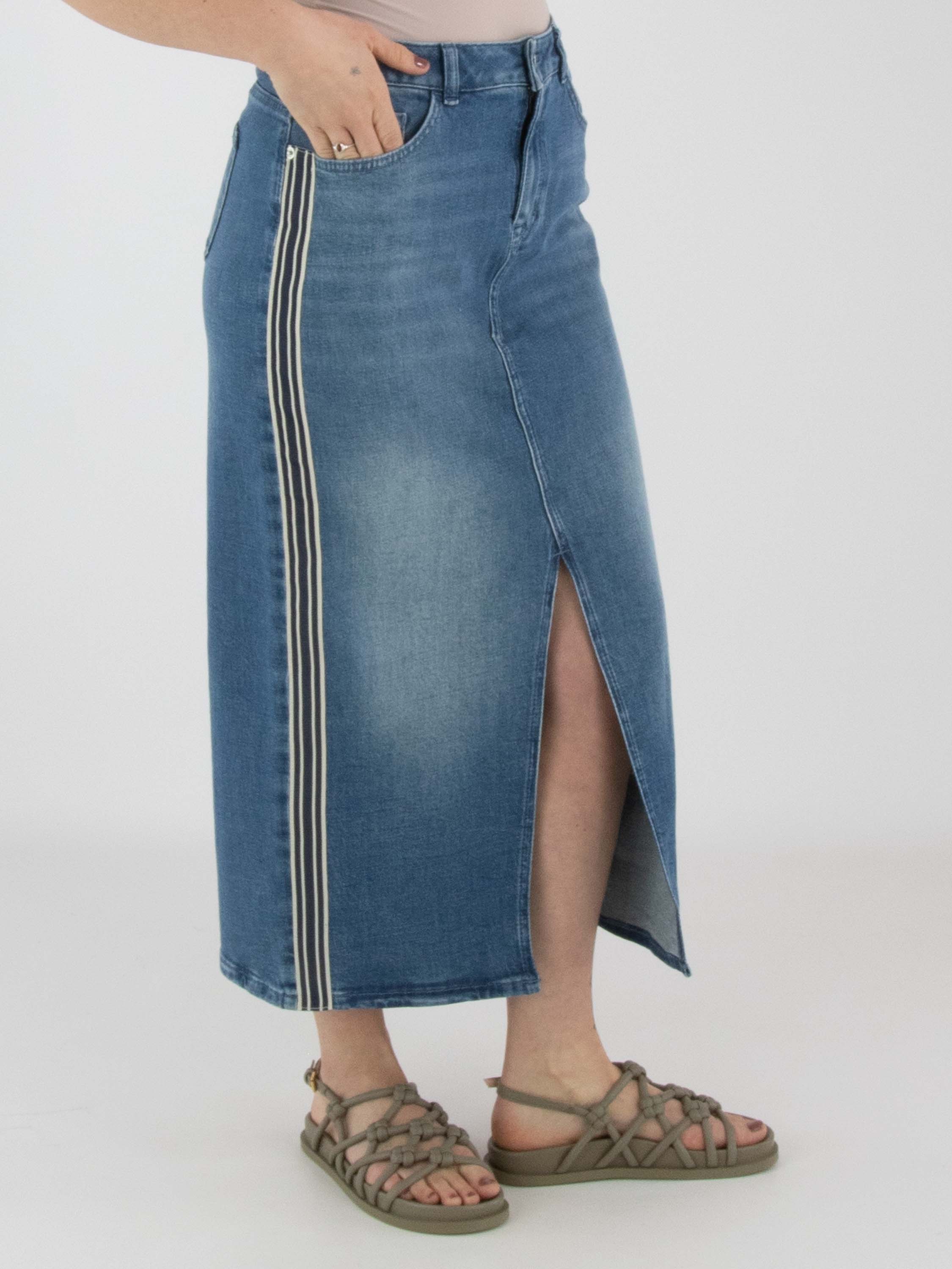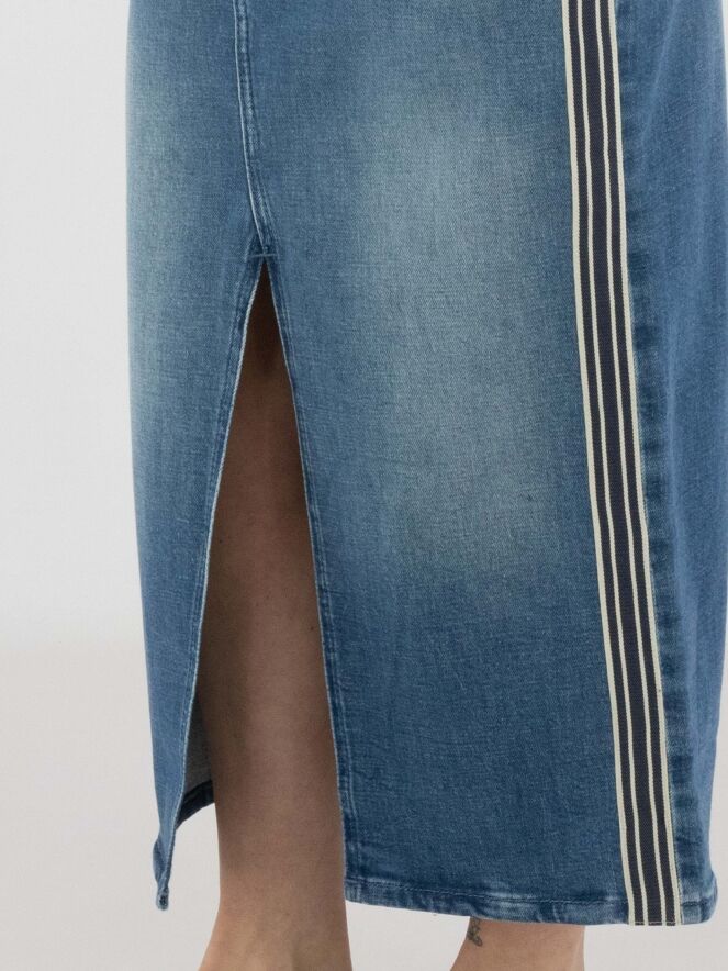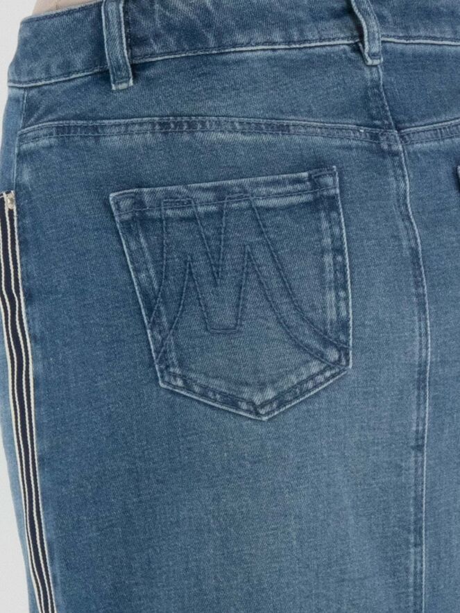 Een rok van Marc Cain in een basic jeanskleur. In het midden van de voorzijde bevindt zich een split tot net onder de knie. Aan beide zijkanten is een brede bies verwerkt met een streeppatroon in de kleuren beige en dark denim. Deze rok kan op 30 graden worden gewassen.