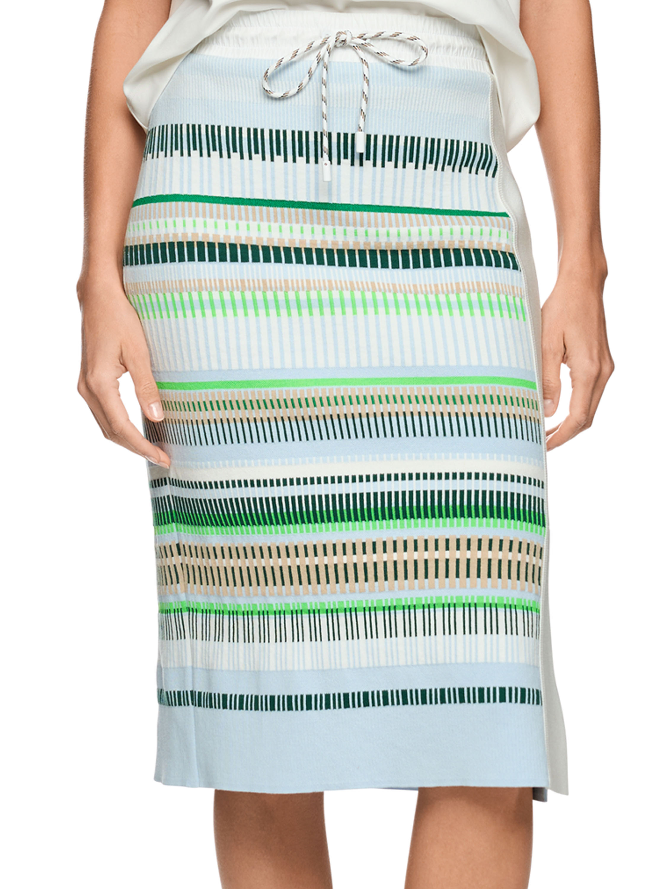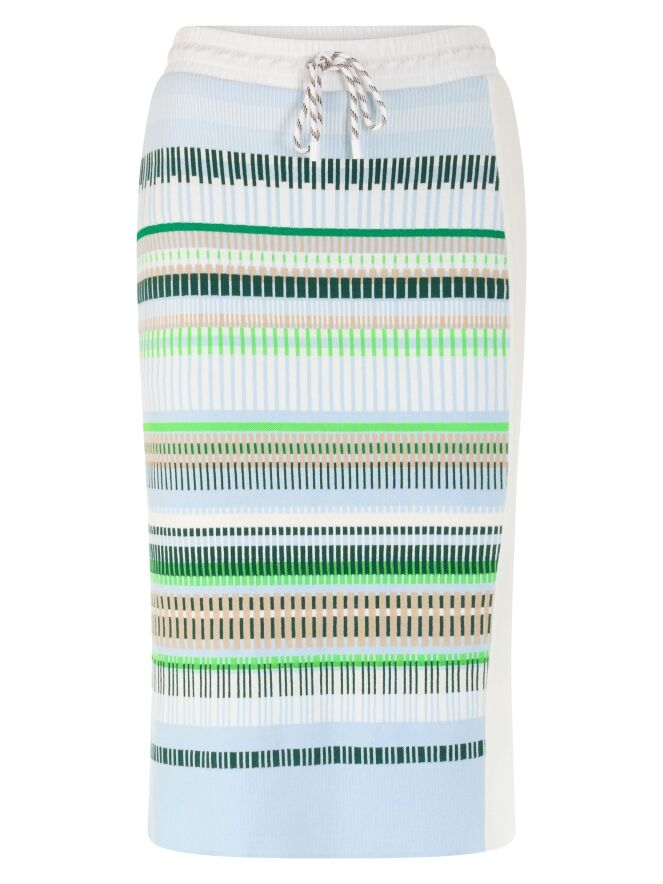 Een rok van Marc Cain met een streeppatroon in de kleuren bleu, zand, licht- en donkergroen en wit. In de taille zit een witte elastische tailleband van parachutestof met een koord in tunnelverwerking. Aan de linkerzijde bevindt zich aan de voorzijde een brede verticale bies in roomwit, waaronder vanaf de knie een split is verwerkt. De rok is gevoerd en kan op 30 graden worden gewassen.
