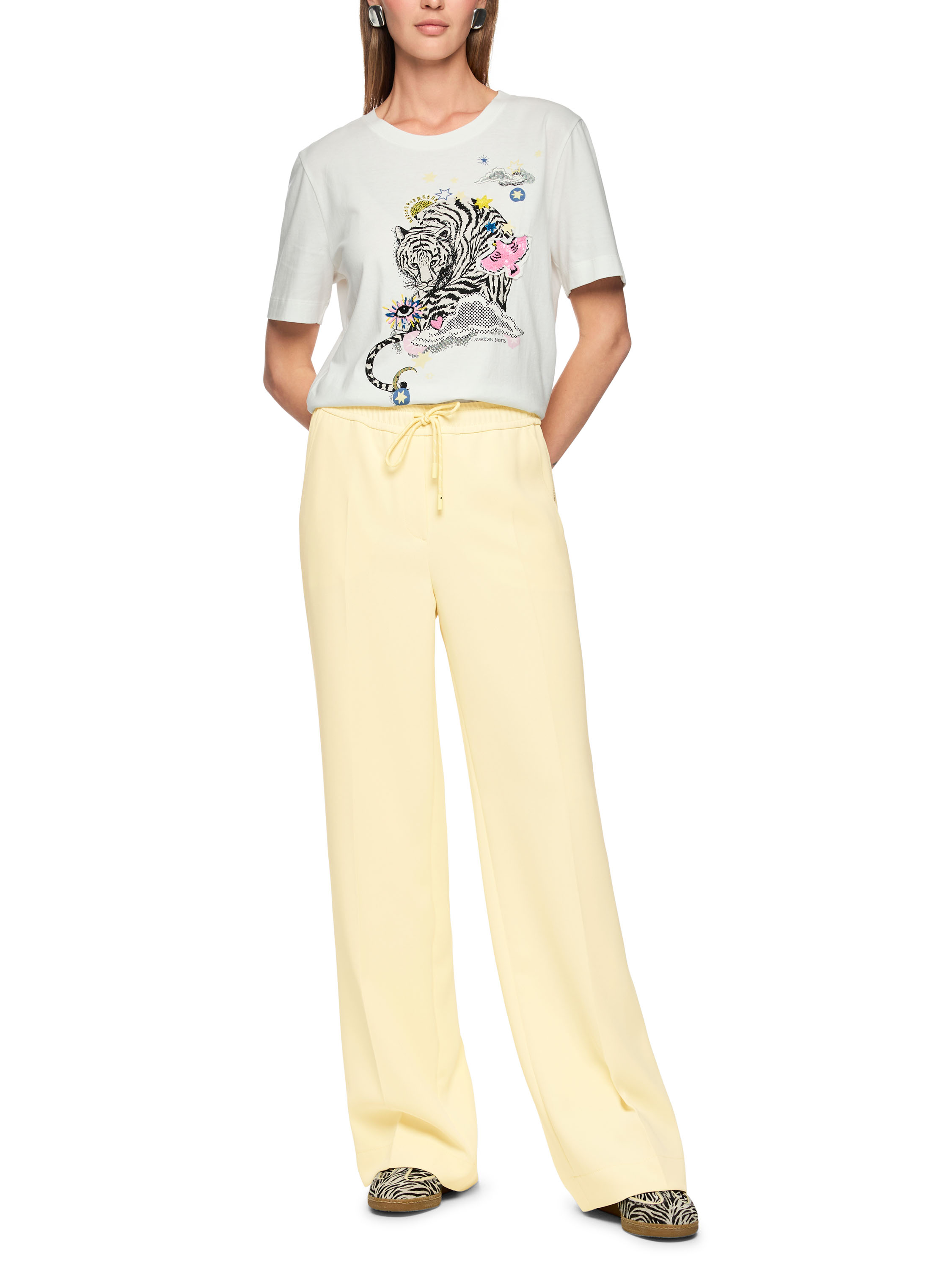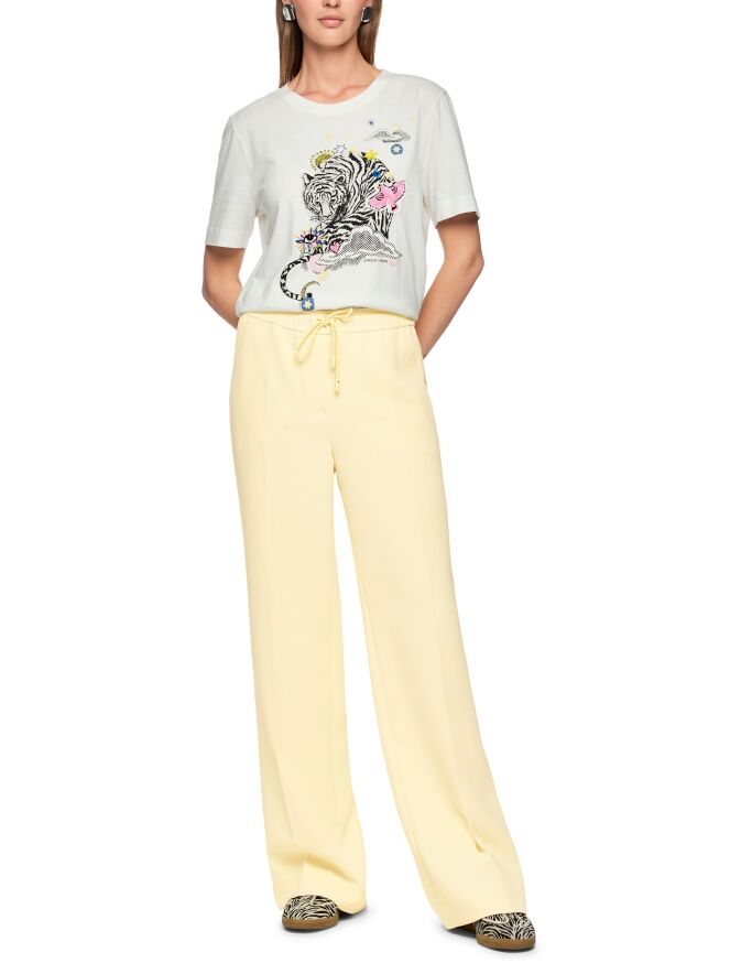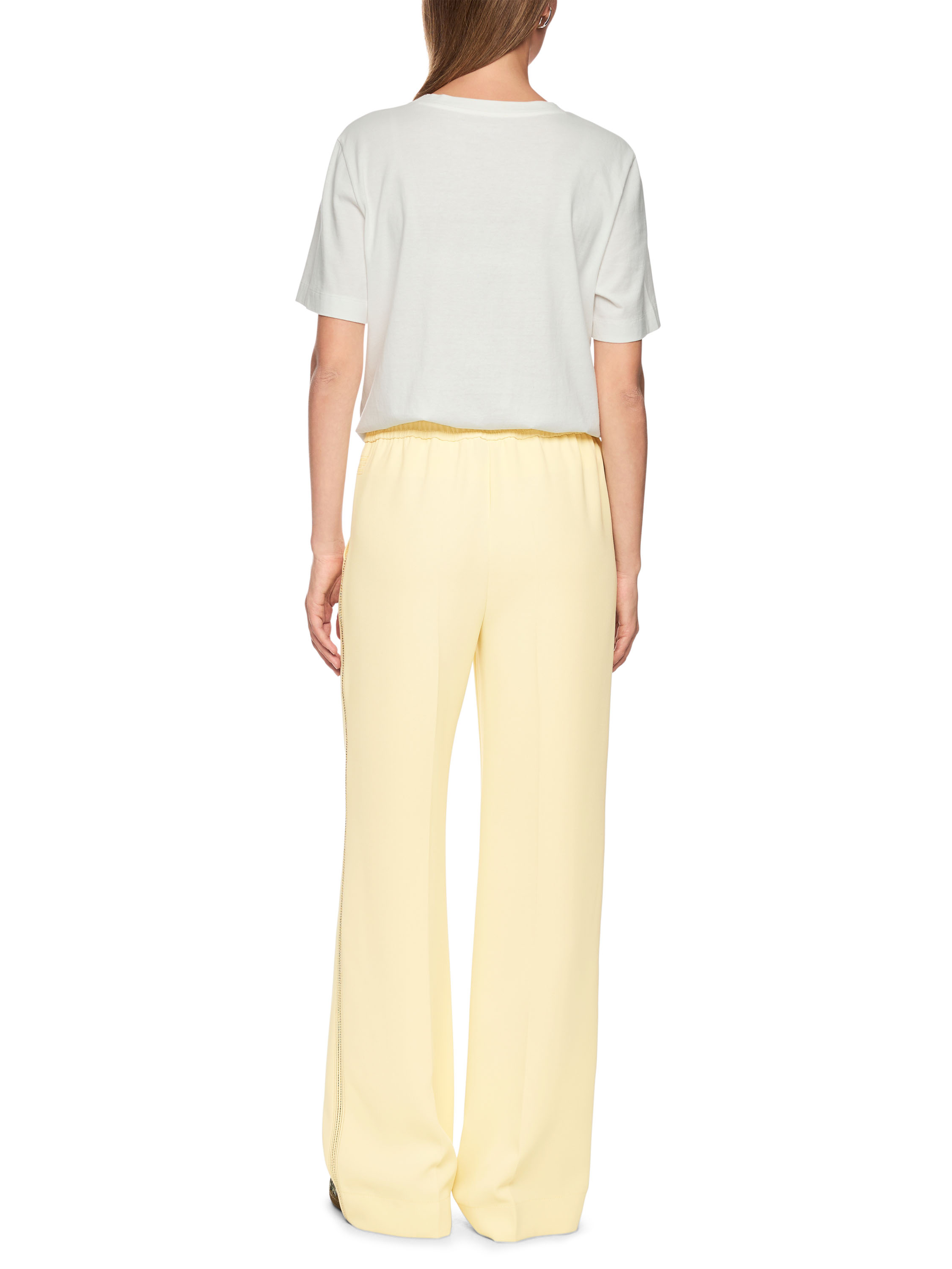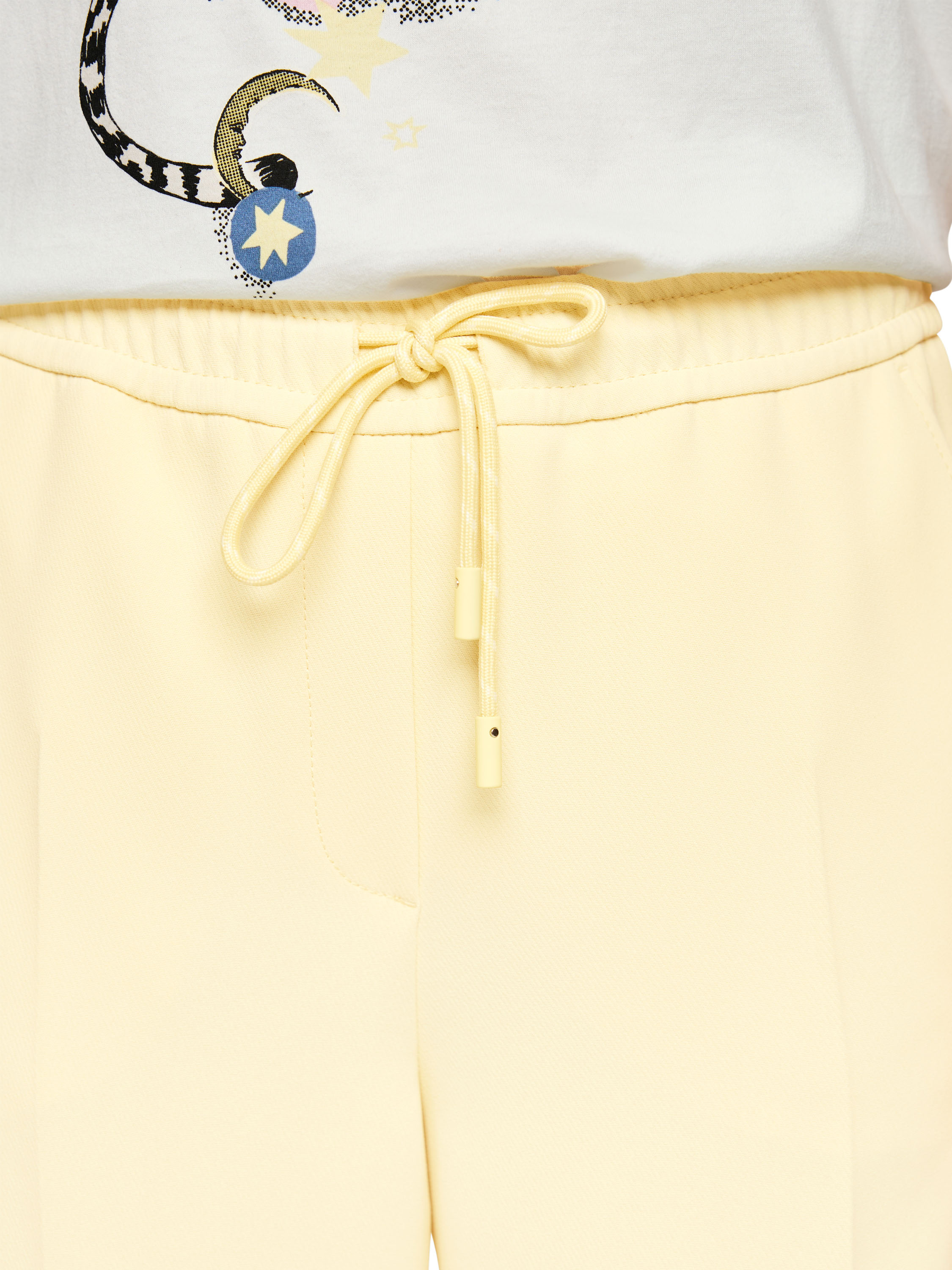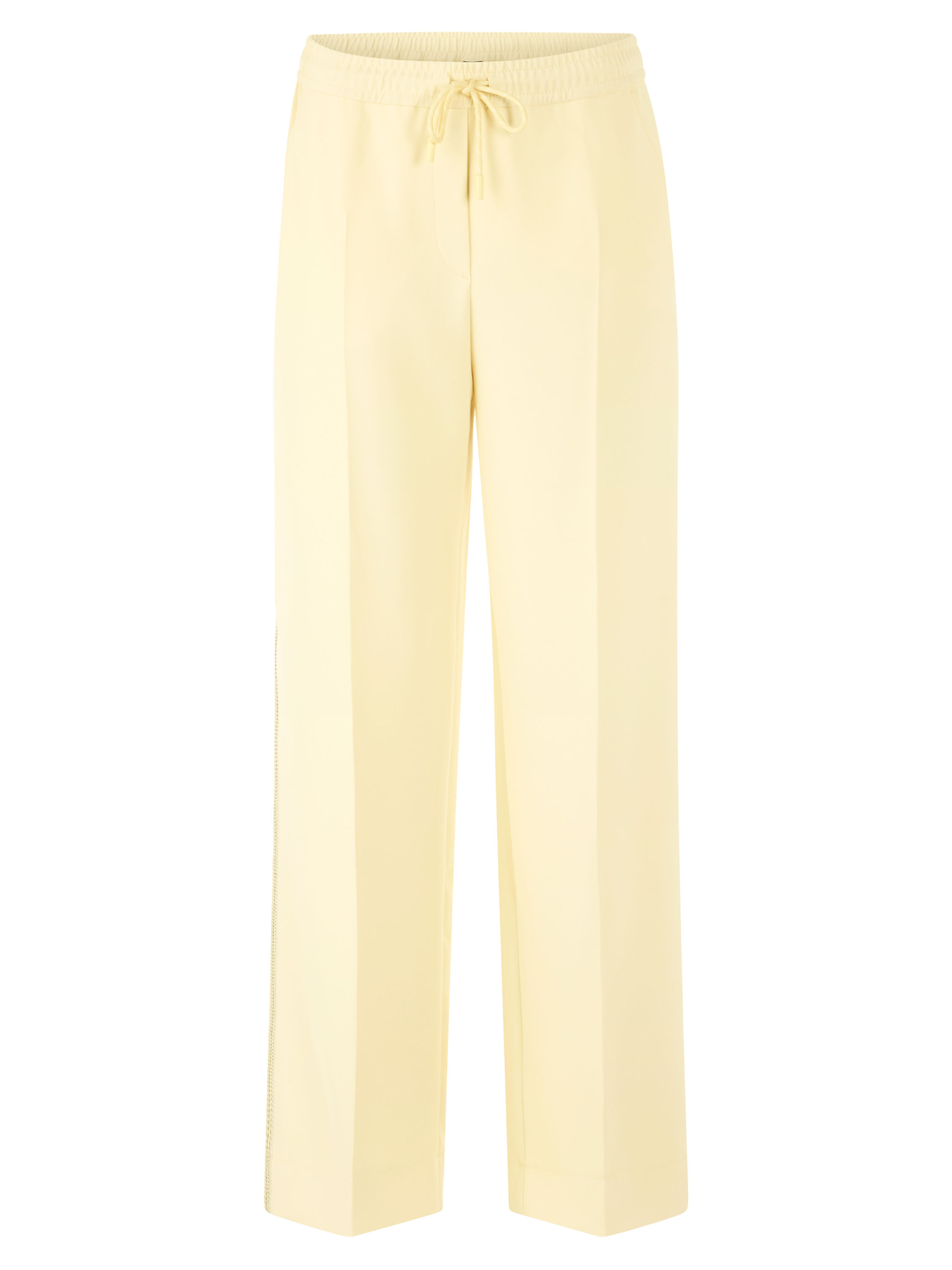 Een joggingbroek van Marc Cain in een pastelgele kleur. In de taille is een fijn geplooide elastische band met een koord in een tunnelverwerking. In het midden van de recht gesneden pijpen is een ingestreken plooi. De broek heeft steekzakken en langs de zijkanten is een bies met drie stikdraden in een zandkleur. Deze broek mag op 30 graden worden gewassen.