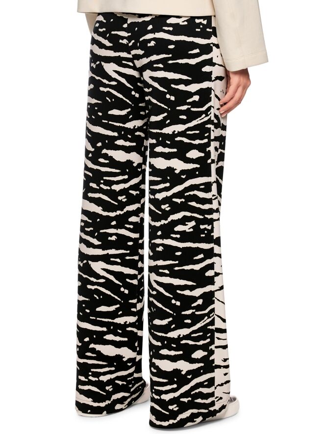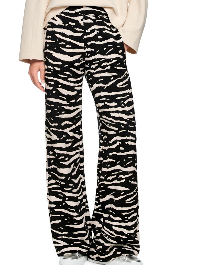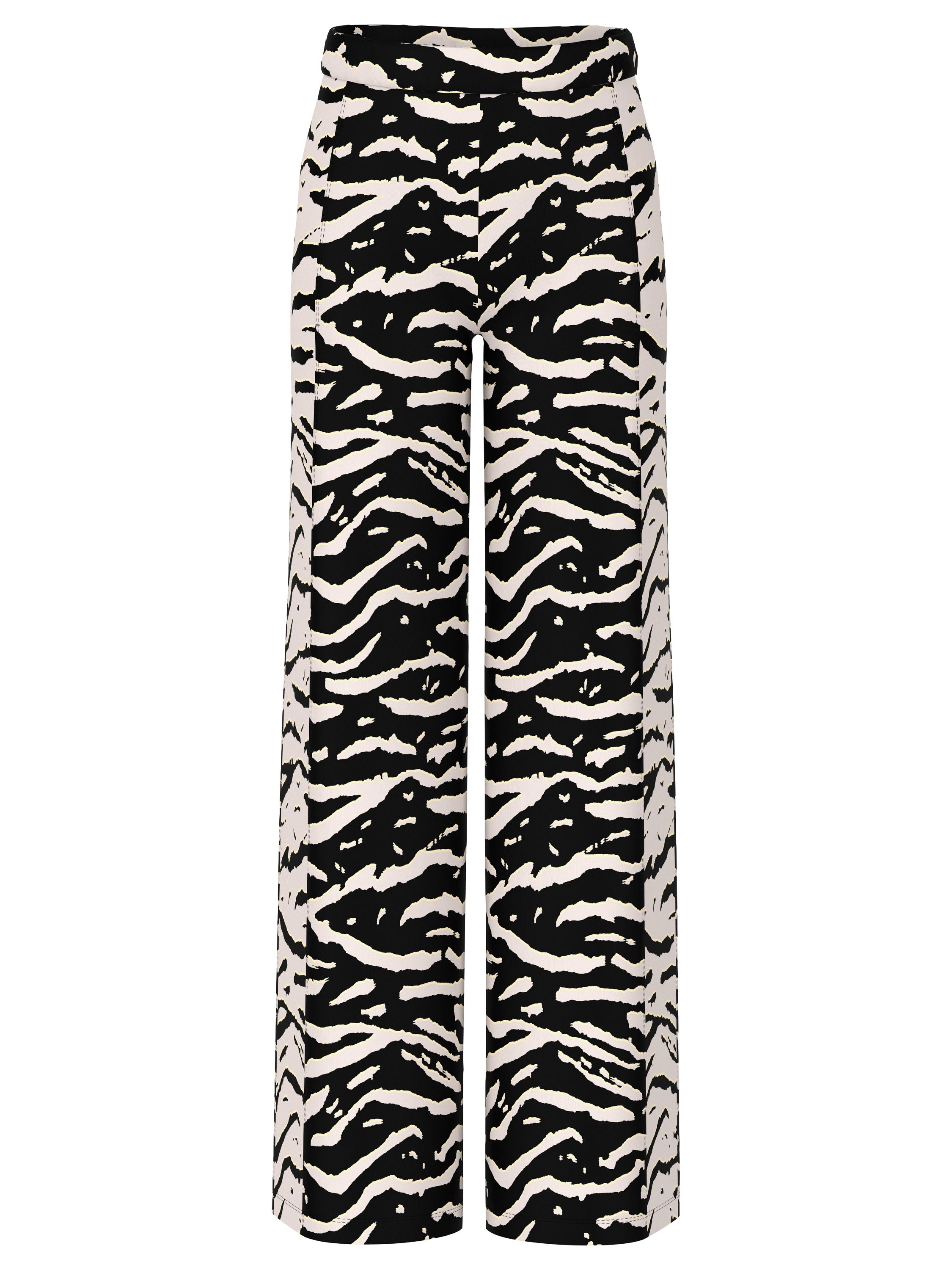 Een joggingbroek in een scuba kwaliteit van Marc Cain in een zebraprint met de kleuren zwart en beige. In de taille is een elastische band. Langs de zijkanten is een brede bies waar de zebraprint recto verso is qua kleur. De broek heeft steekzakken en mag op 30 graden worden gewassen.