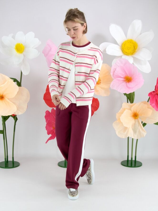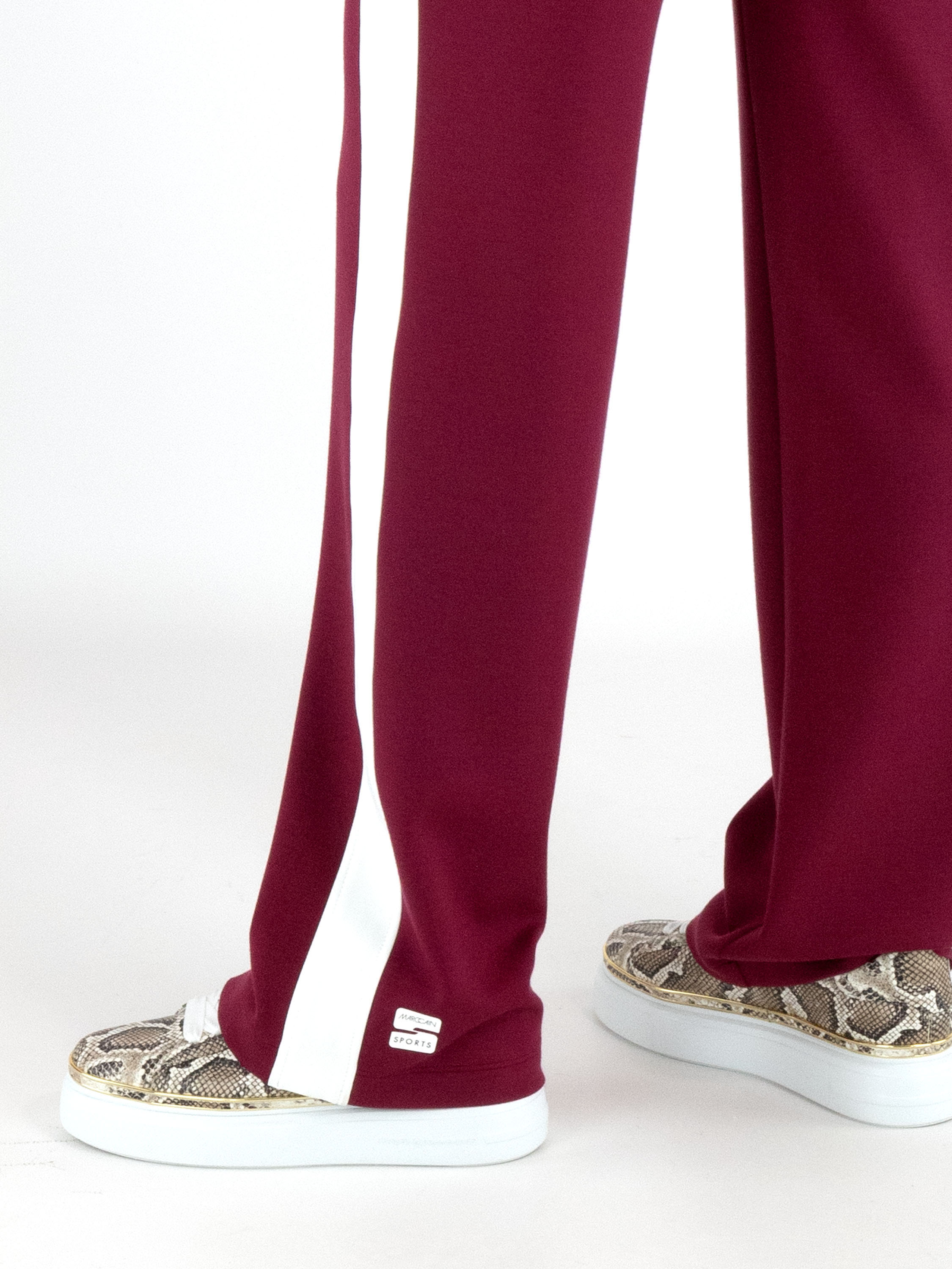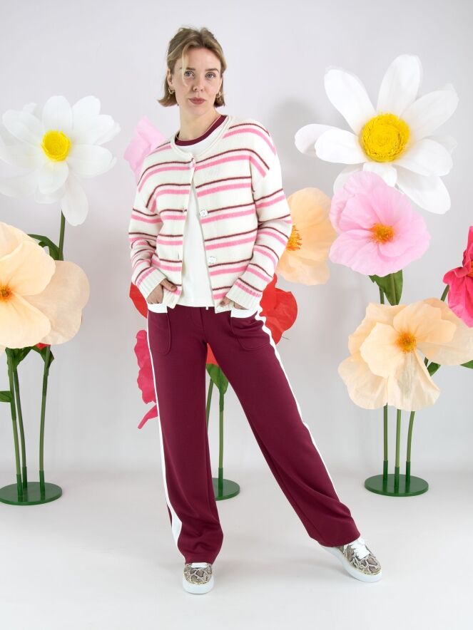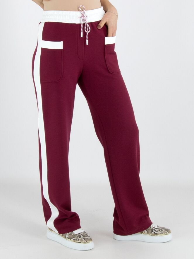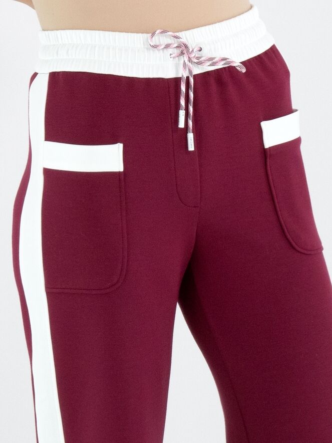 Een joggingbroek van Marc Cain in de kleur bordeauxrood. In de taille is een brede, fijn geplooide roomwitte elastische band. In de band is een koord in een tunnelverwerking. Langs de recht gesneden pijpen is aan de zijkanten een brede roomwitte bies. Deze broek mag op 30 graden worden gewassen.