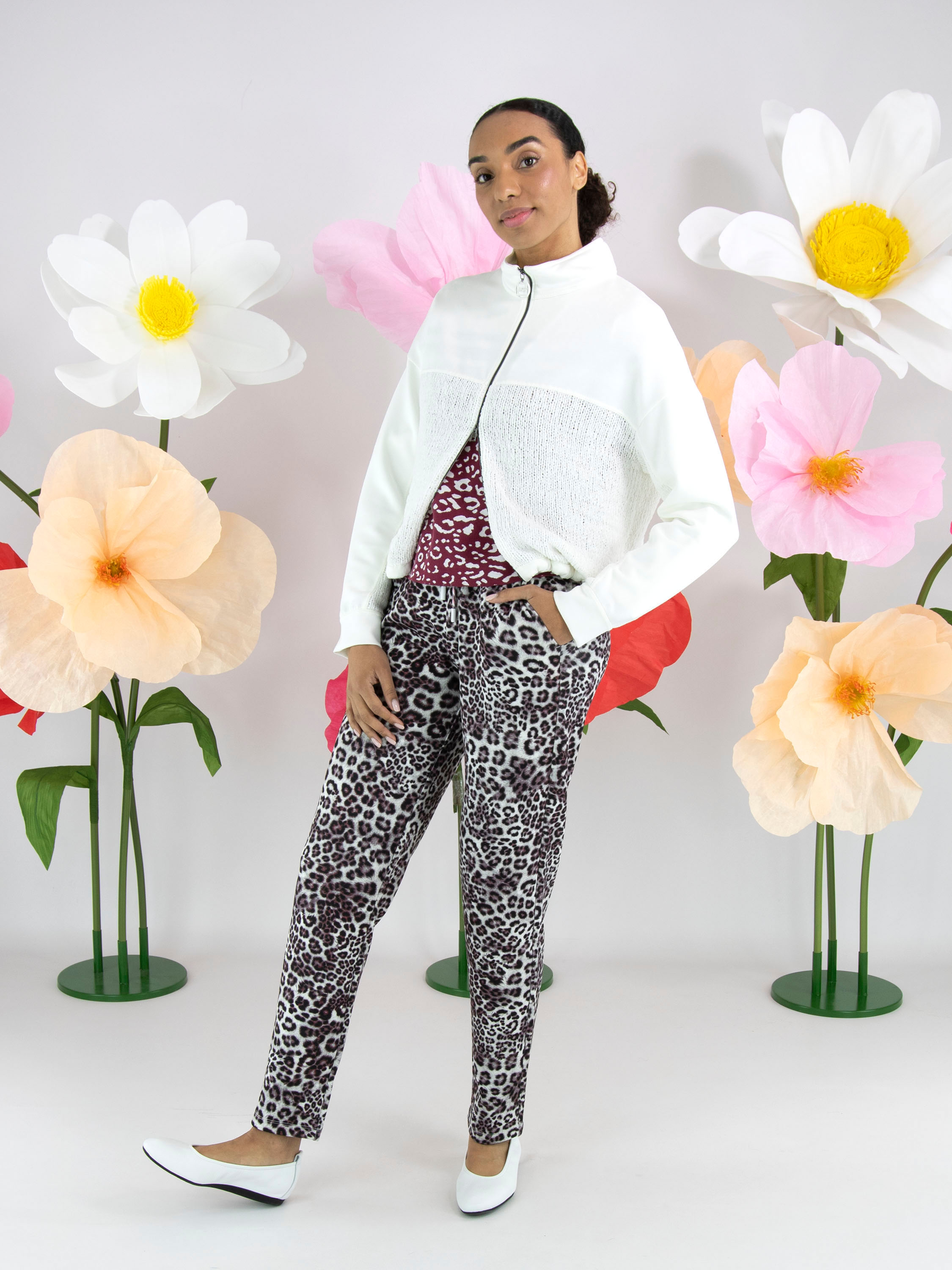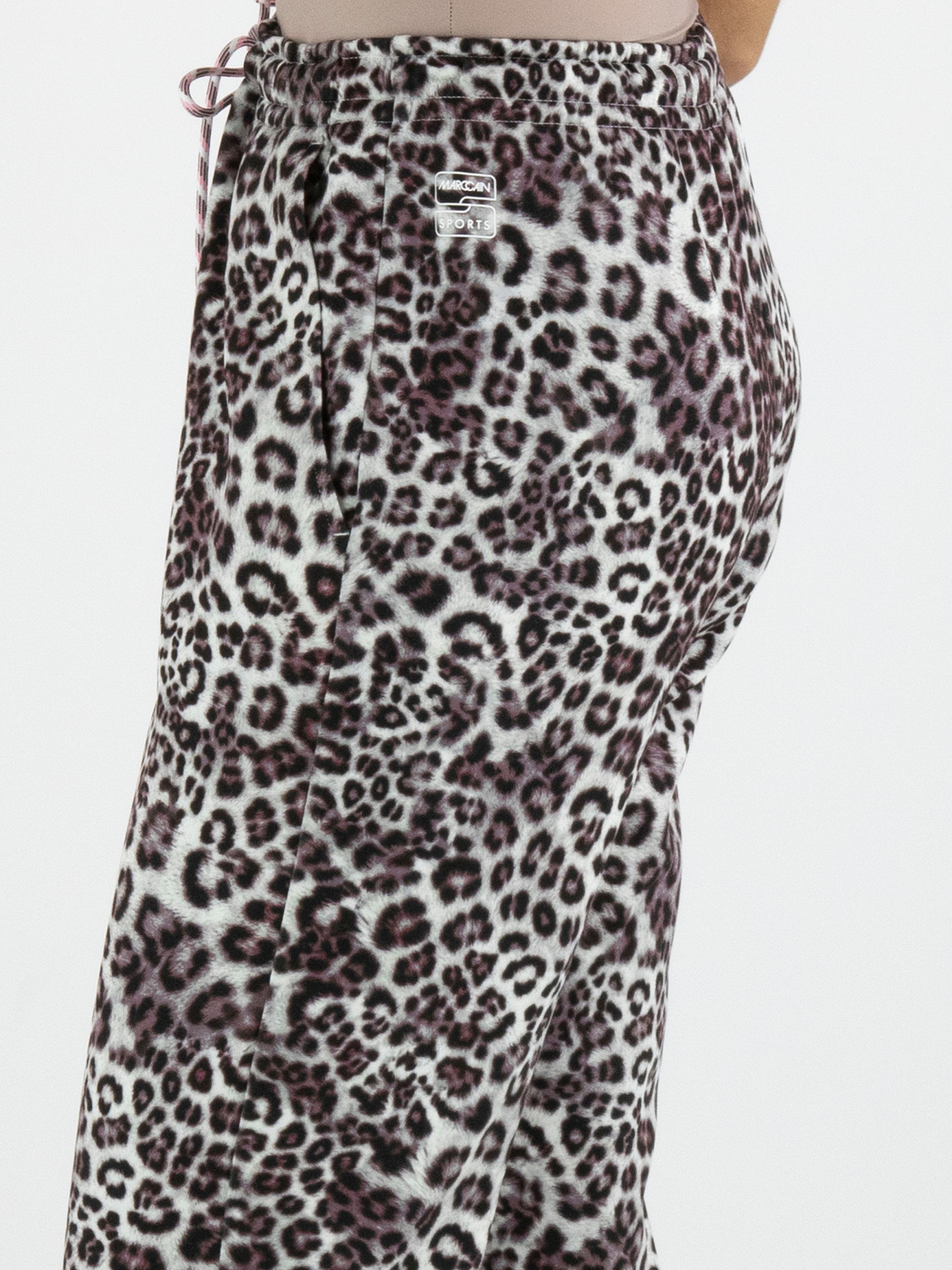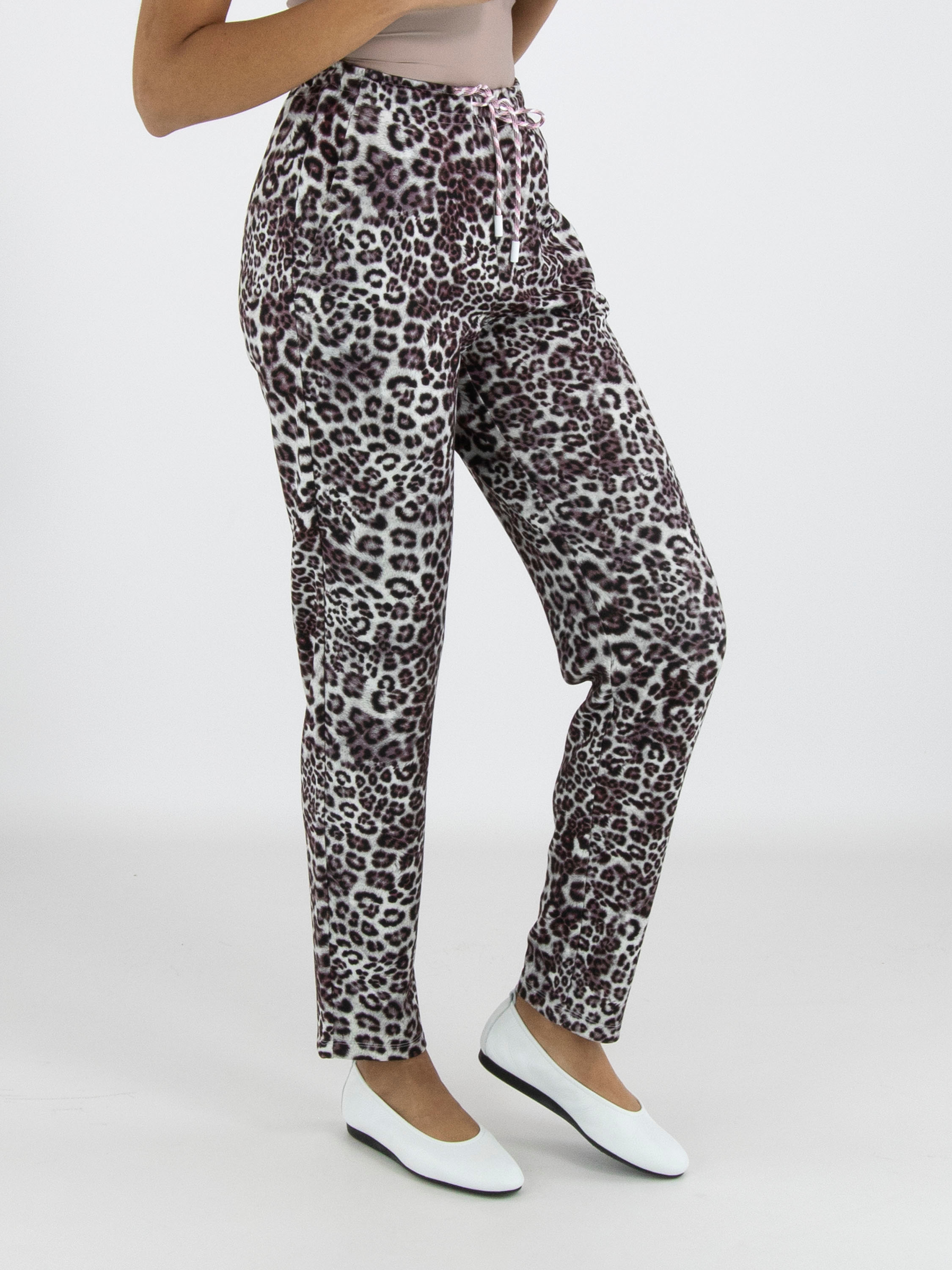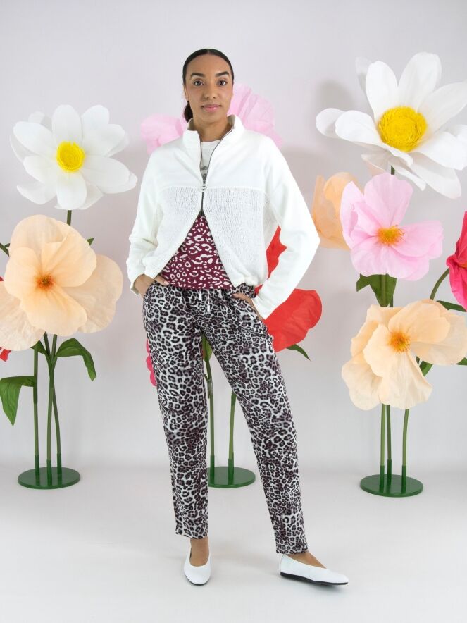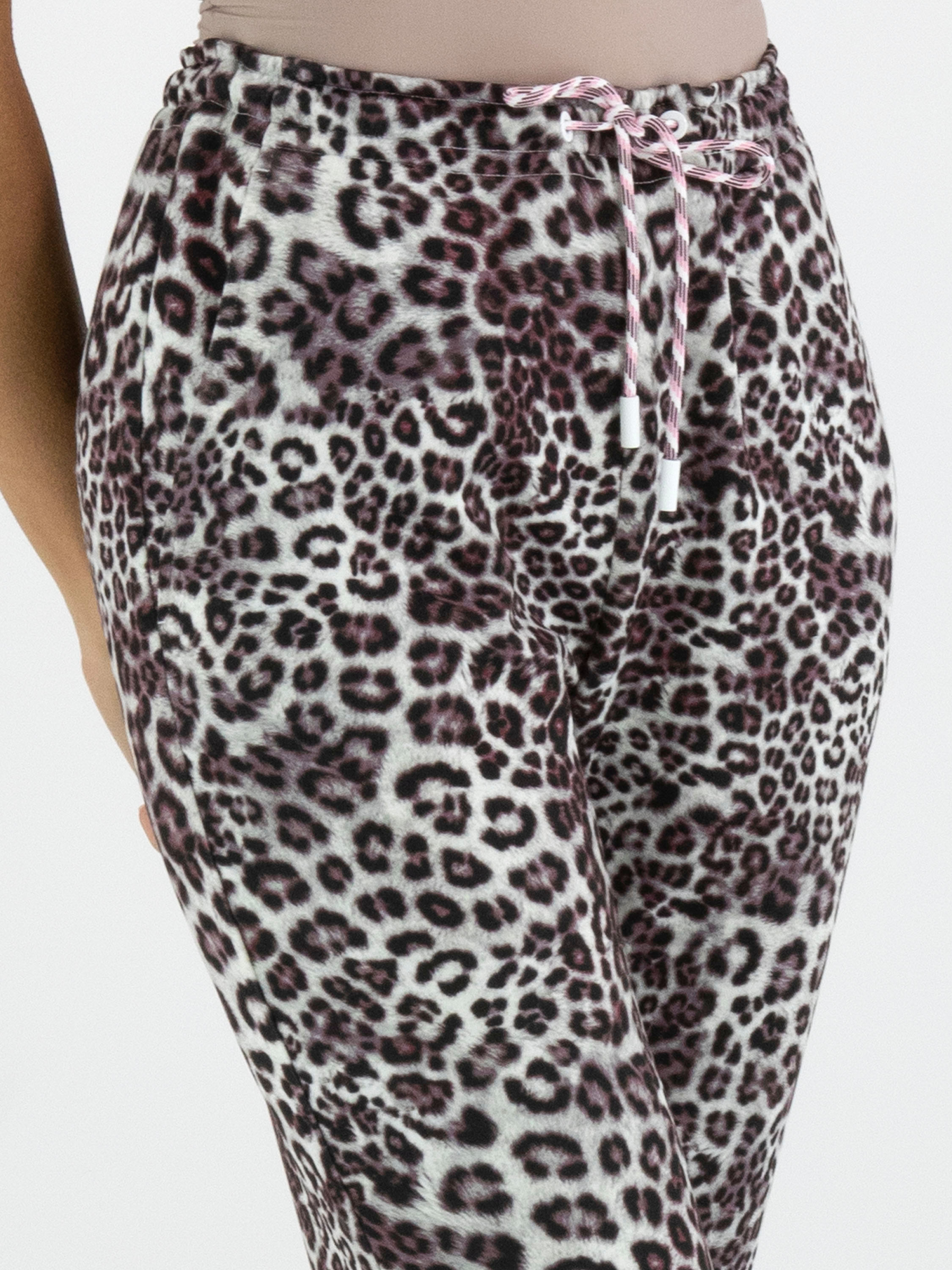 Een broek in een scuba kwaliteit van Marc Cain in een panterprint met meerdere tinten grijs, bordeauxrood en wit. In de taille is een elastische band met een koord in een tunnelverwerking. De broek heeft steekzakken en mag op 30 graden worden gewassen.