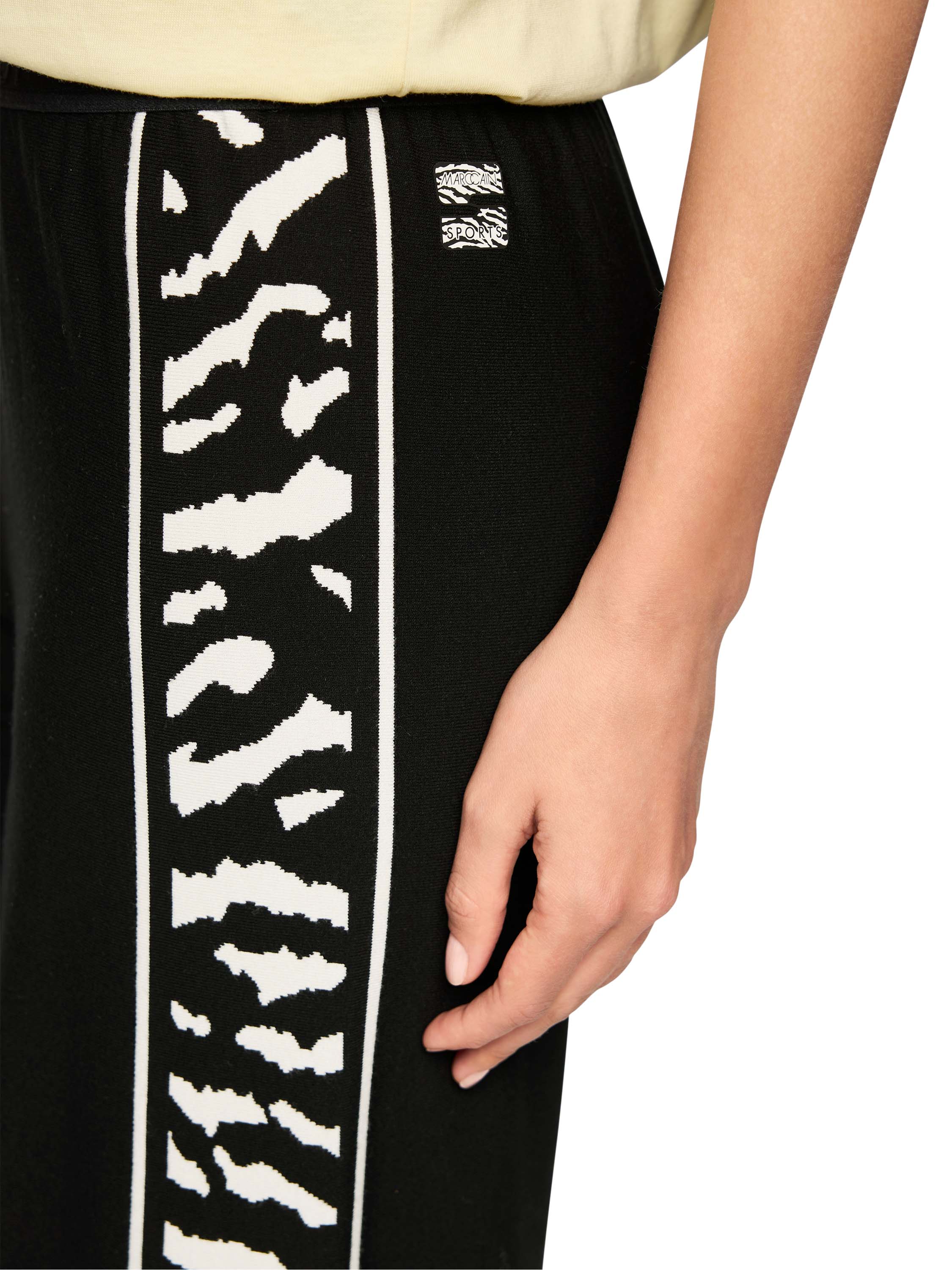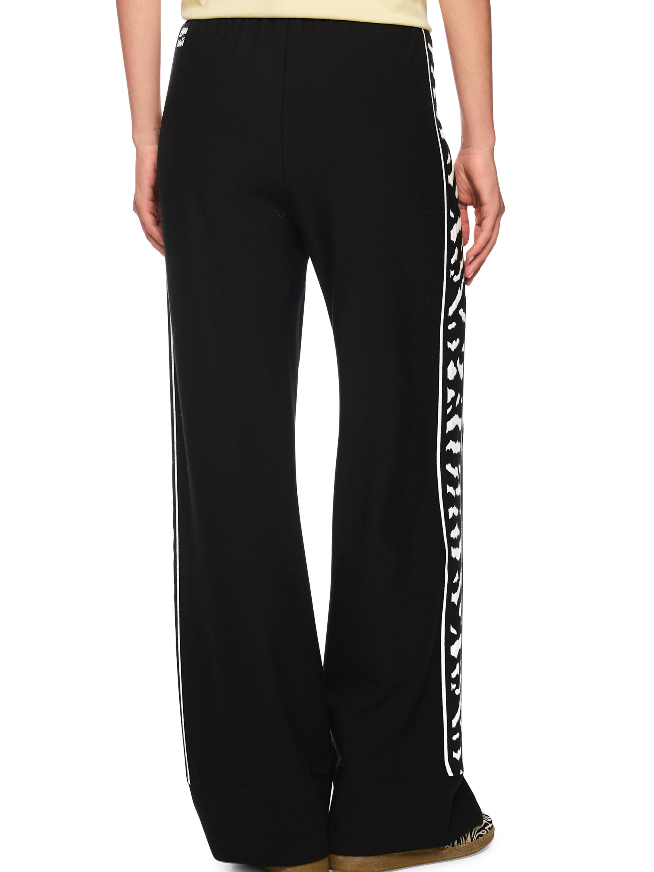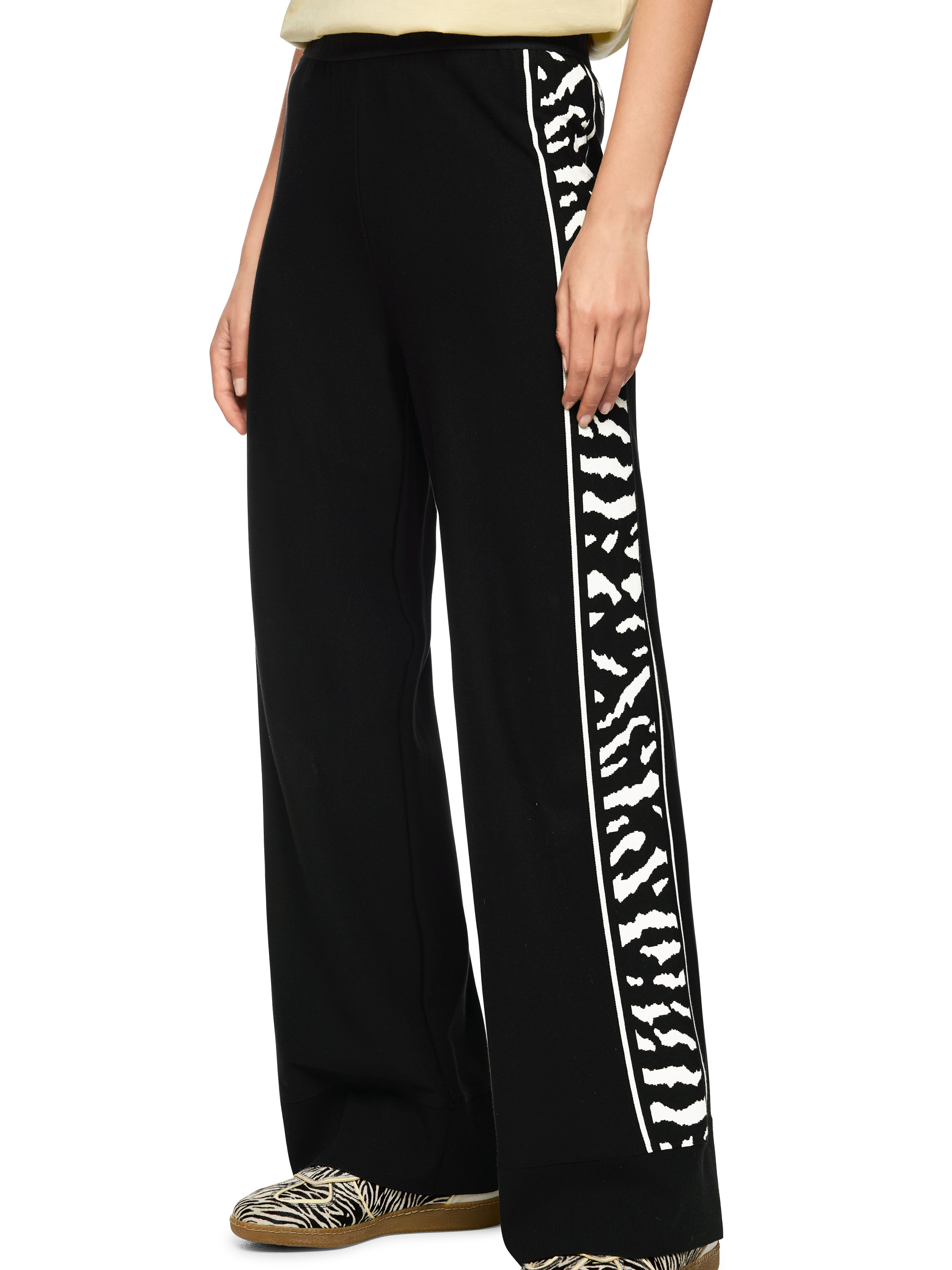 Een joggingbroek van Marc Cain in de kleur zwart. In de taille is een elastieken band. Langs de zijkanten is een brede bies in een zebraprint met de kleuren zwart en beige. Aan de onderkant van de pijpen is een brede fijn geribbelde tricot boord. Deze broek mag op 30 graden worden gewassen.