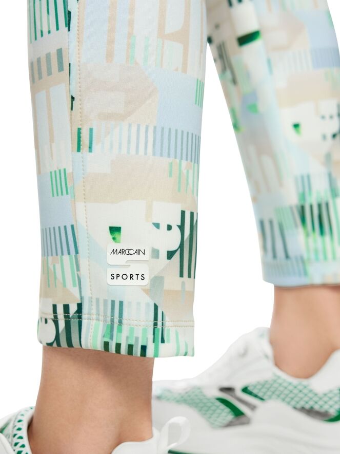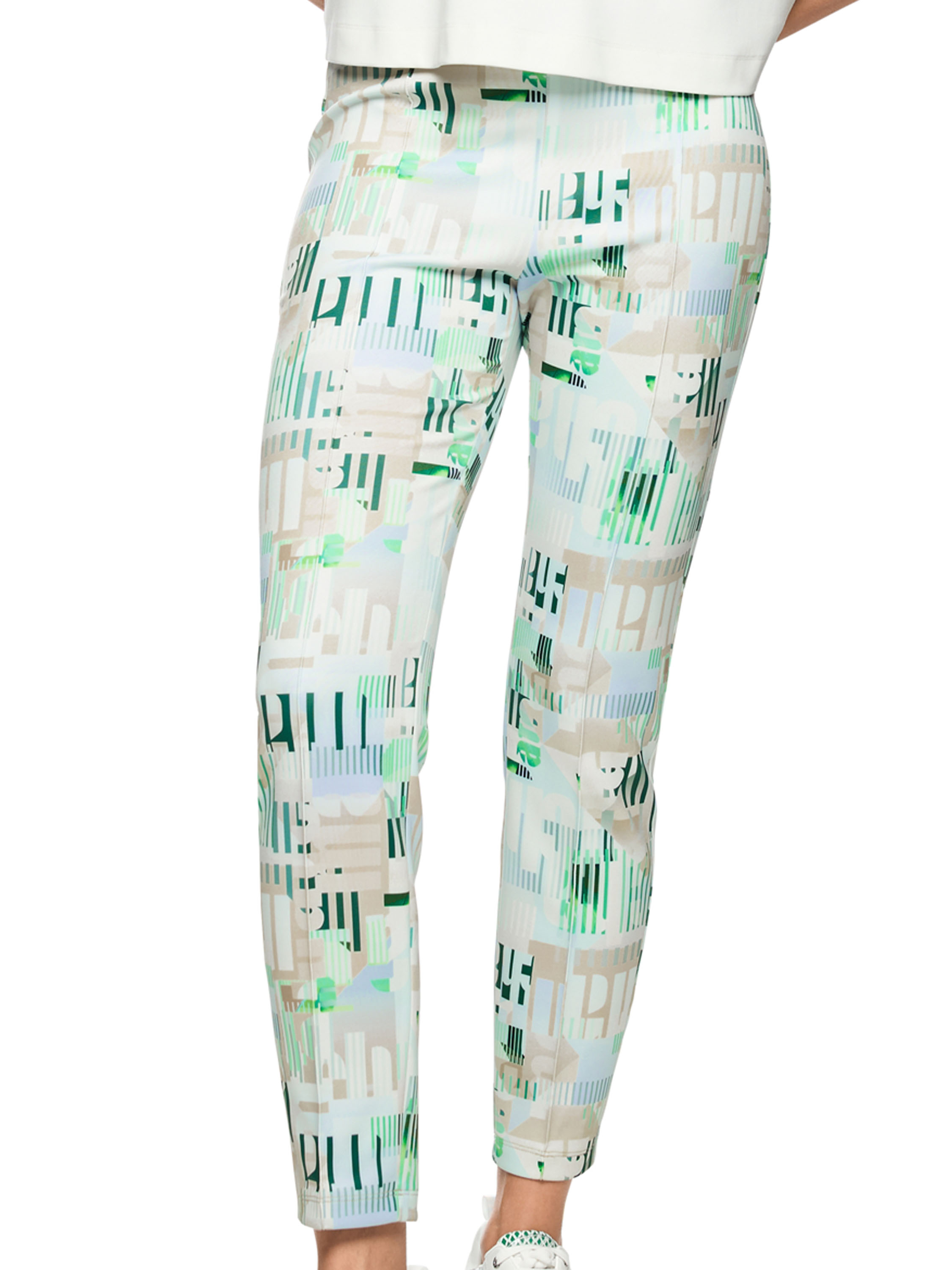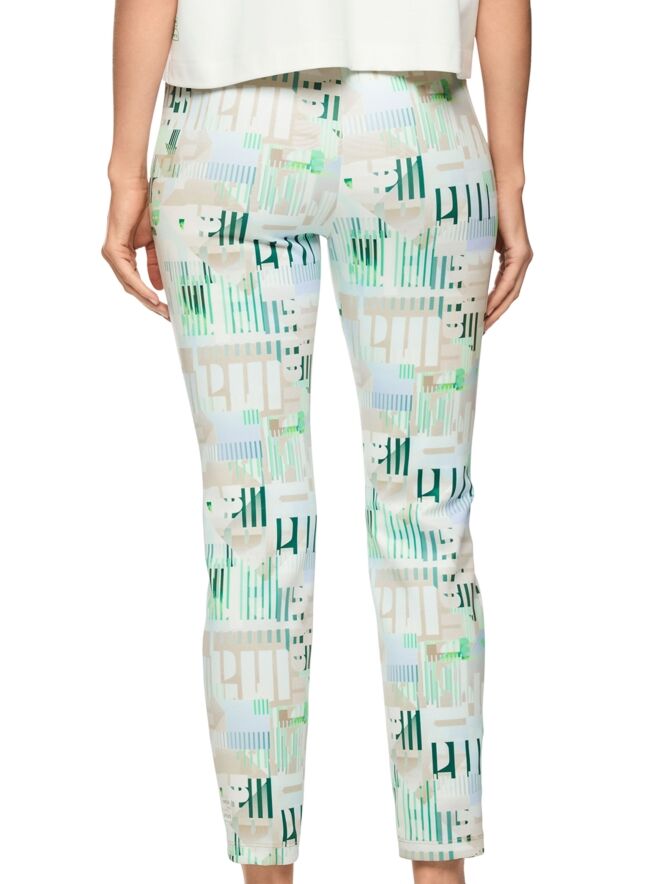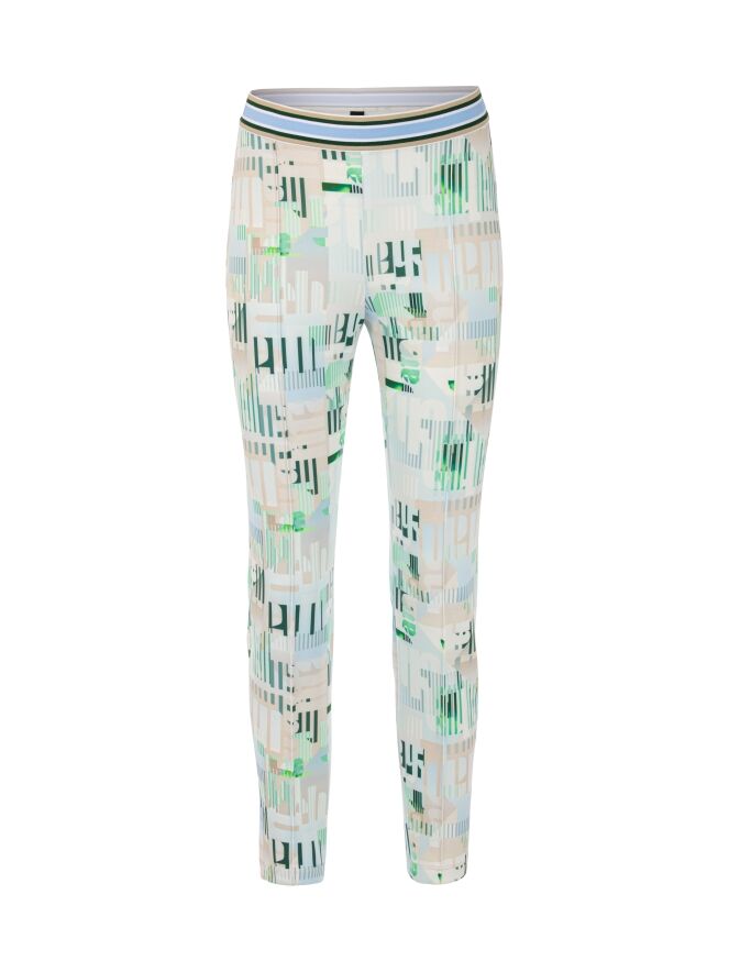 Een broek van Marc Cain in een scuba kwaliteit met een grafische print van letters en streepjes in de kleuren bleu, zand en groen op een roomwitte achtergrond. In de taille zit een elastische band met een streeppatroon in de kleuren bleu, zand, wit en donkergroen. Deze broek kan op 30 graden worden gewassen.