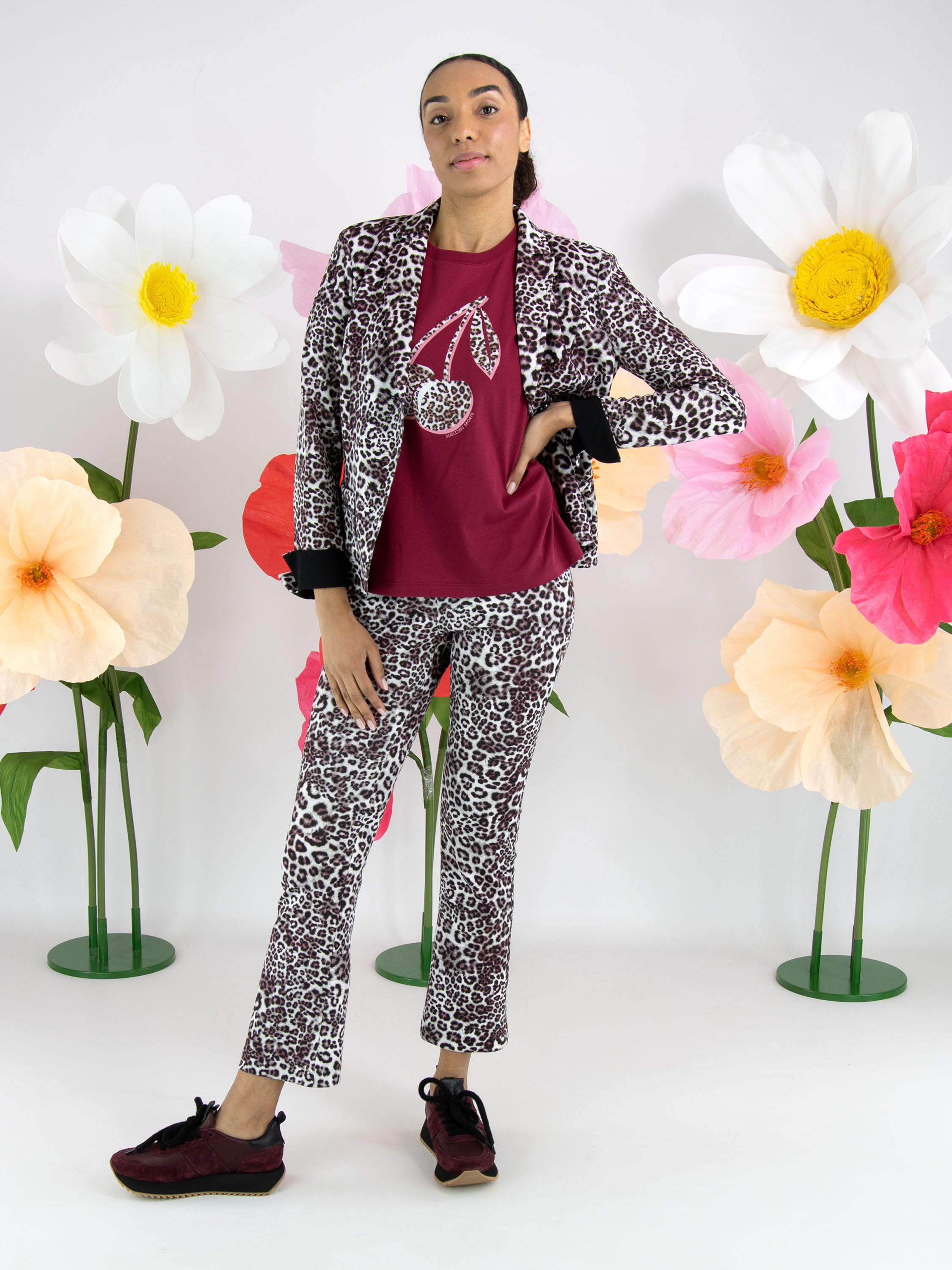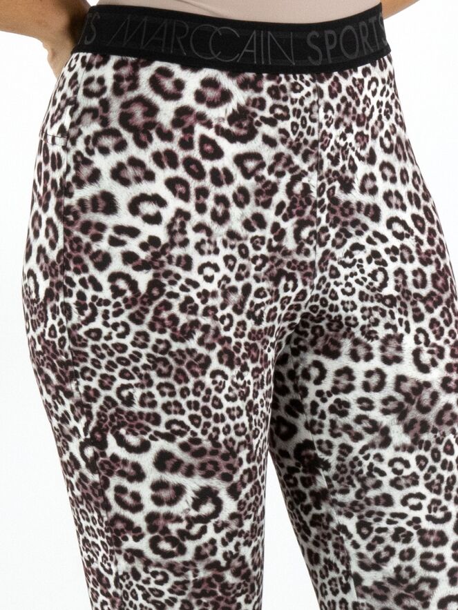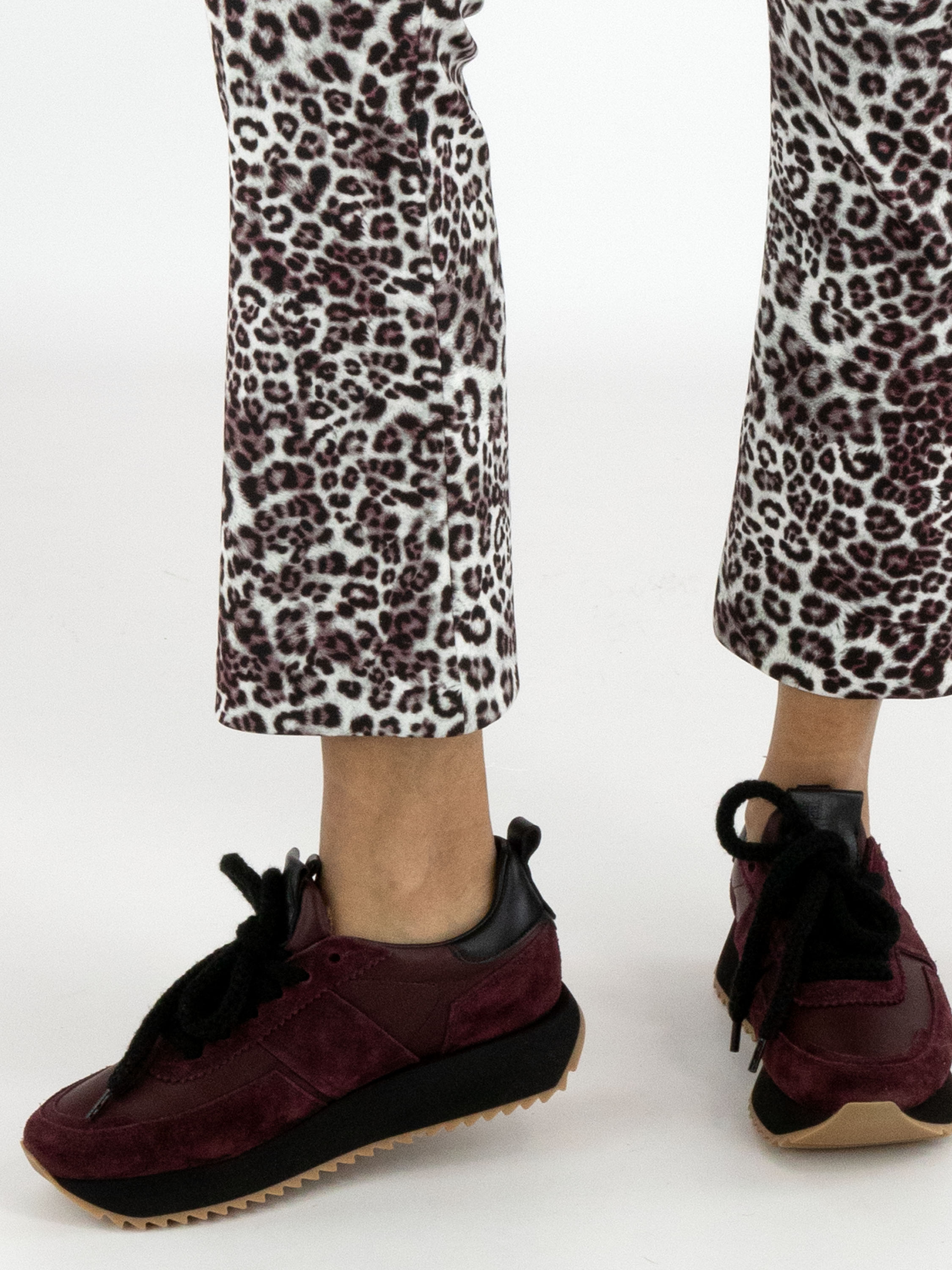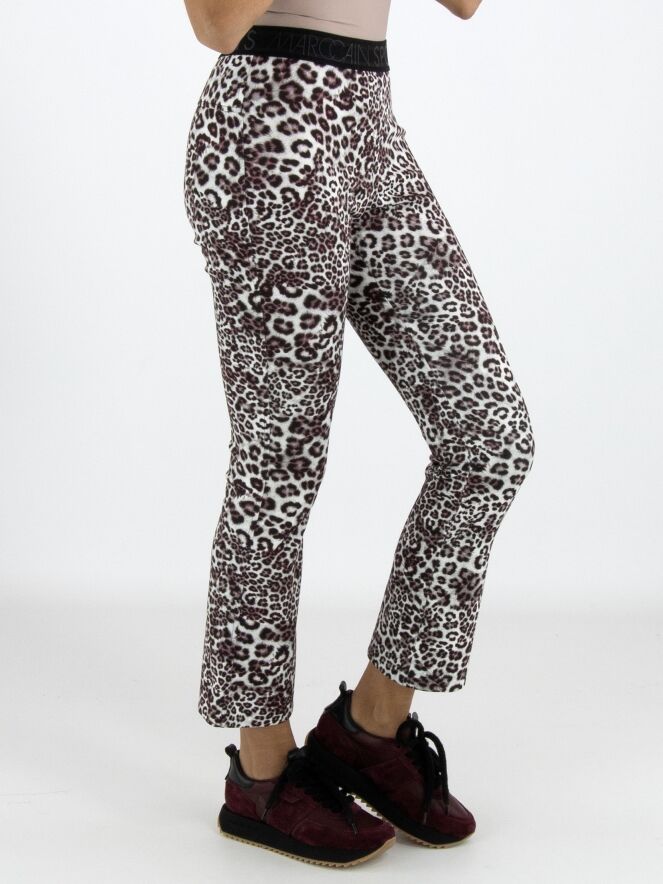 Een flared broek in een scuba kwaliteit van Marc Cain in een panterprint met meerdere tinten grijs, bordeauxrood en wit. In de taille is een zwarte elastieken band. Deze broek mag op 30 graden worden gewassen.