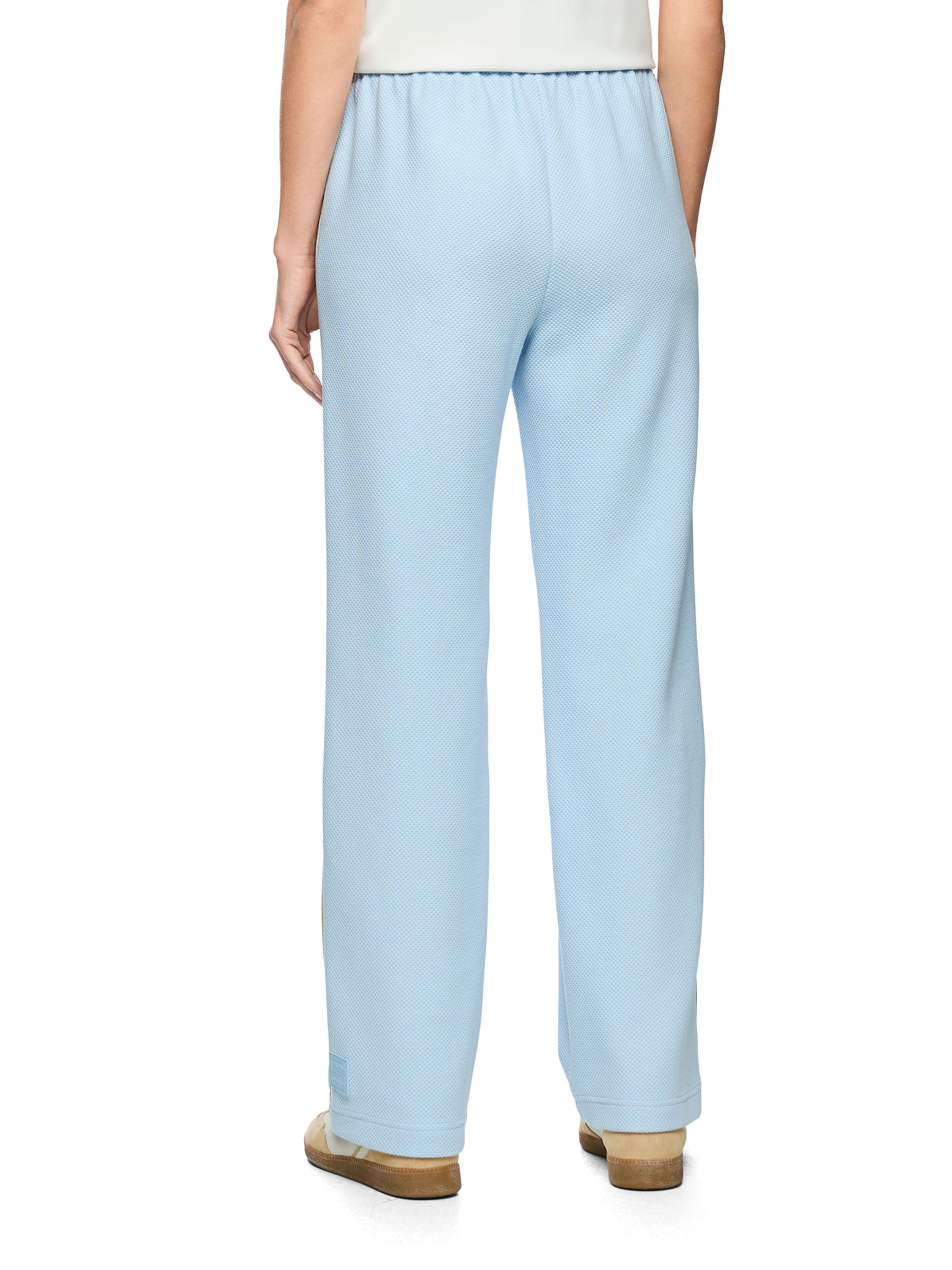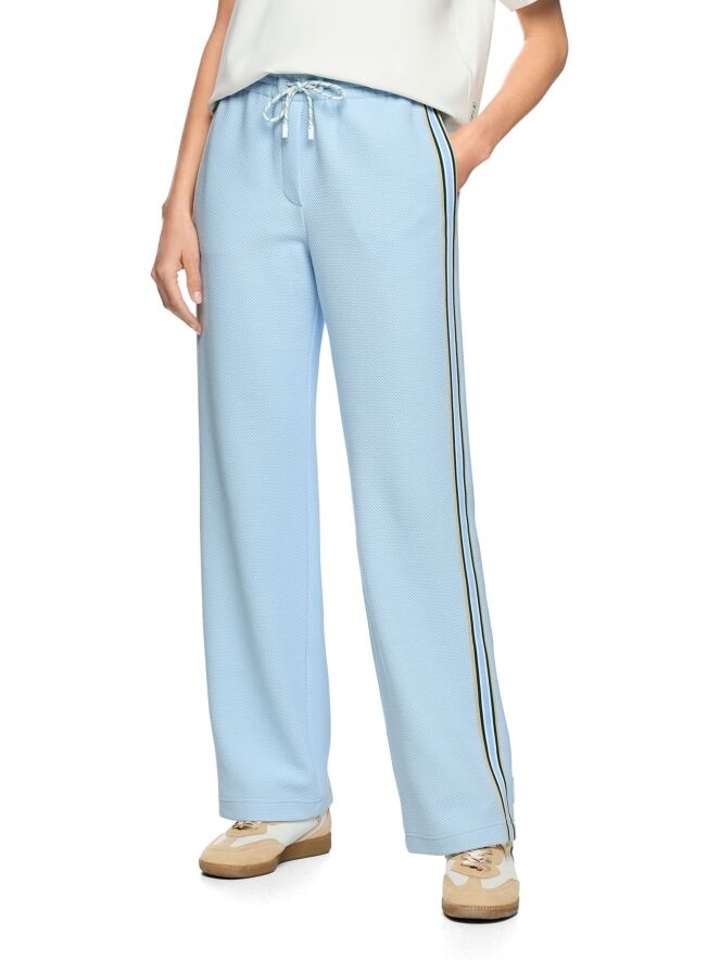 Een joggingbroek van Marc Cain in een korrelstructuur in de kleur bleu. De broek heeft een geplooide elastische tailleband met een koord in tunnelverwerking. Langs de zijkanten loopt een brede bies met een streeppatroon in de kleuren zand, groen en twee tinten lichtblauw. De broek heeft steekzakken en kan op 30 graden worden gewassen.
