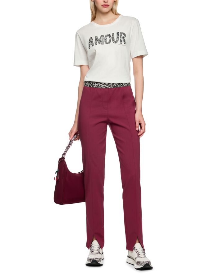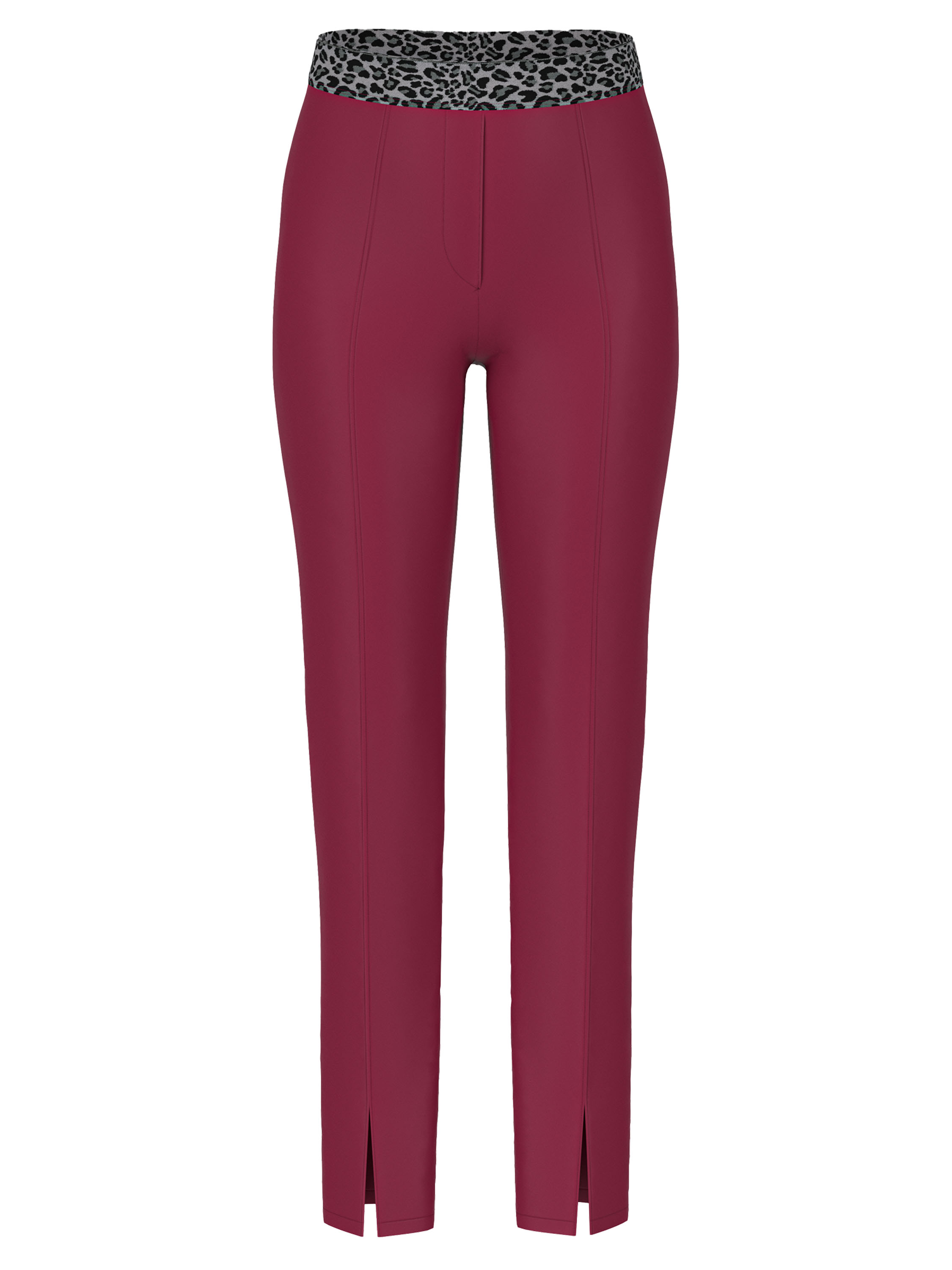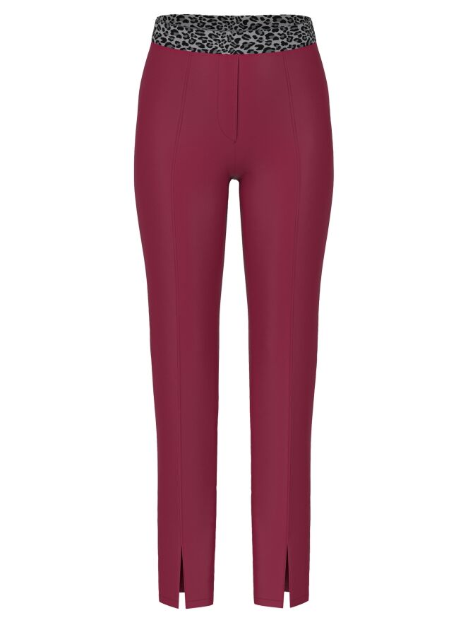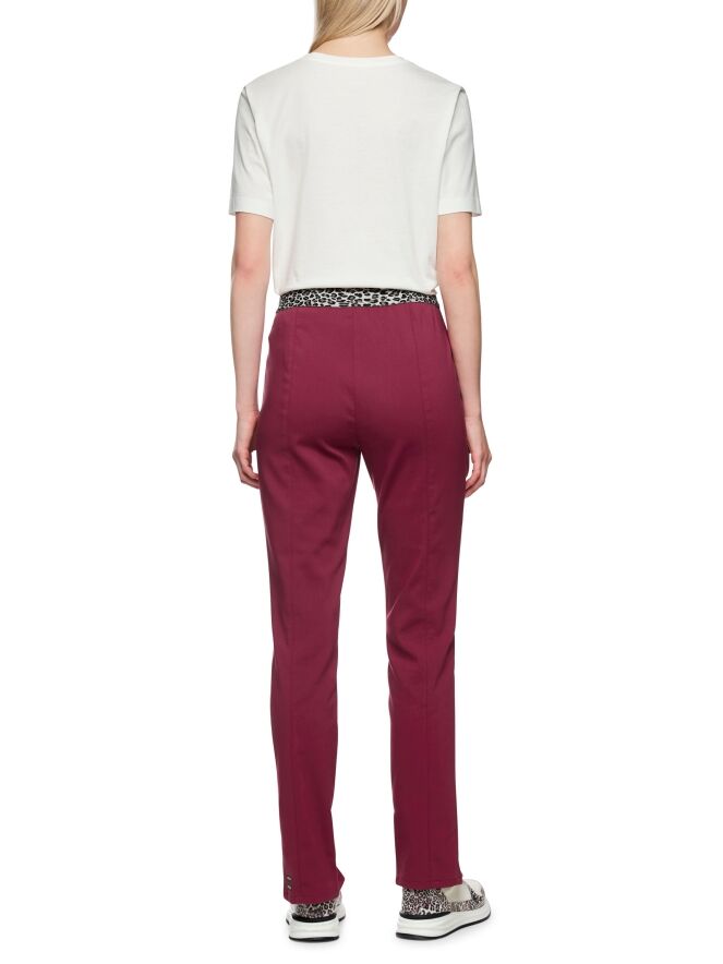 Een broek van Marc Cain in een bordeauxrode uni kleur. In de taille is een elastieken band in een panterprint met meerdere tinten grijs en zwart. In het midden van de pijpen is een stiknaad. Aan de onderkant is aan de buitenzijde een splitje. Deze broek mag op 30 graden worden gewassen.
