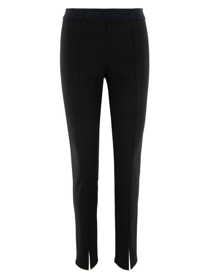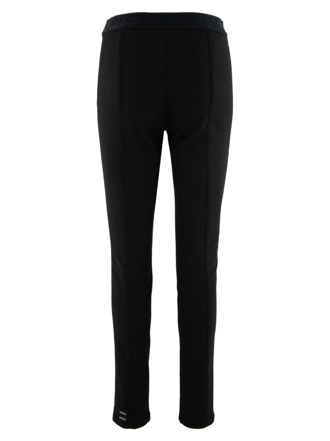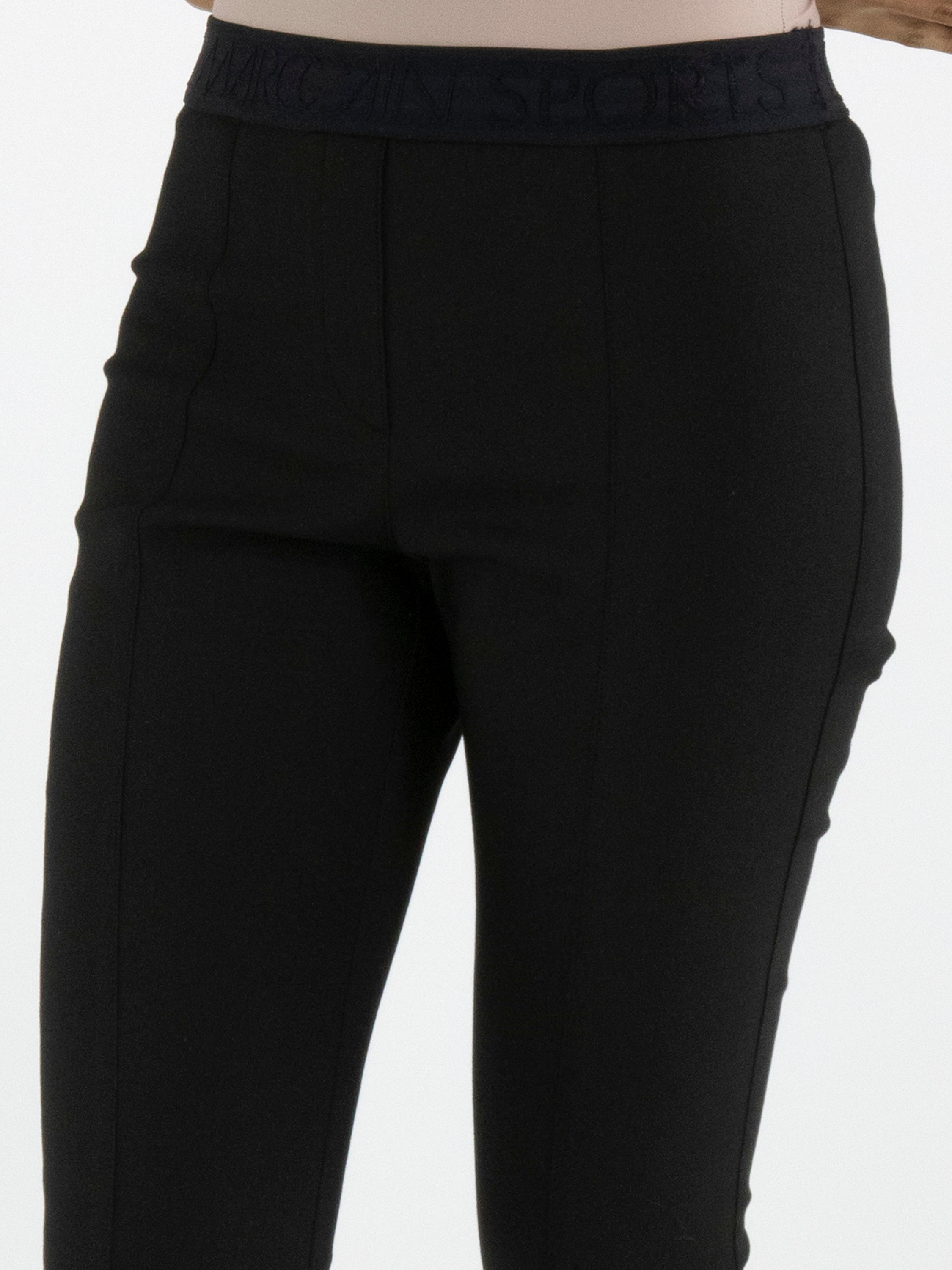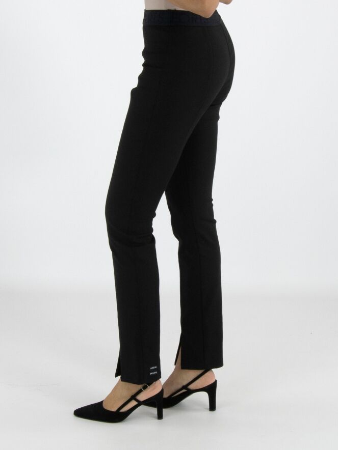Een broek van Marc Cain in de kleur zwart. In de taille is een brede elastieken band. In het midden van de pijpen is een stiknaad. Deze broek mag op 30 graden worden gewassen.