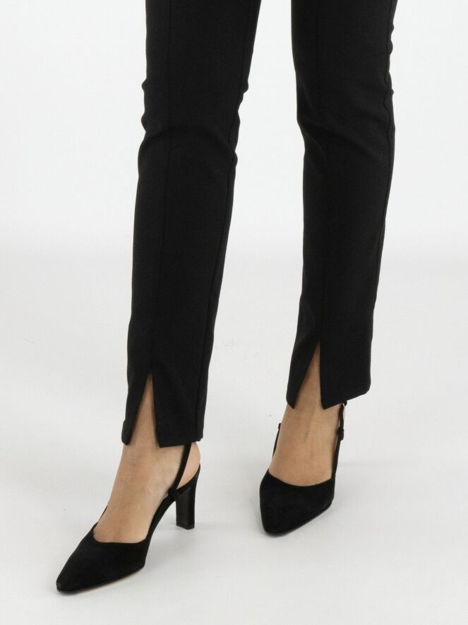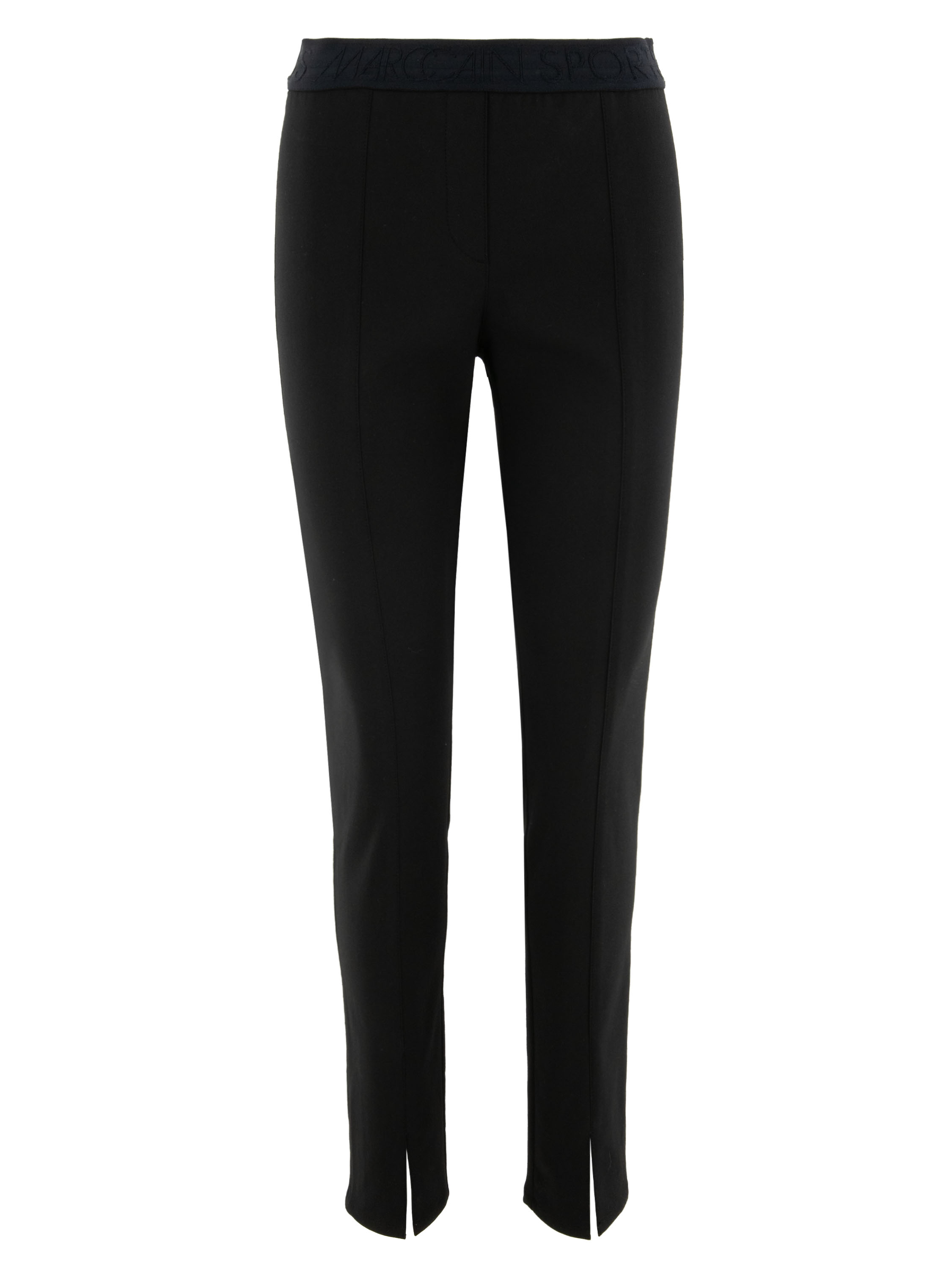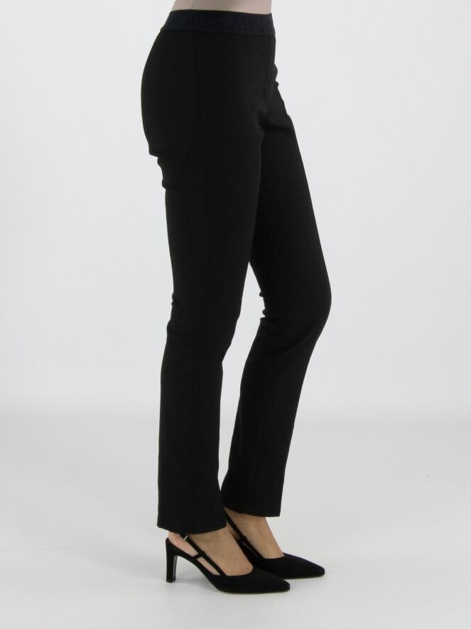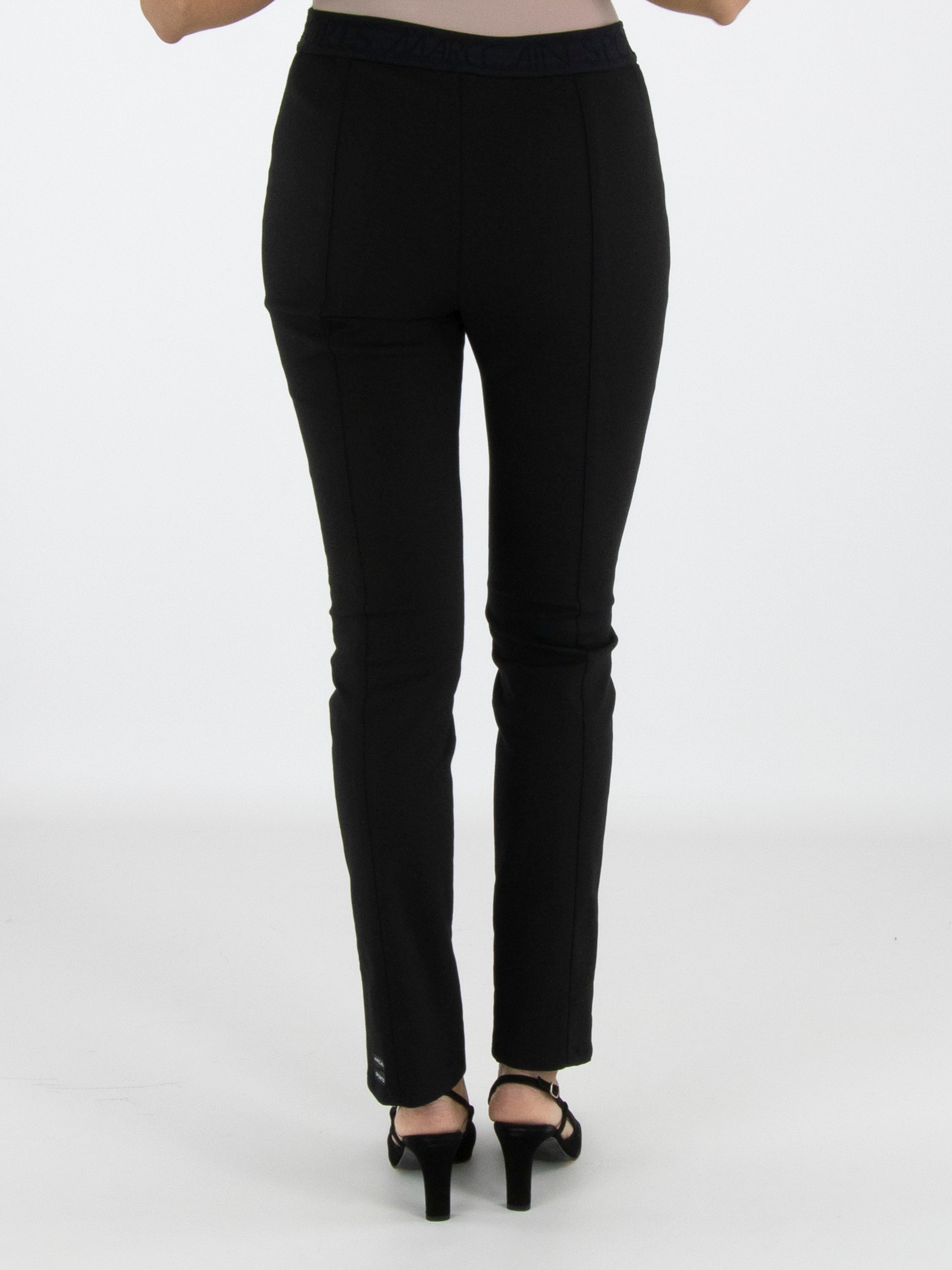 Een broek van Marc Cain in de kleur zwart. In de taille is een brede elastieken band. In het midden van de pijpen is een stiknaad. Deze broek mag op 30 graden worden gewassen.