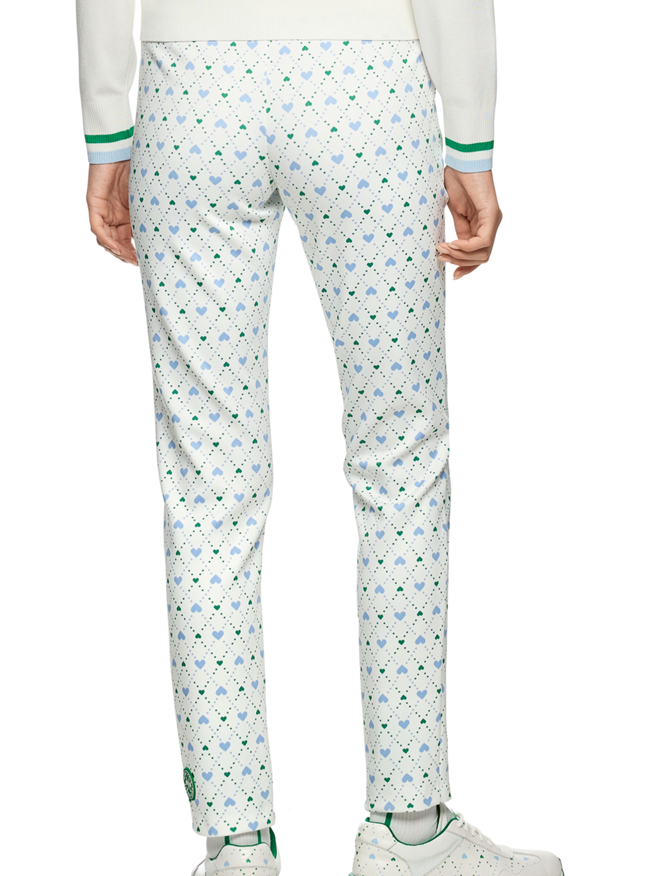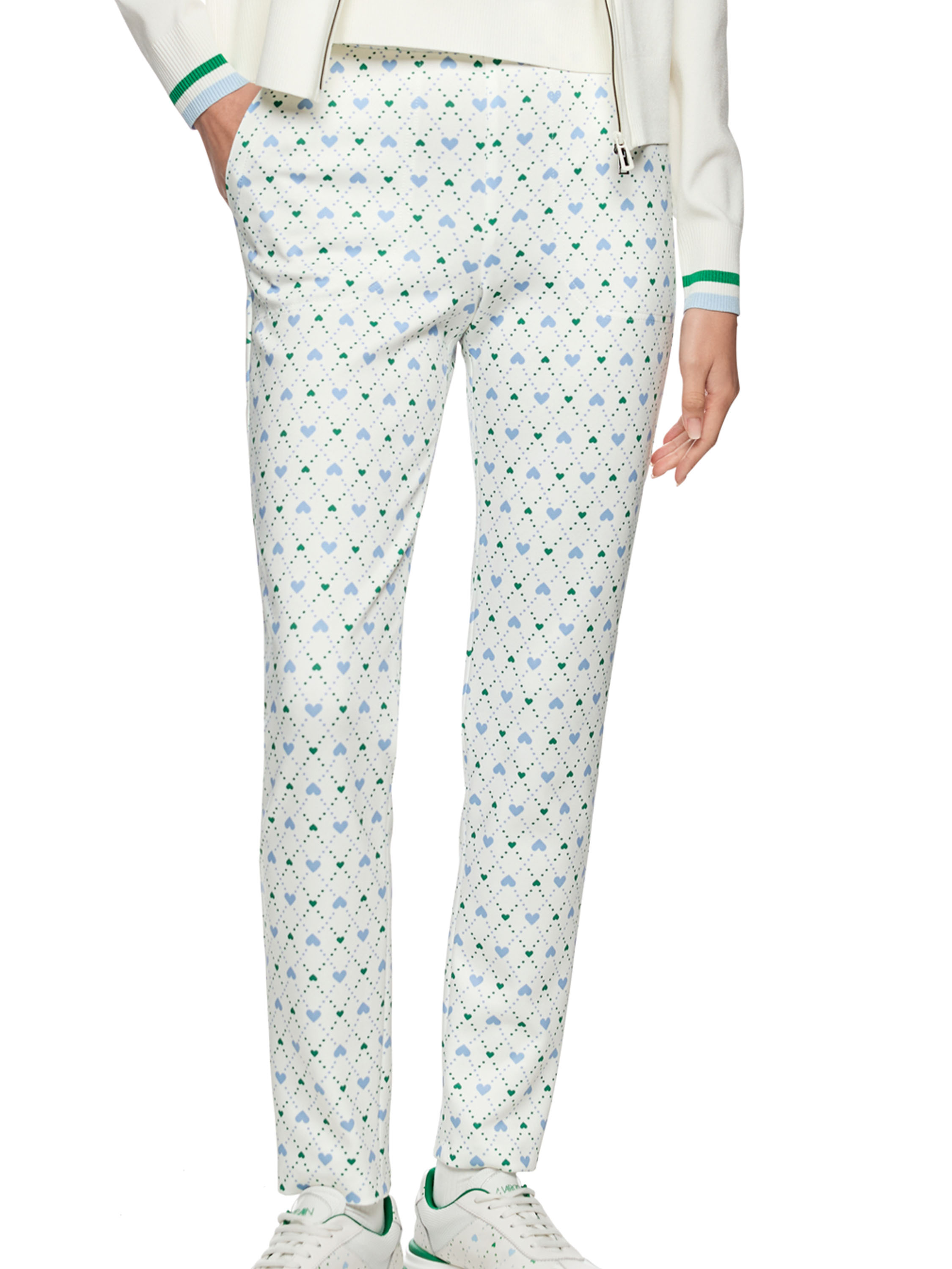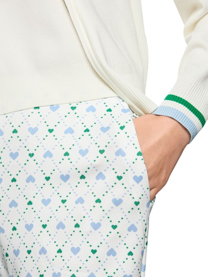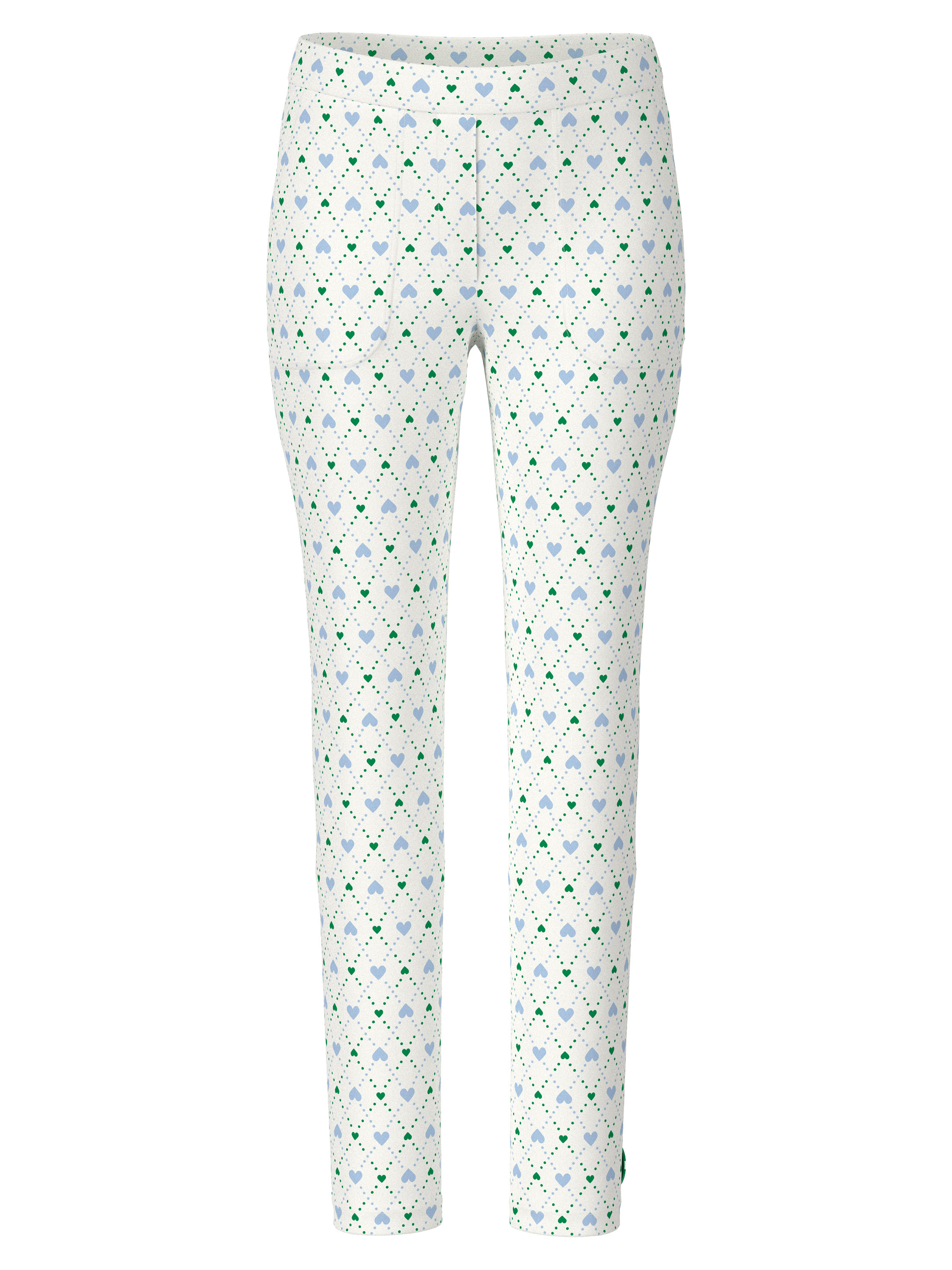 Een broek van Marc Cain in een scuba kwaliteit met een geruite print met stipjes en hartjes in de kleuren bleu en donkergroen op een roomwitte achtergrond. De broek heeft steekzakken en een elastische tailleband. Deze broek kan op 30 graden worden gewassen.