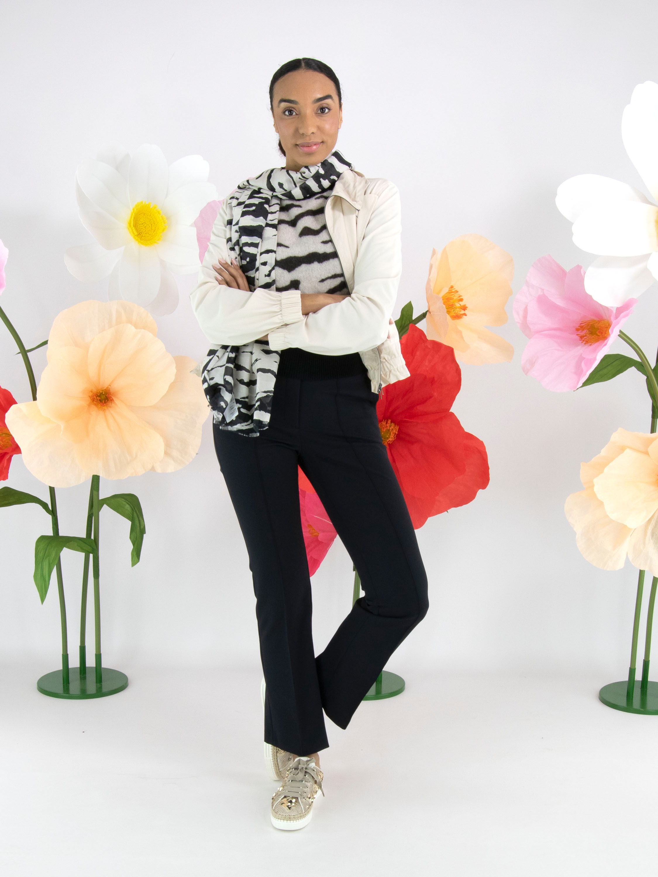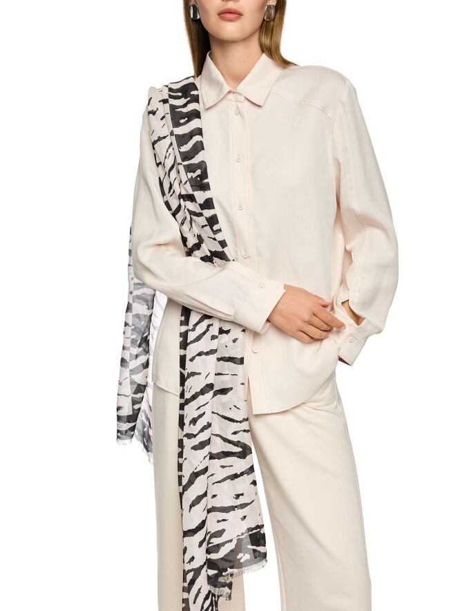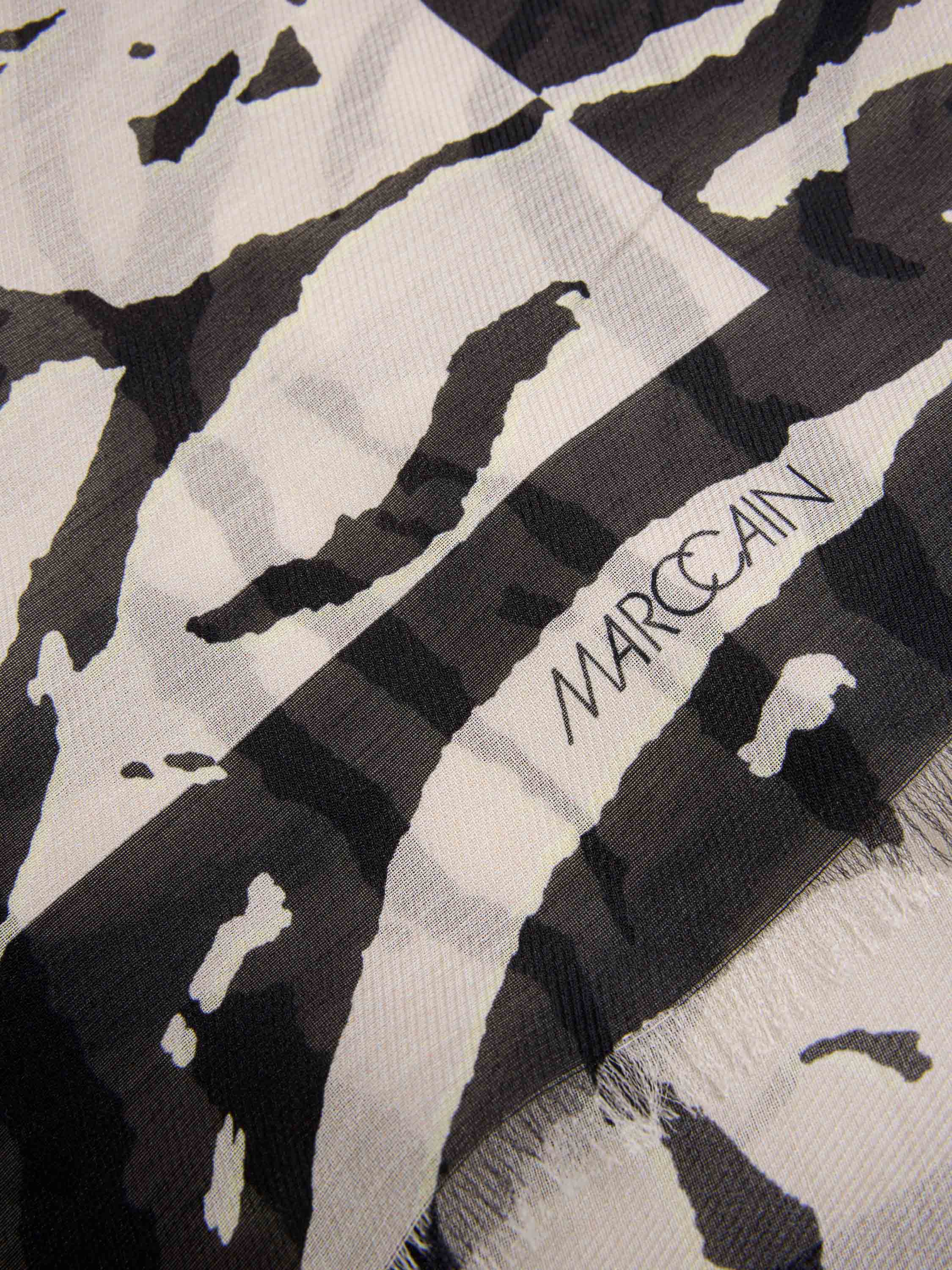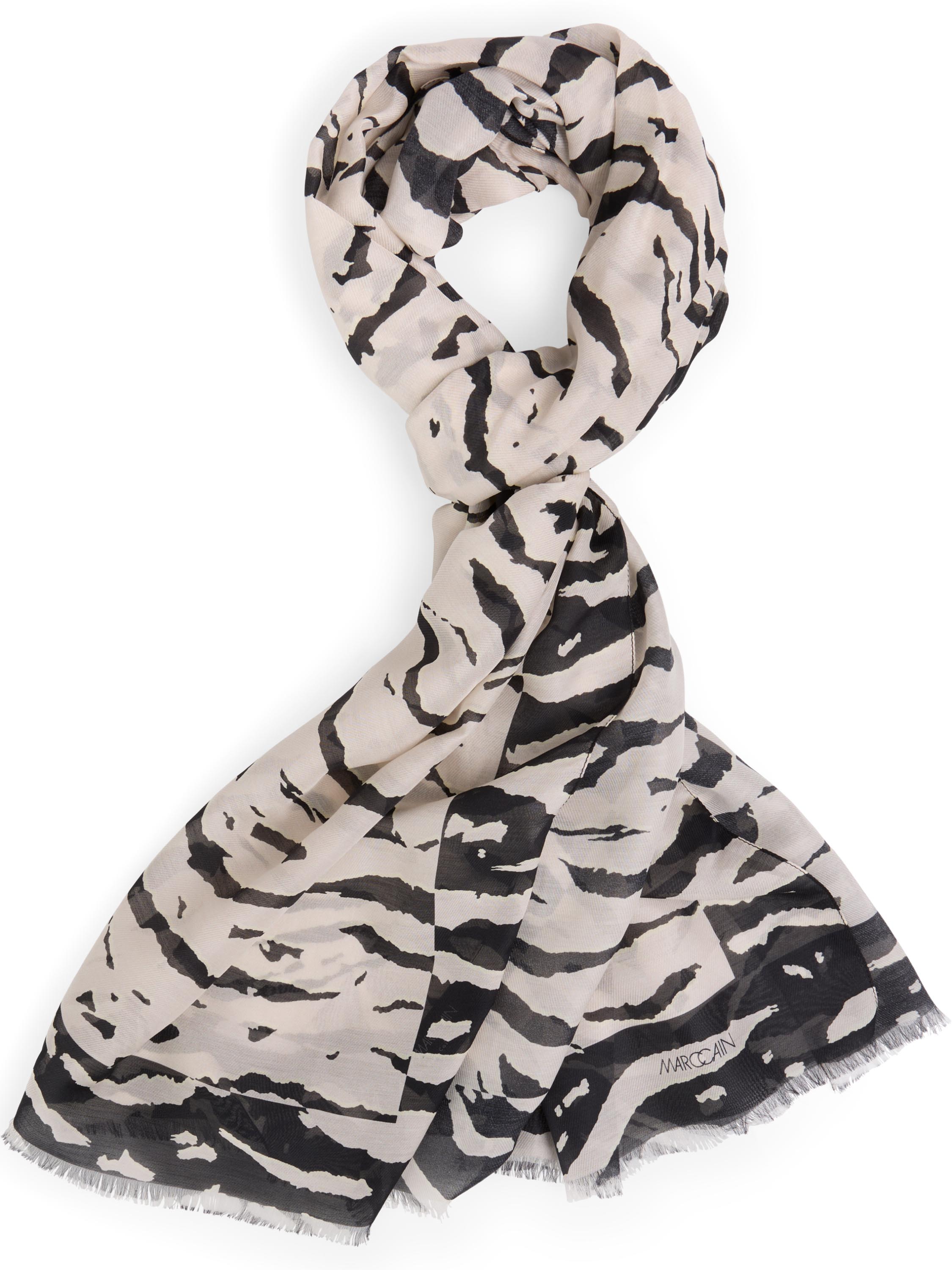 Een licht transparante shawl van Marc Cain in een zebraprint met de kleuren zwart en beige. Langs de rand is een brede bies waar de print recto verso is. Aan de uiteinden van de shawl is de stof fijn gerafeld. Deze shawl mag op de hand worden gewassen.