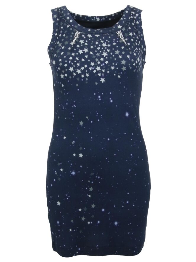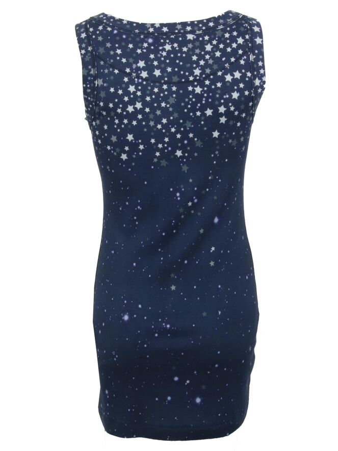 Een lange top van Marc Cain in een print van het universum met sterren in de kleur jeans blauw met meerdere tinten grijs. Deze top mag op 30 graden worden gewassen.