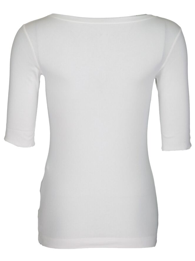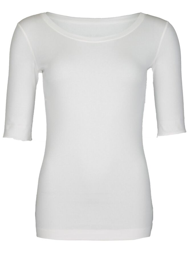 Een shirt van het merk Marc Cain Essentiels in de kleur off white. Het shirt heeft een ronde hals met een bies van 2 cm breed. De stof van het shirt heeft een fijne ribbel structuur. De korte mouwen hebben een omslag van 3 cm breed. Het shirt mag op 30 graden worden gewassen.