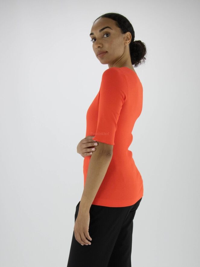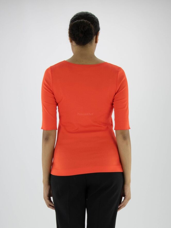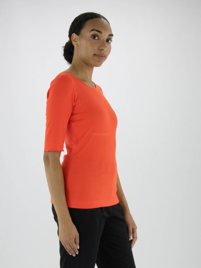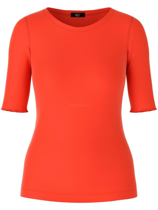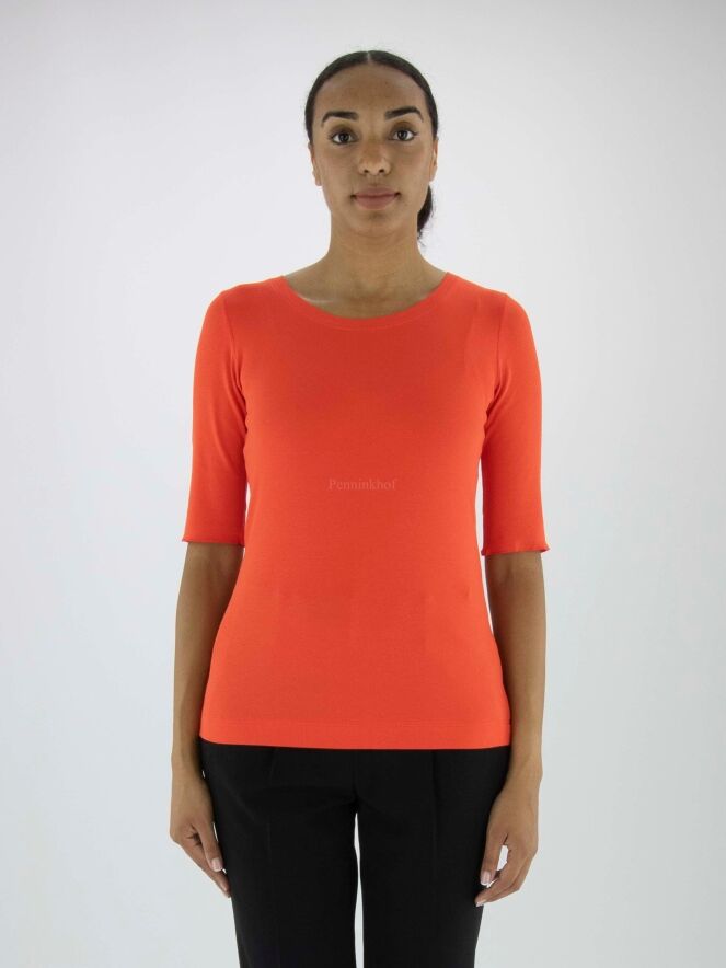 Een shirt van het merk Marc Cain in de kleur oranje. Het shirt heeft korte mouwen met een omslag en een ronde hals. Dit shirt mag op 30 graden worden gewassen.