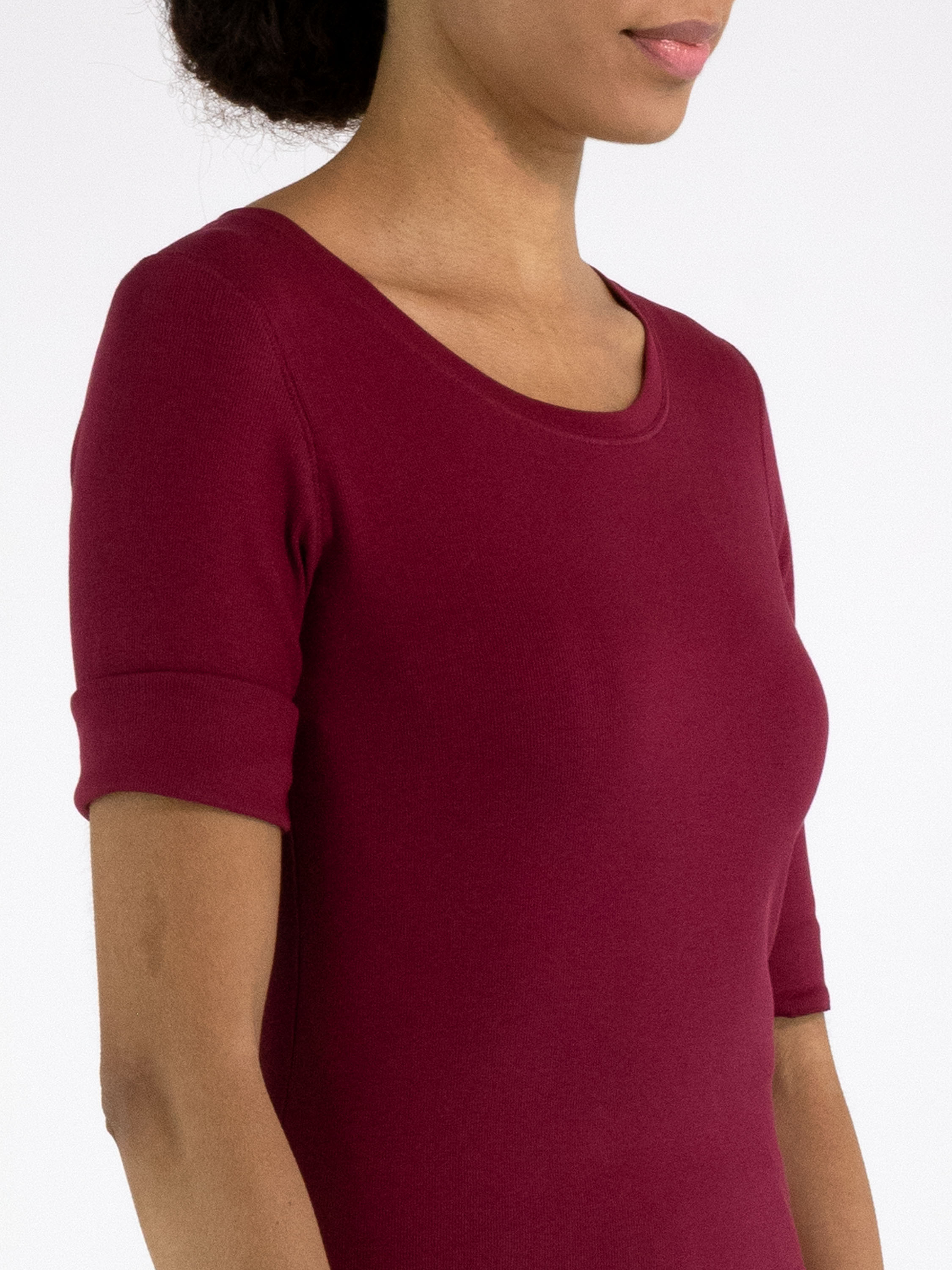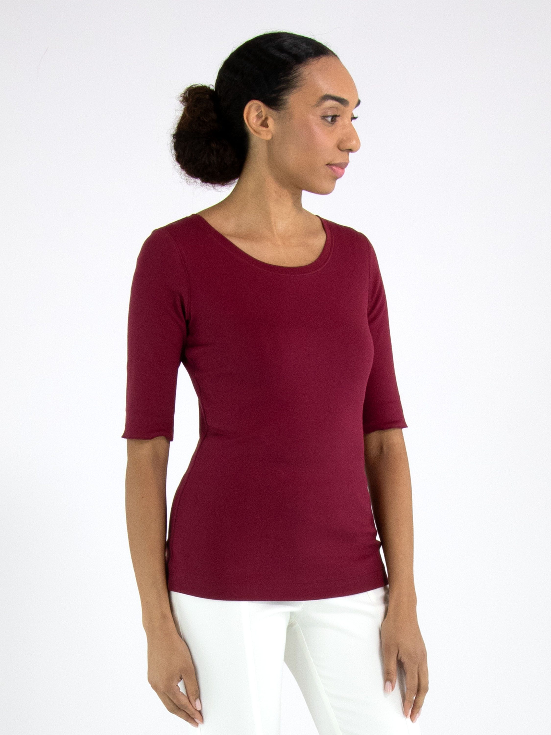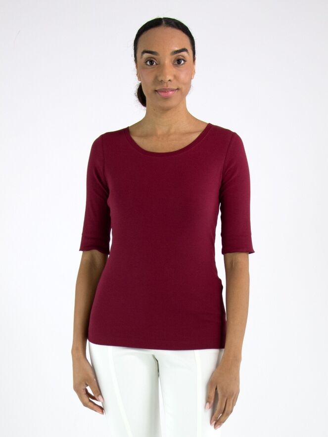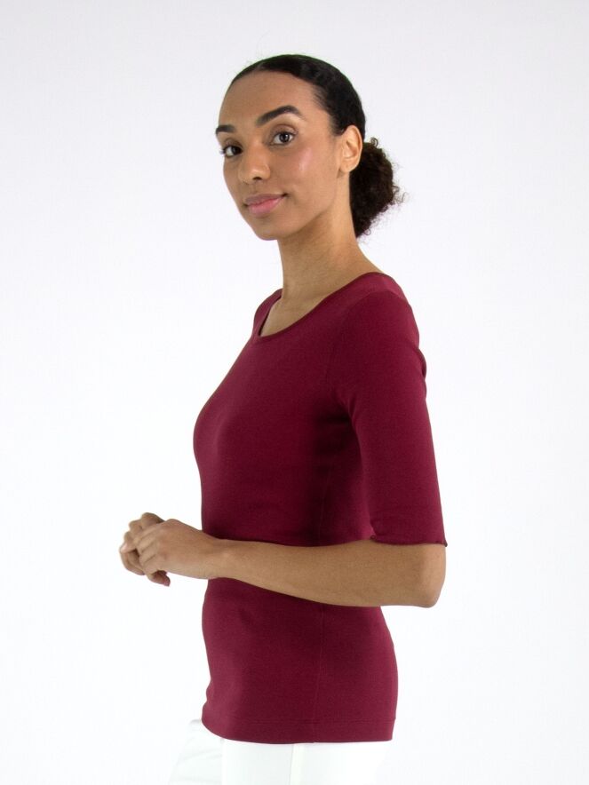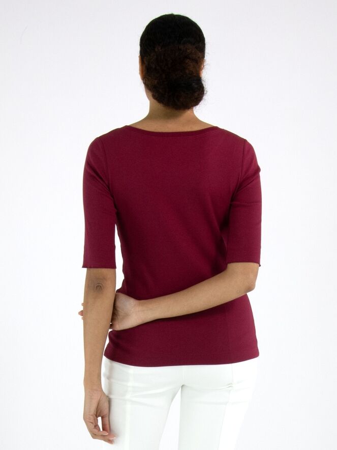 Een shirt van Marc Cain in een fijn geribbelde stof in een bordeauxrode kleur. Het shirt heeft een ronde hals en korte mouwen met een omslag. Dit shirt mag op 30 graden worden gewassen.
