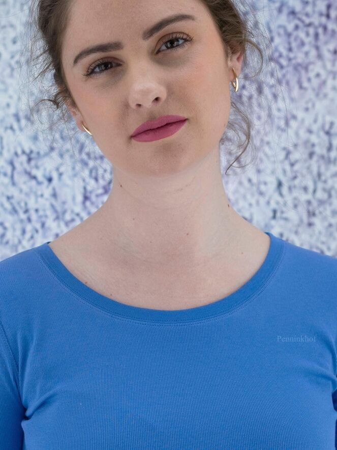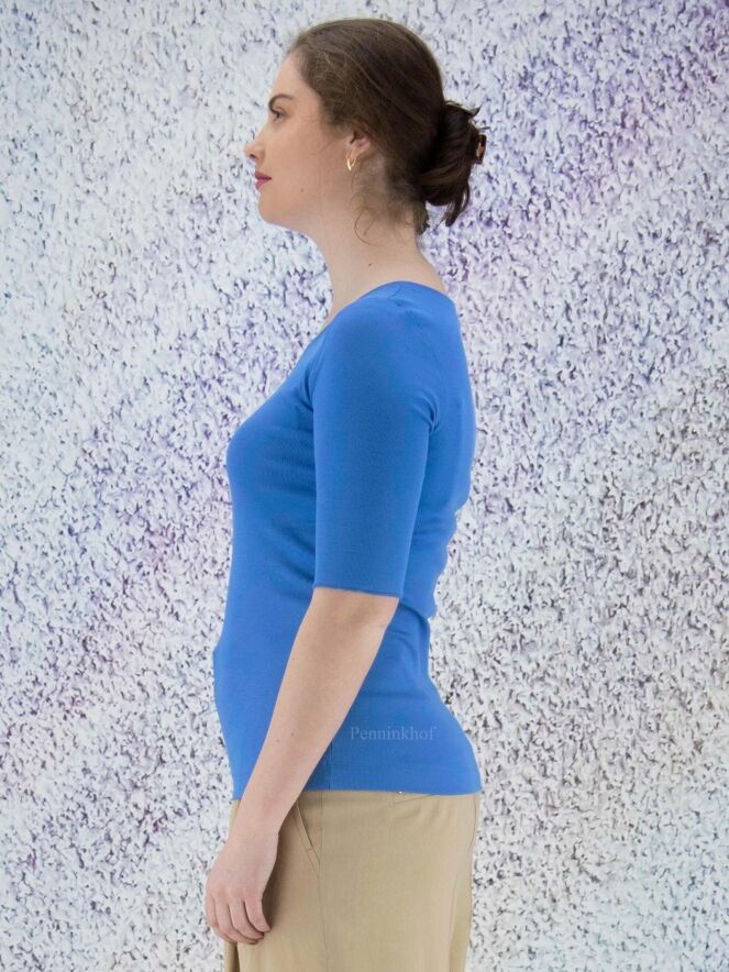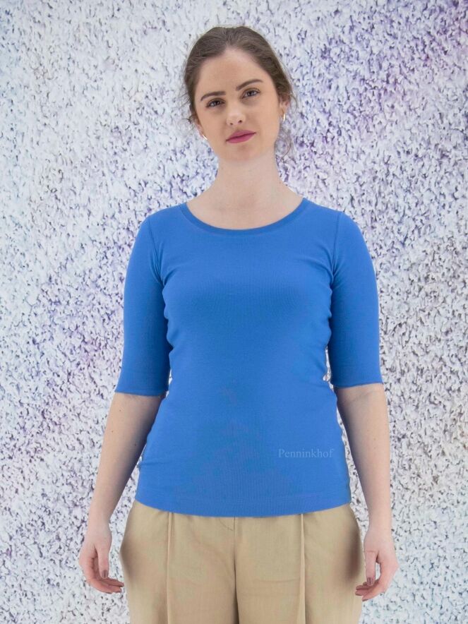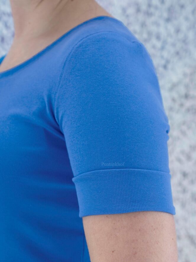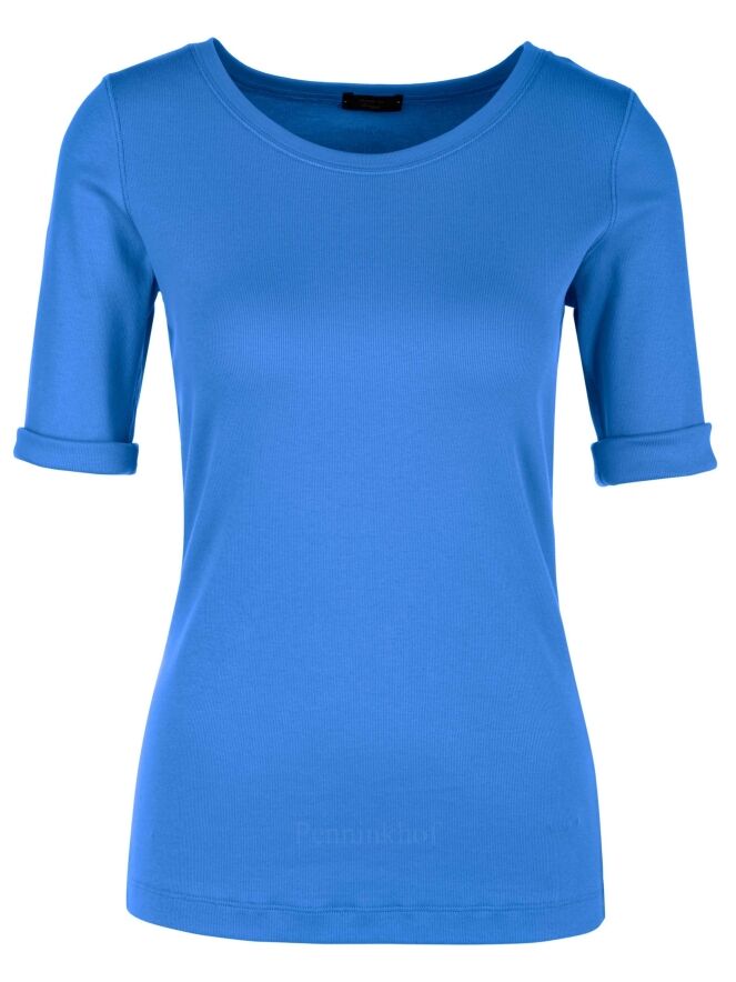 Een shirt van Marc Cain in de kleur blauw. Het shirt heeft een ronde hals en korte mouwen met een omslag. Dit shirt mag op 30 graden worden gewassen.