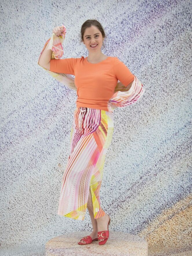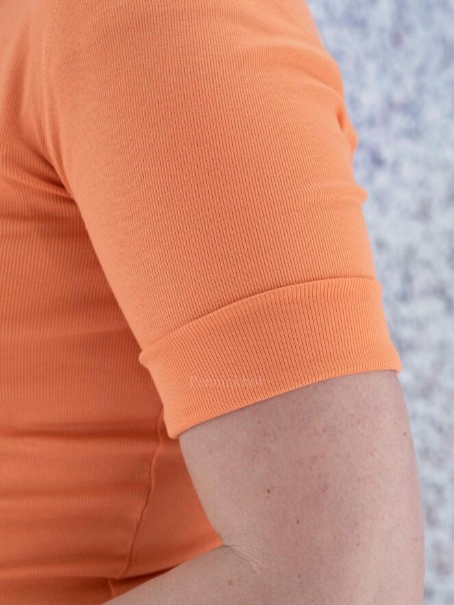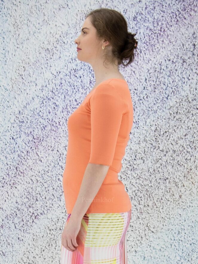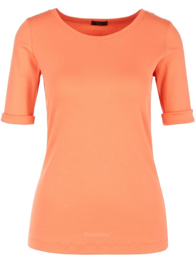 Een shirt van Marc Cain in de kleur oranje. Het shirt heeft een ronde hals en korte mouwen met een omslag. Dit shirt mag op 30 graden worden gewassen.