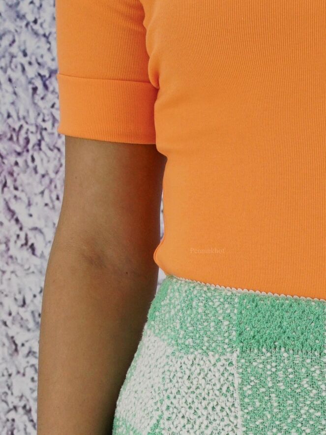 Een shirt van Marc Cain in de kleur oranje. Het shirt heeft een ronde hals en de korte mouwen hebben een omslag. Dit shirt mag op 30 graden worden gewassen.