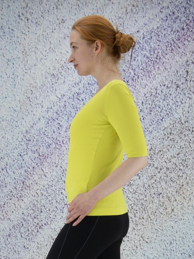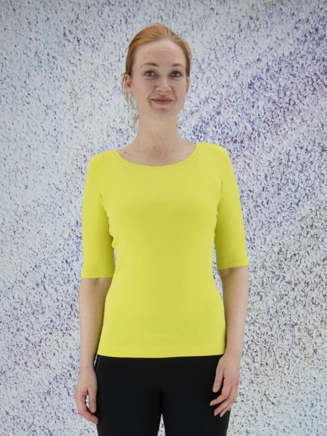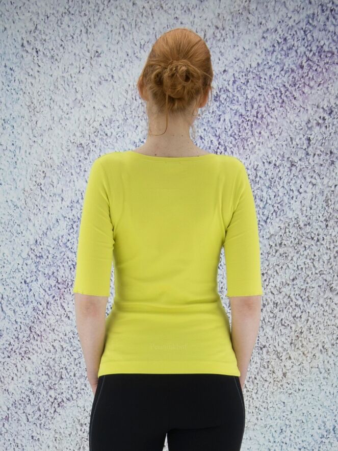 Een shirt van Marc Cain in een fijn geribbelde stof in de kleur limoengeel. Het shirt heeft een ronde hals en de korte mouwen hebben een omslag. Dit shirt mag op 30 graden worden gewassen.