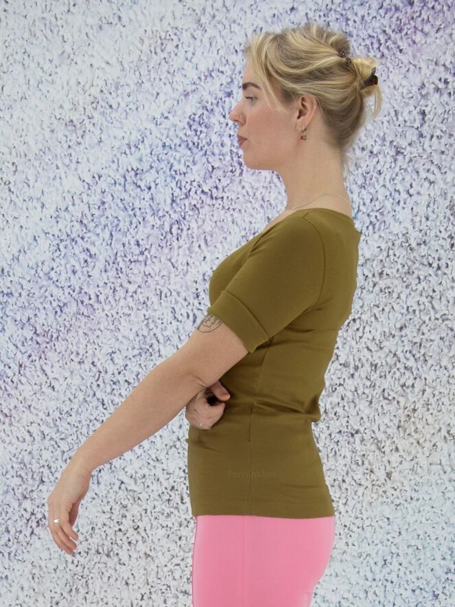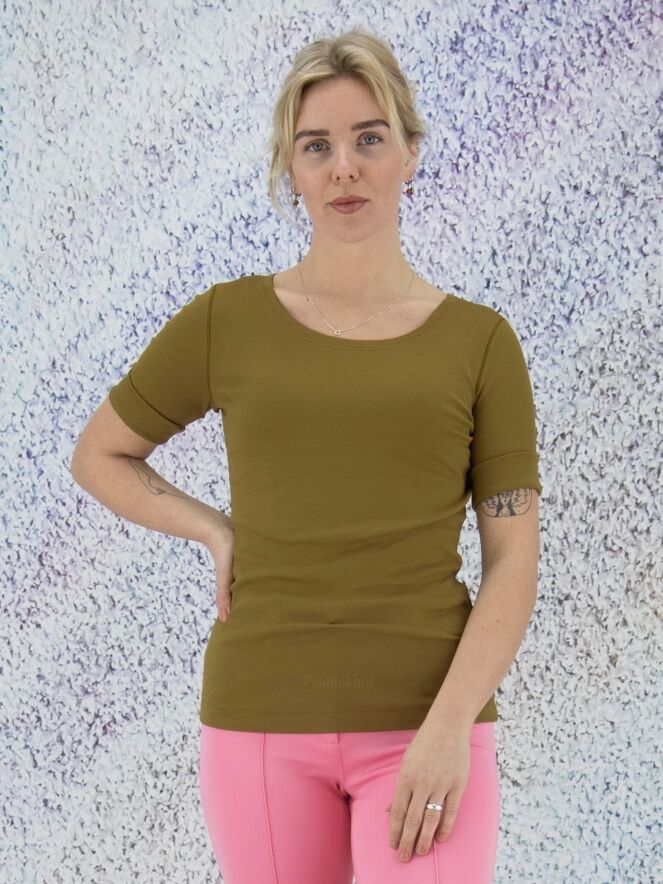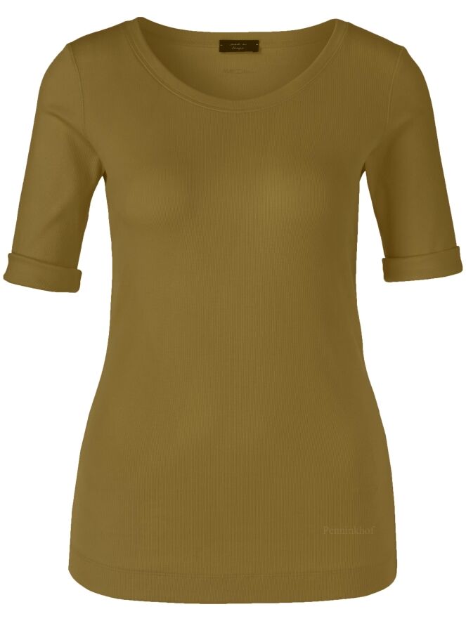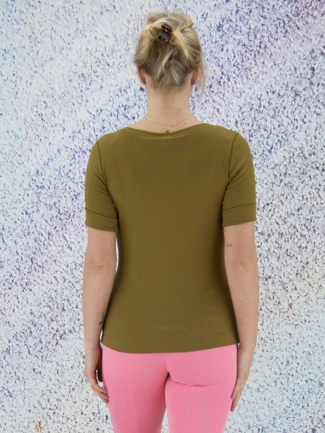 Een shirt van Marc Cain in de kleur olijfgroen. Het shirt heeft een turtle hals met een splitje aan de zijkant en halflange mouwen. Dit shirt mag op 30 graden worden gewassen.