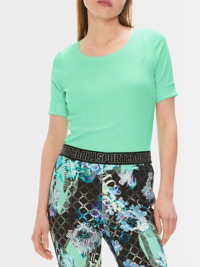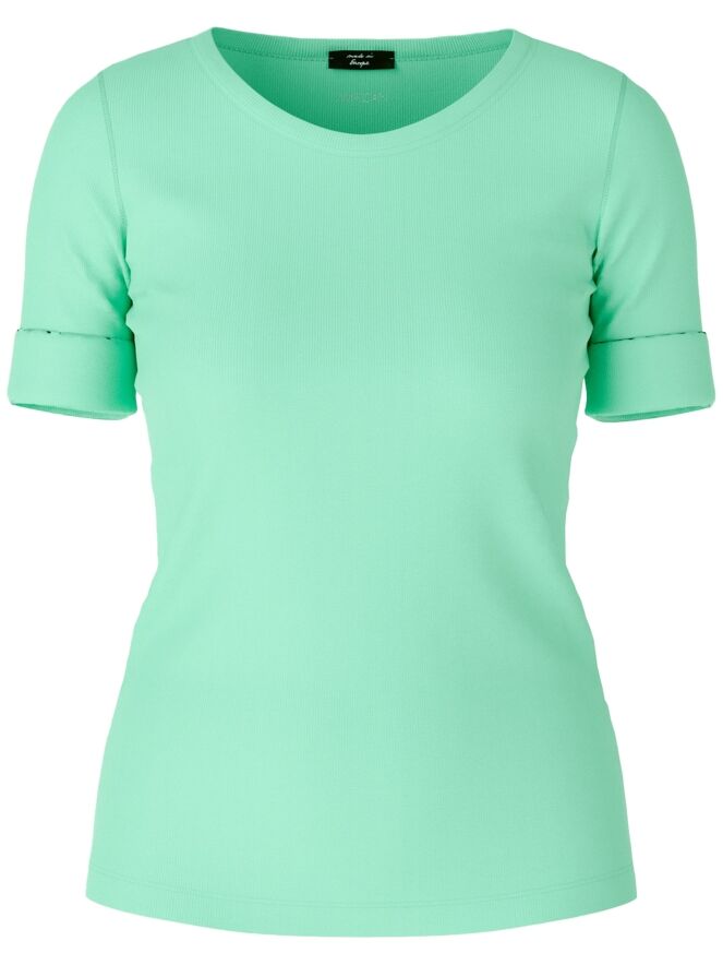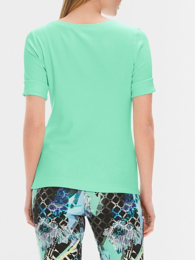 Een shirt van Marc Cain in lichte kleur lindegroen. De korte mouwen hebben een omslag. Het shirt heeft een ronde hals en mag op 30 graden worden gewassen.