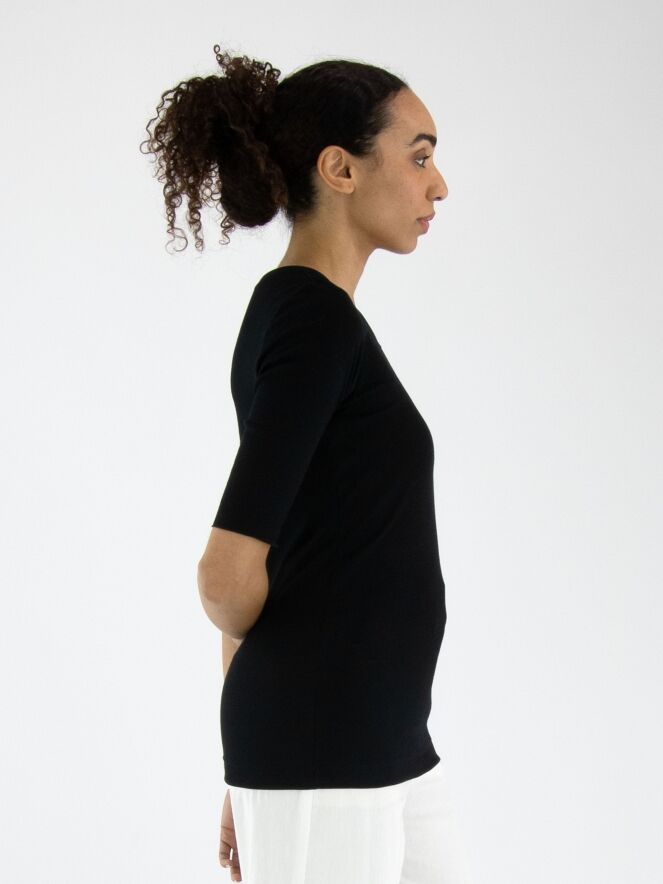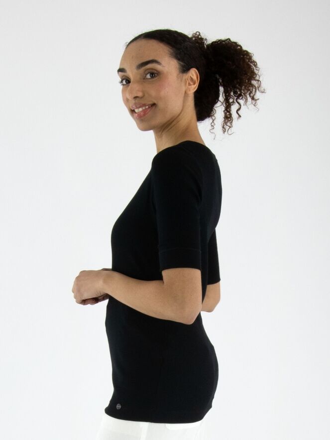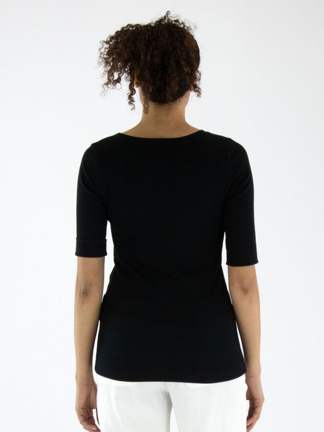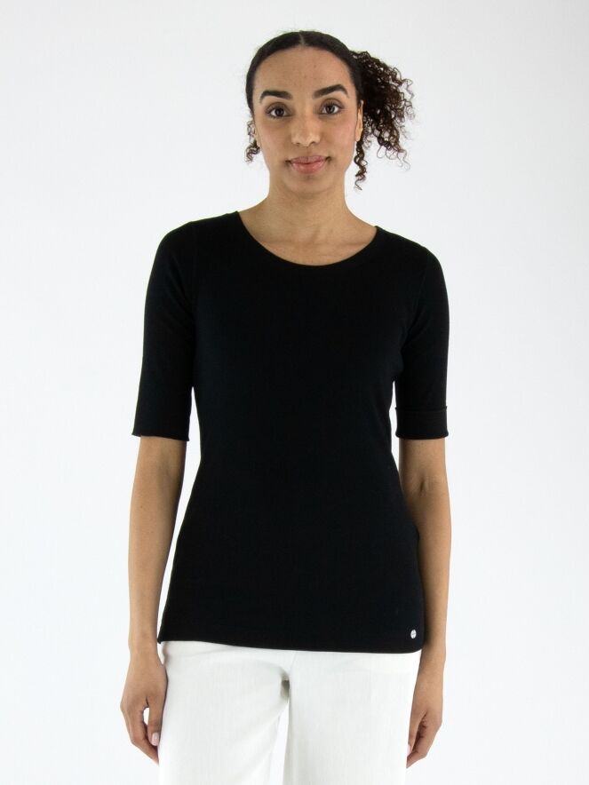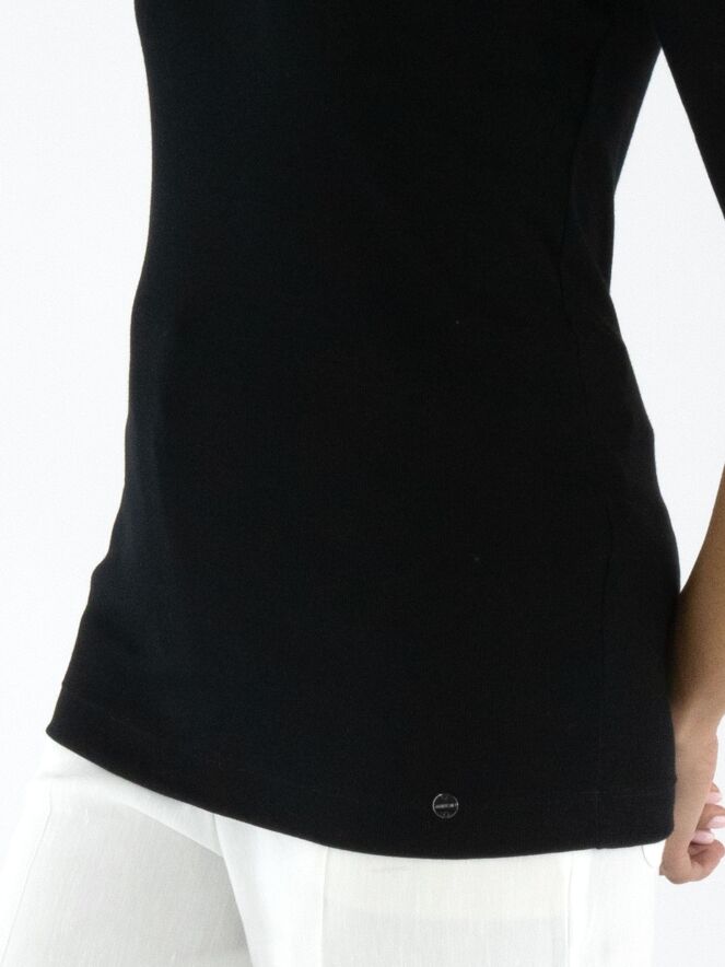 Een shirt van Marc Cain in de kleur zwart. De korte mouwen hebben een omslag. Het shirt heeft een ronde hals en kan op 30 graden worden gewassen.