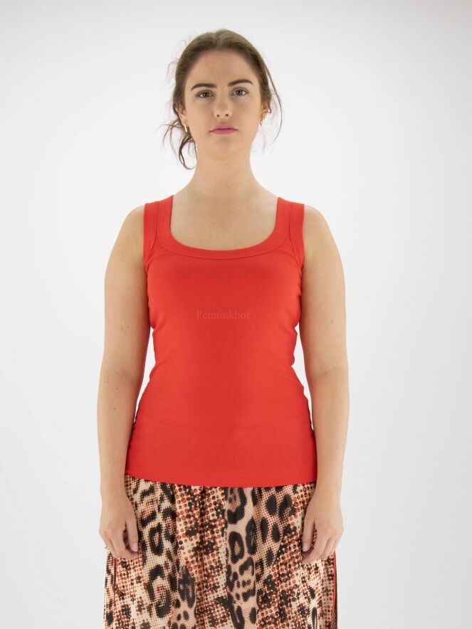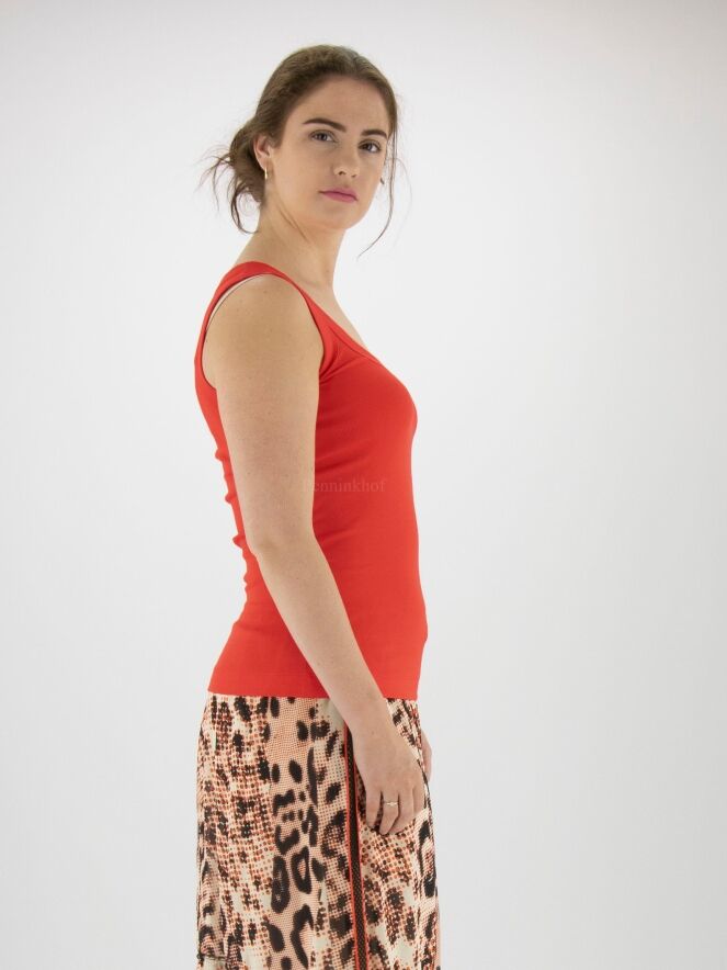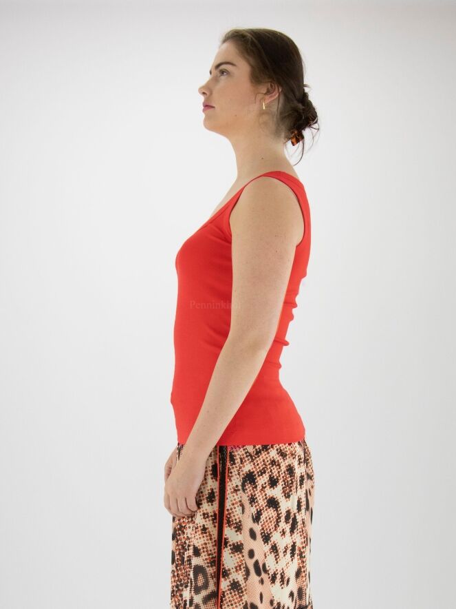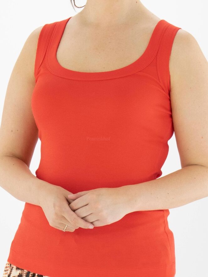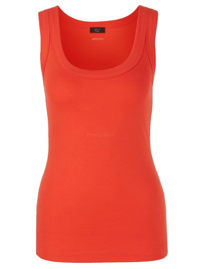 Een top van Marc Cain in de kleur rood. De top heeft een ronde hals en de stof is fijn geribbeld. Deze top mag op 30 graden worden gewassen.