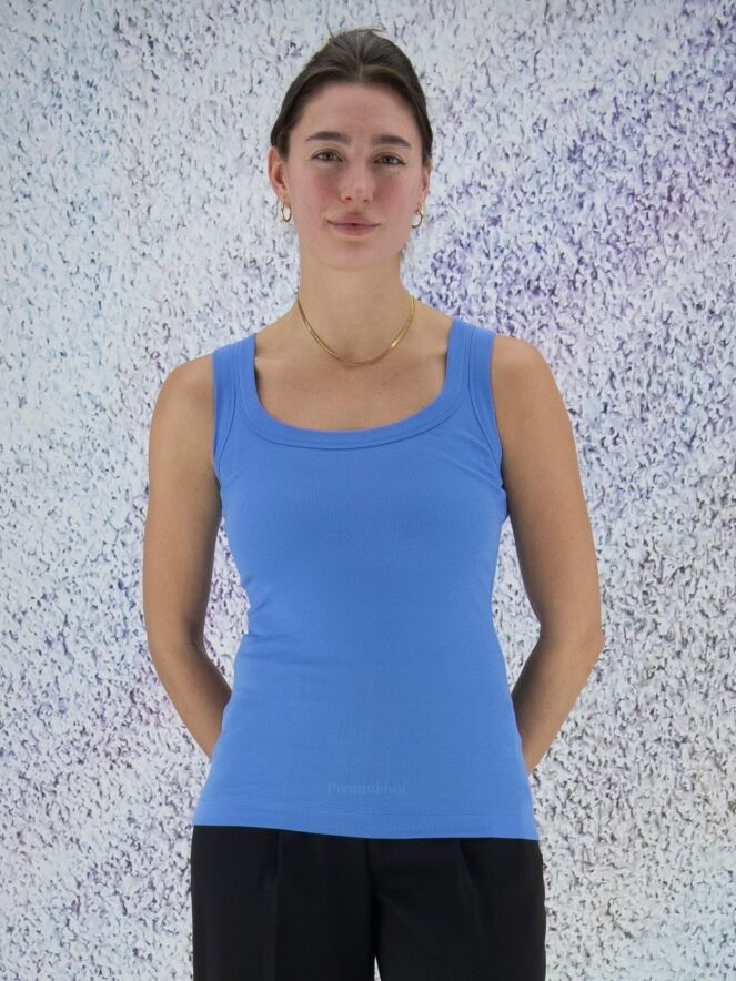 Een top van Marc Cain in een blauwe kleur. De top heeft een ronde hals en mag op 30 graden worden gewassen.