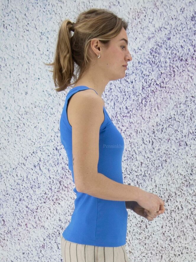 Een top van Marc Cain in een blauwe kleur. De top heeft een ronde hals en mag op 30 graden worden gewassen.