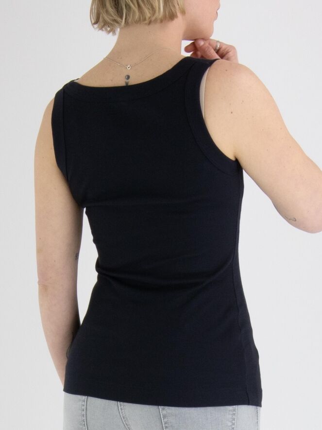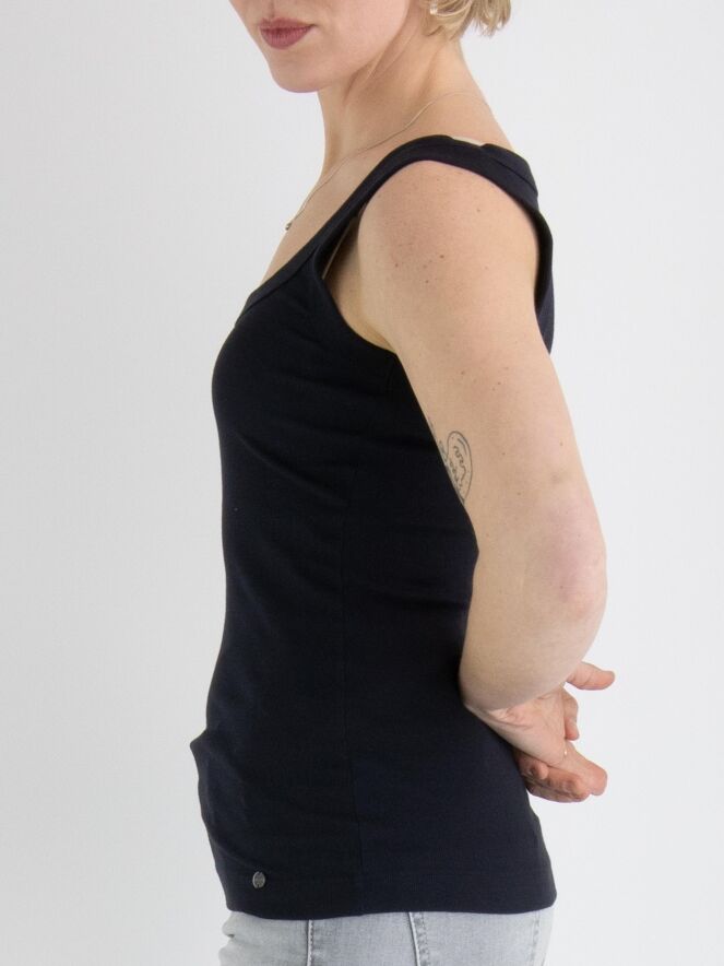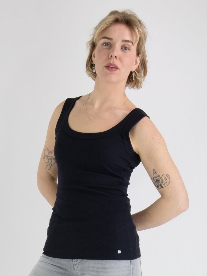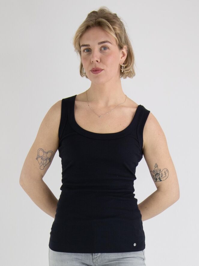 Een basis top van het merk Marc Cain essentiels in de kleur marine blauw. De top heeft een ronde hals en is licht getailleerd. De schouderbandjes zijn 3 cm breed. Deze top mag op 30 graden worden gewassen.